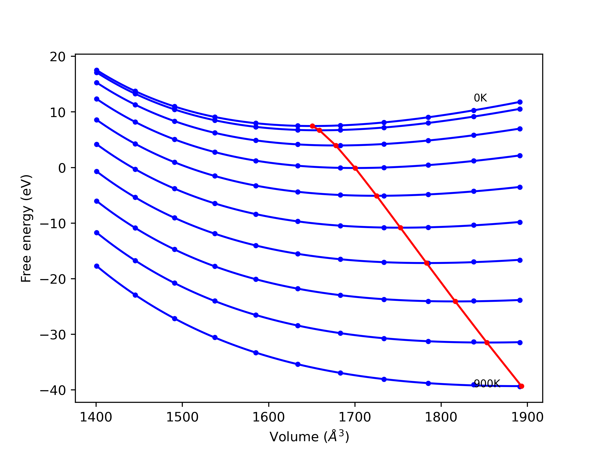 Phonon band structures and crystal properties estimated from quasi-harmonic approximation (QHA) calculations are displayed for select crystals. The calculations were performed using phonopy and LAMMPS. For the phonon calculations, 3x3 supercells of the potential-specific relaxed crystals were used. The QHA calculations were based on 11 strain states ranging from -0.05 to 0.05.