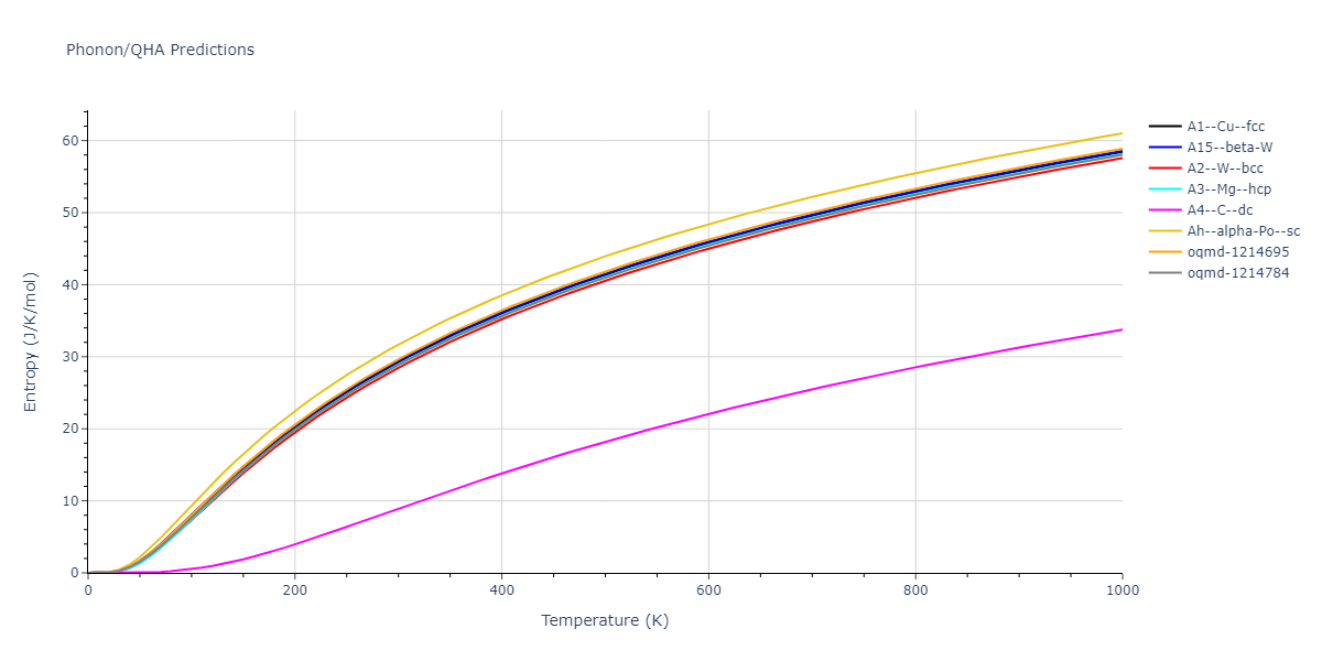 The Gibbs energies of the phases are estimated using thermodynamic integration between the interatomic potential in question and a simpler model with known Gibbs free energy values. For solids, the reference model is an Einstein solid, while for liquids it is the Uhlenbeck-Ford potential. Besides a short run at the start of the solid calculations to estimate Einstein model spring constants, the two calculations proceed similarly. Starting with the final relaxation configurations, the systems are stabilized for 25,000 steps. Then, over the next 50,000 steps the potential is swapped out for the reference potential. The system is then stabilized for another 25,000 steps with the reference model before a reverse swap of 50,000 steps is performed. The simulation ends with one final 25,000 step stabilization period. From the simulation, the irreversible work of transformation is estimated and used to compute the absolute Gibbs free energy of the target phase and potential relative to the reference potential. Entropy is estimated as the difference in enthalpy and Gibbs free energy and divided by temperature.