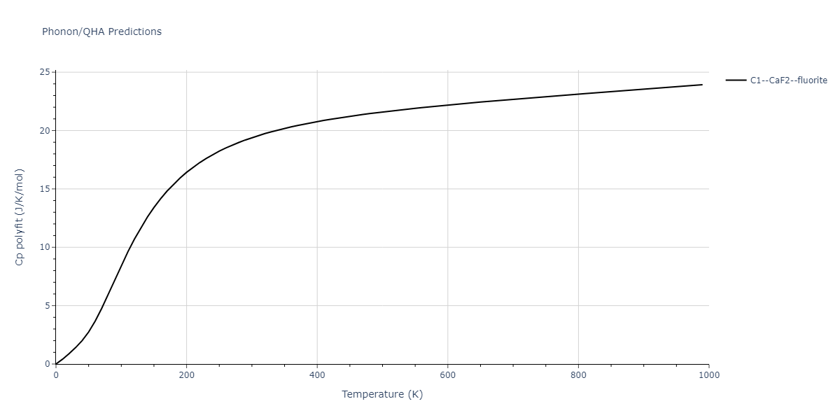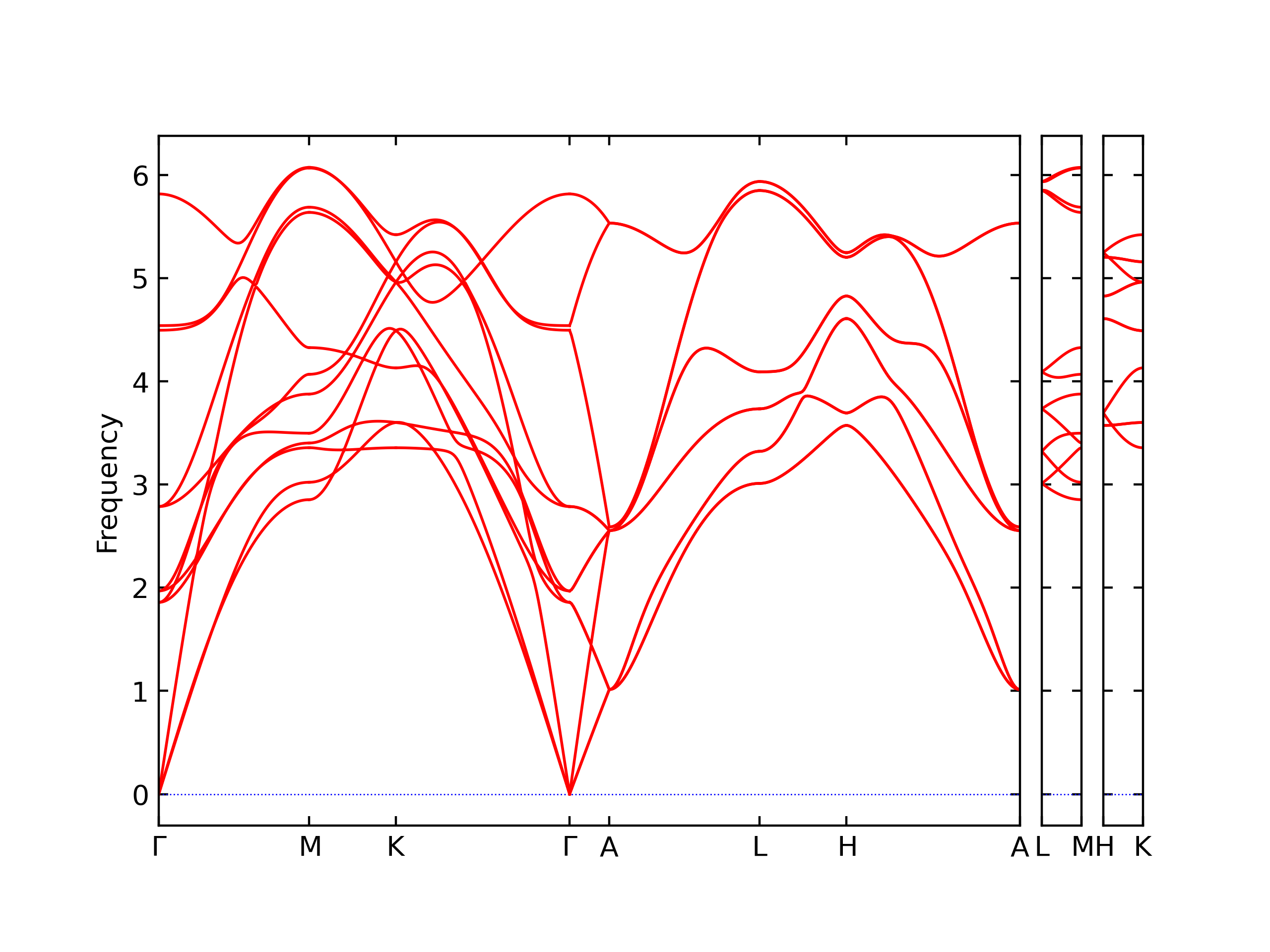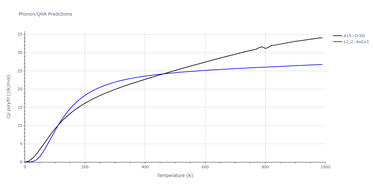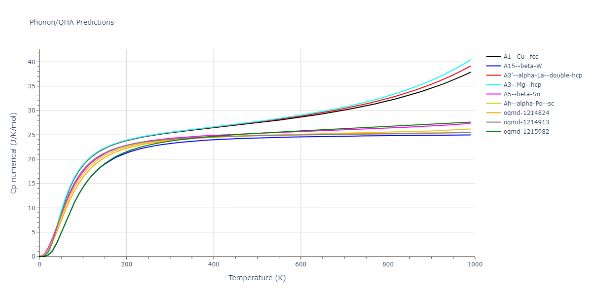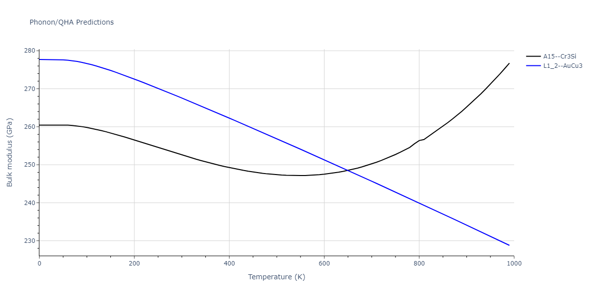 Phonon band structures and crystal properties estimated from quasi-harmonic approximation (QHA) calculations are displayed for select crystals. The calculations were performed using phonopy and LAMMPS. For the phonon calculations, 3x3 supercells of the potential-specific relaxed crystals were used. The QHA calculations were based on 11 strain states ranging from -0.05 to 0.05.
