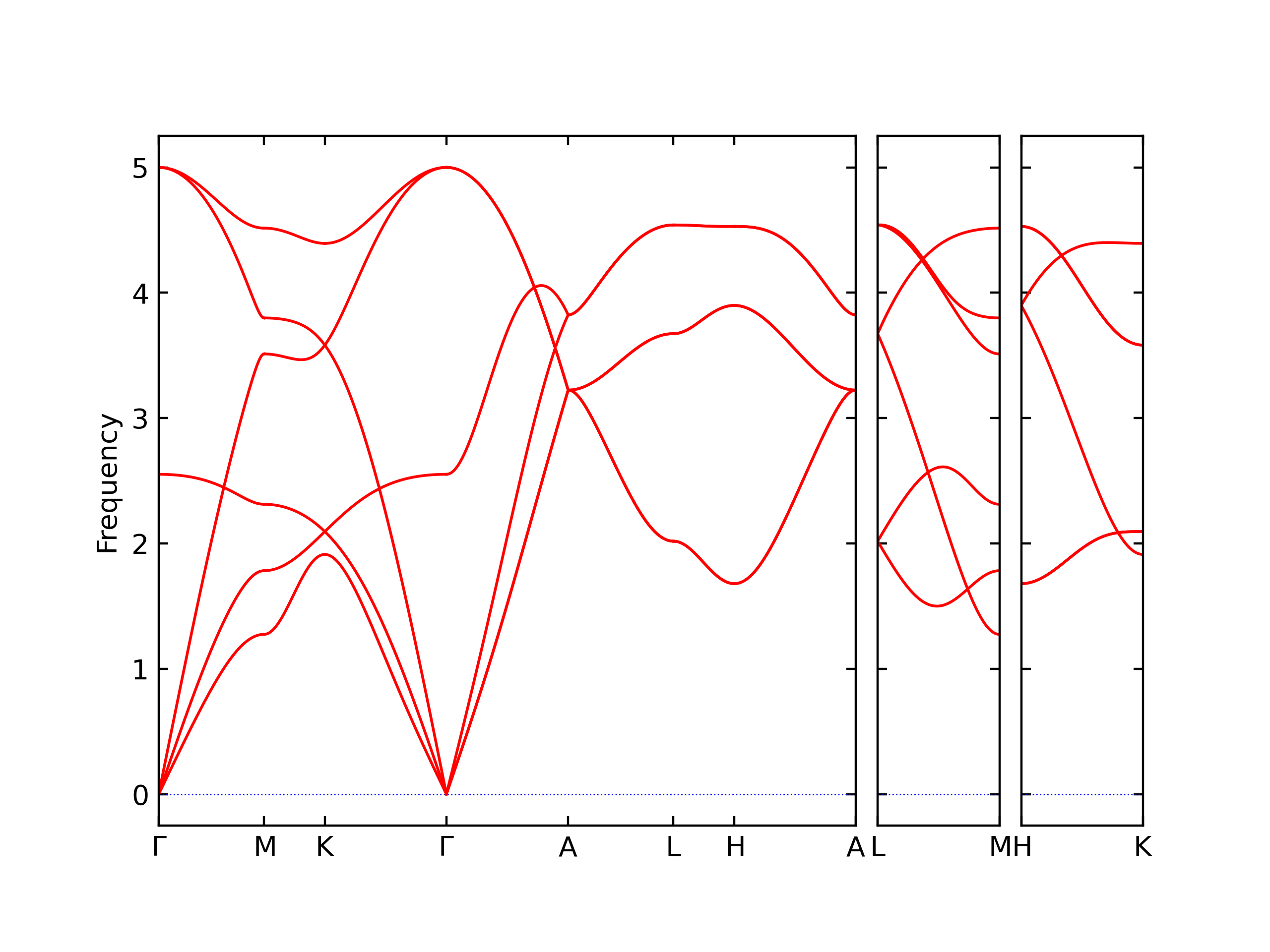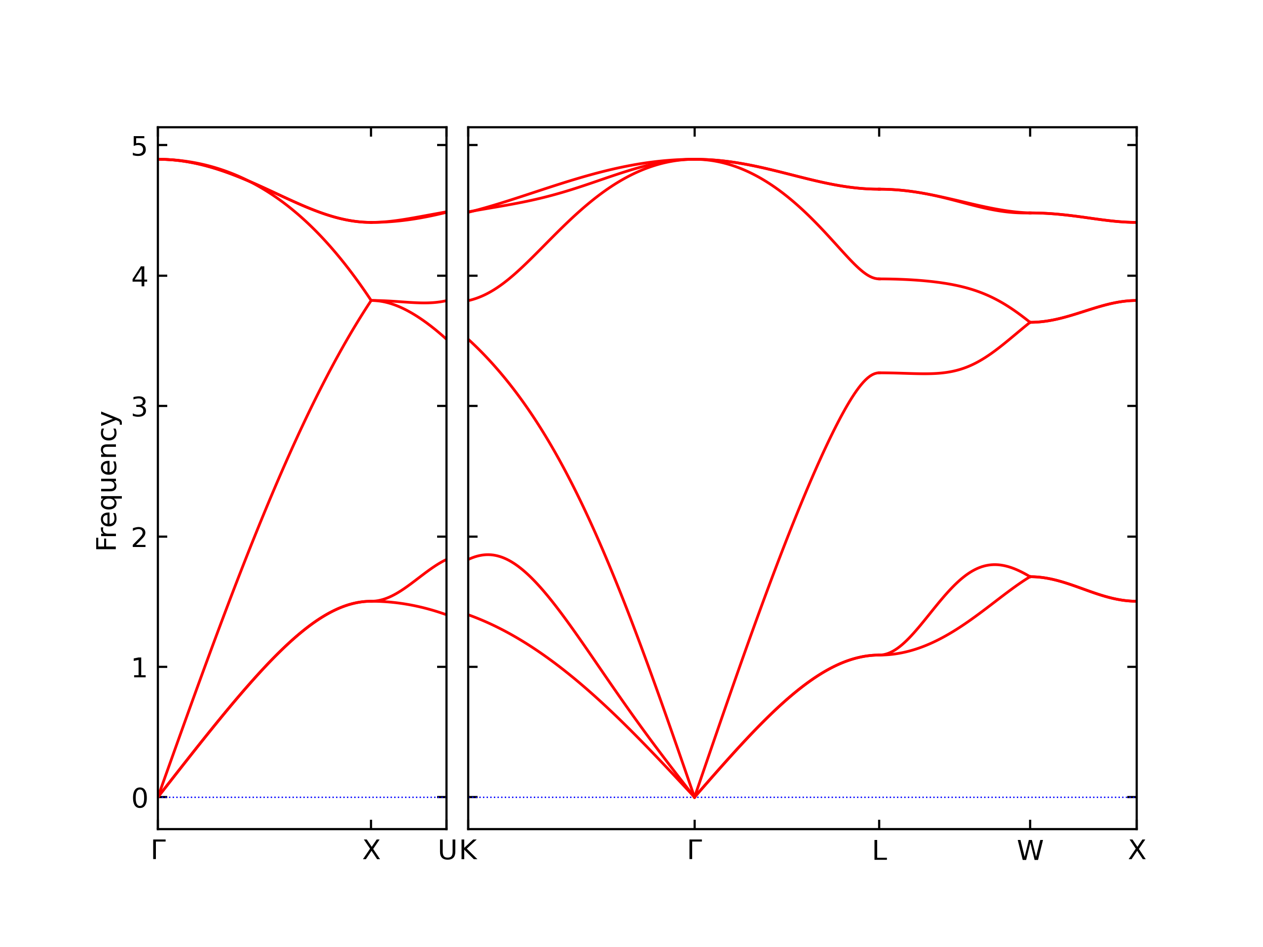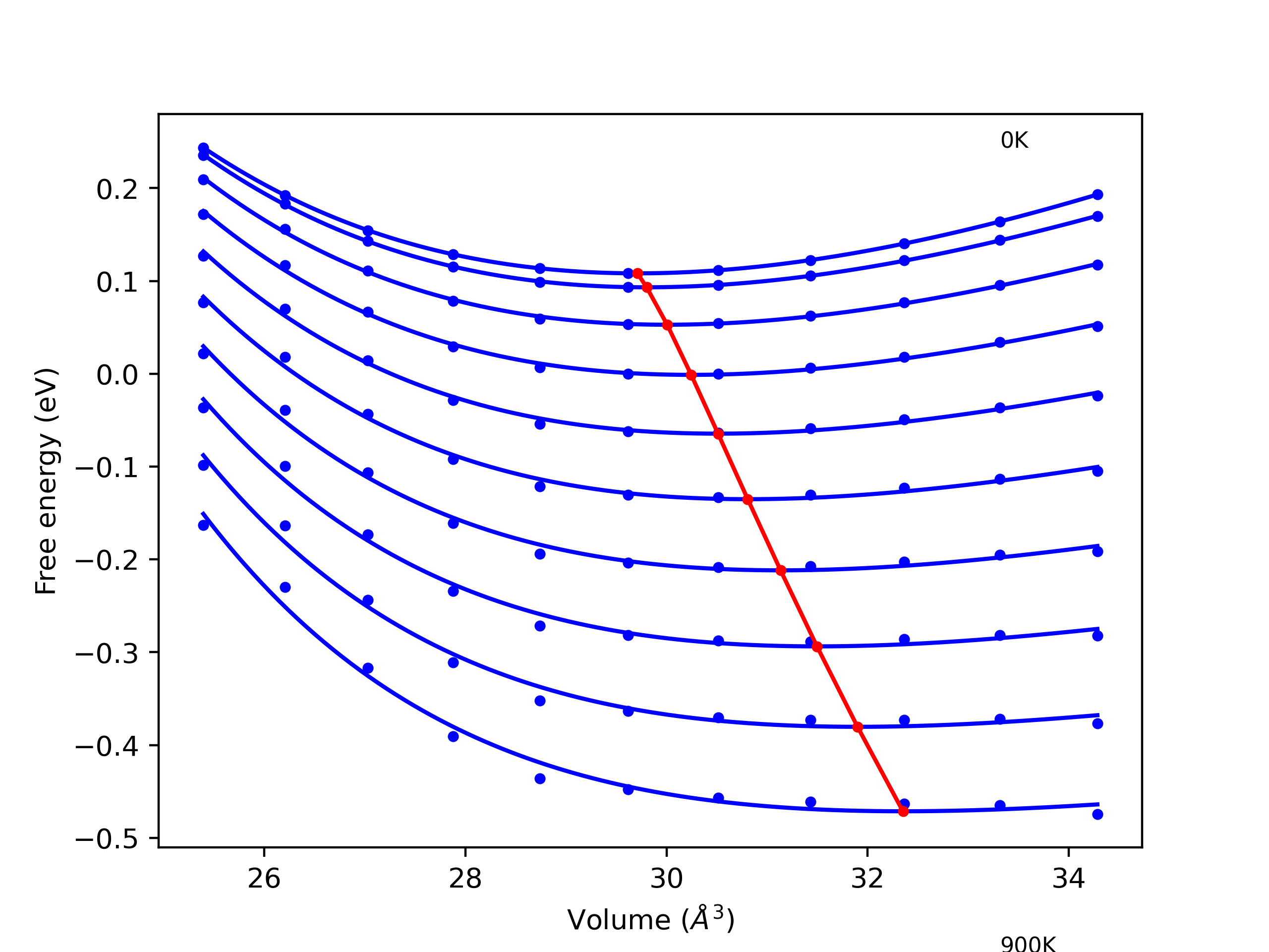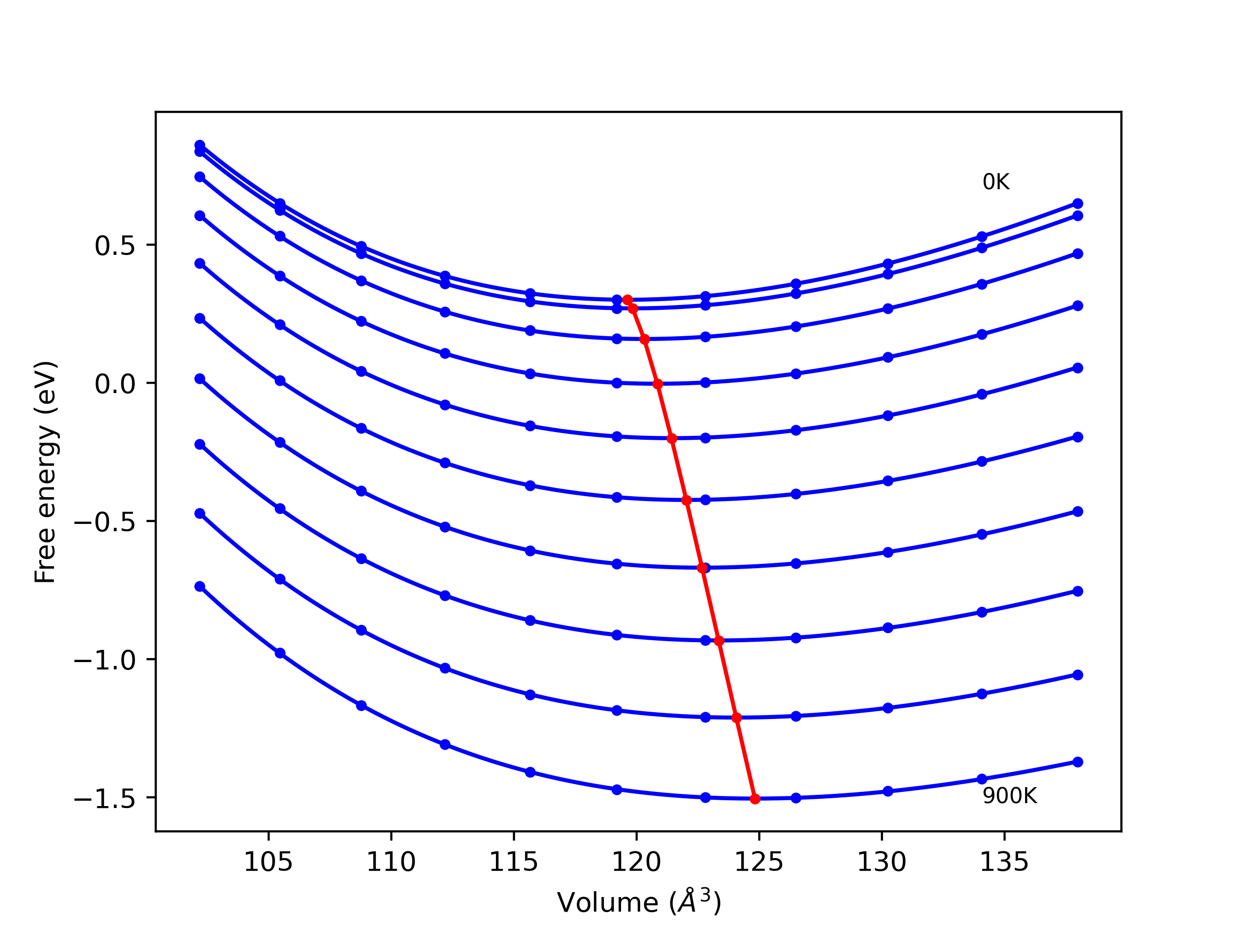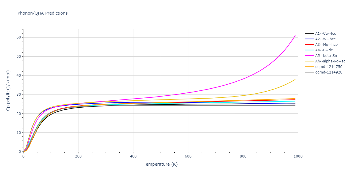 Phonon band structures and crystal properties estimated from quasi-harmonic approximation (QHA) calculations are displayed for select crystals. The calculations were performed using phonopy and LAMMPS. For the phonon calculations, 3x3 supercells of the potential-specific relaxed crystals were used. The QHA calculations were based on 11 strain states ranging from -0.05 to 0.05.
