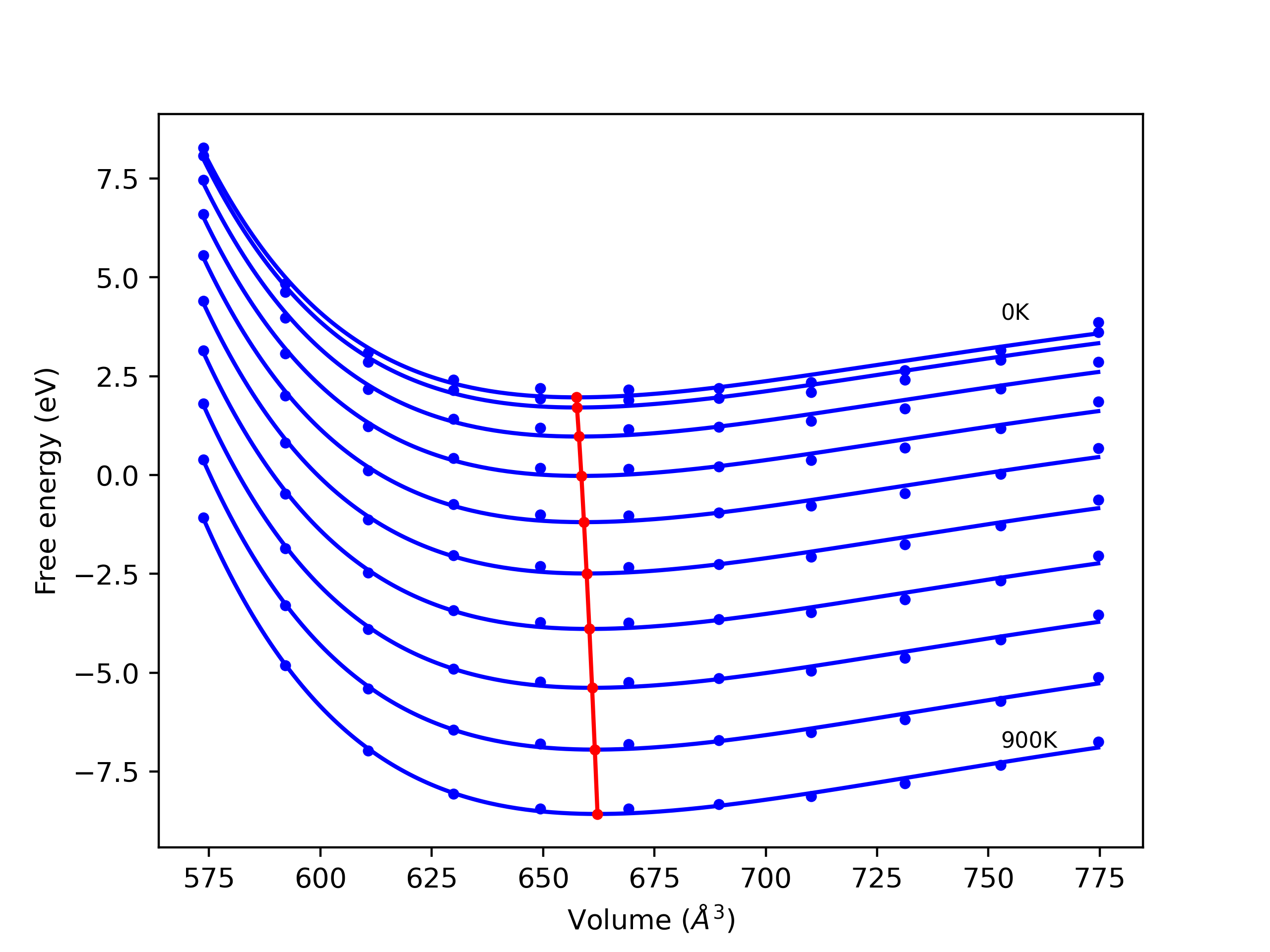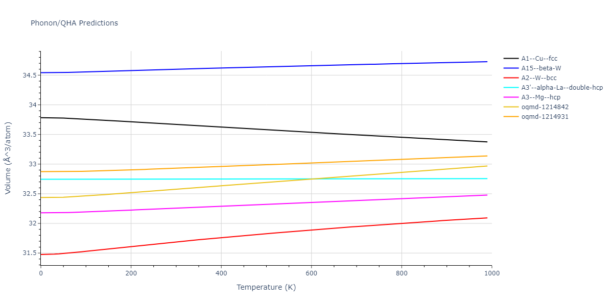 Phonon band structures and crystal properties estimated from quasi-harmonic approximation (QHA) calculations are displayed for select crystals. The calculations were performed using phonopy and LAMMPS. For the phonon calculations, 3x3 supercells of the potential-specific relaxed crystals were used. The QHA calculations were based on 11 strain states ranging from -0.05 to 0.05.