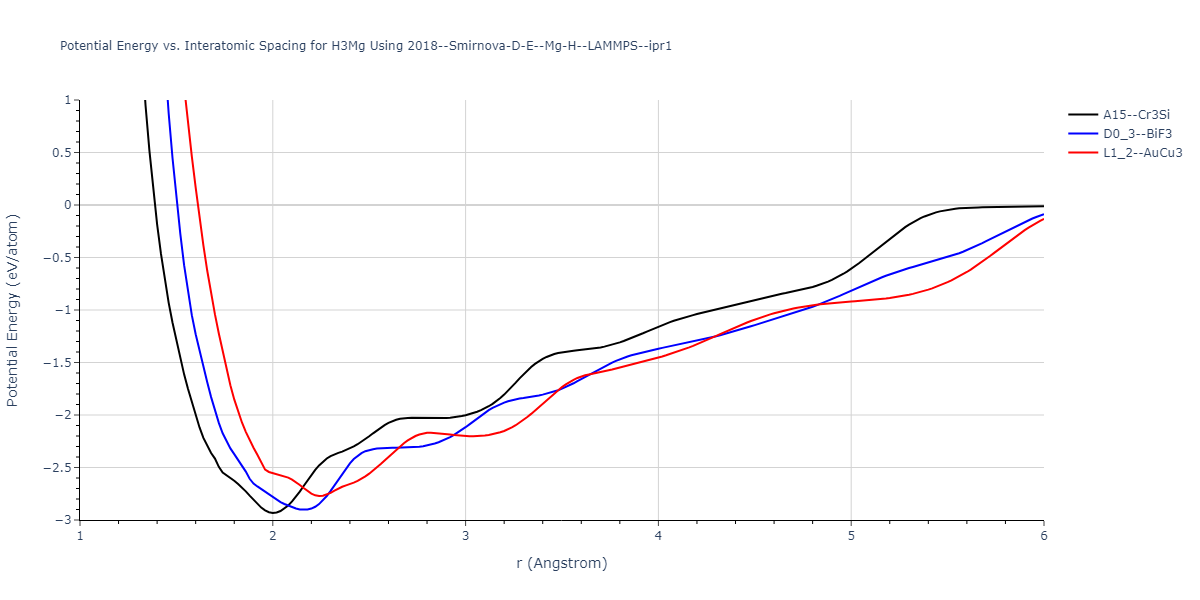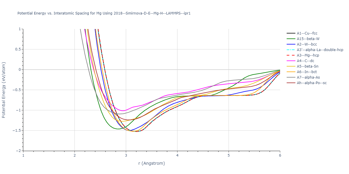 Plots of potential energy vs interatomic spacing, r, are shown below for a number of crystal structures. The structures are generated based on the ideal atomic positions and b/a and c/a lattice parameter ratios for a given crystal prototype. The size of the system is then uniformly scaled, and the energy calculated without relaxing the system. To obtain these plots, values of r are evaluated every 0.02 Å up to 6 Å.