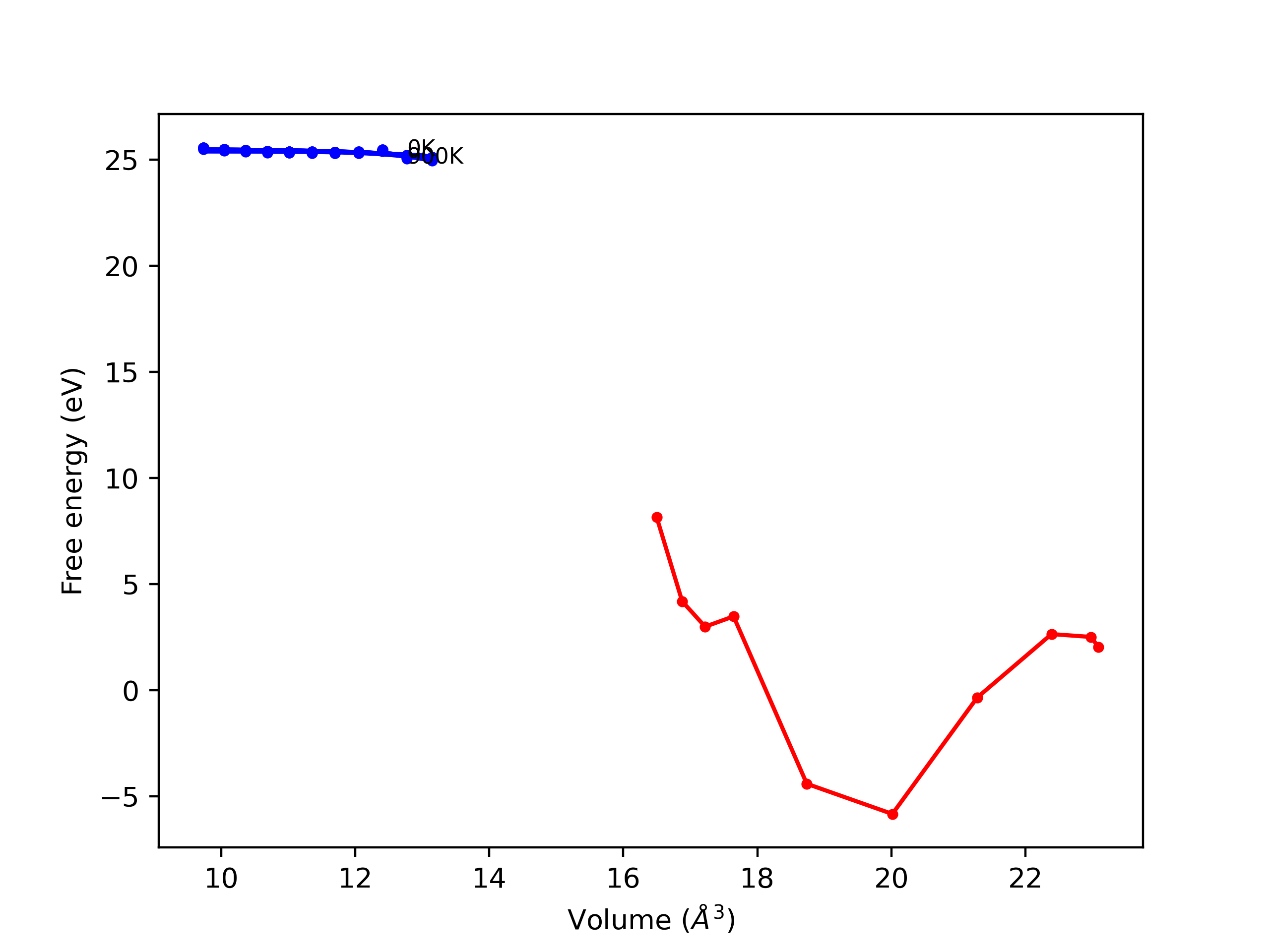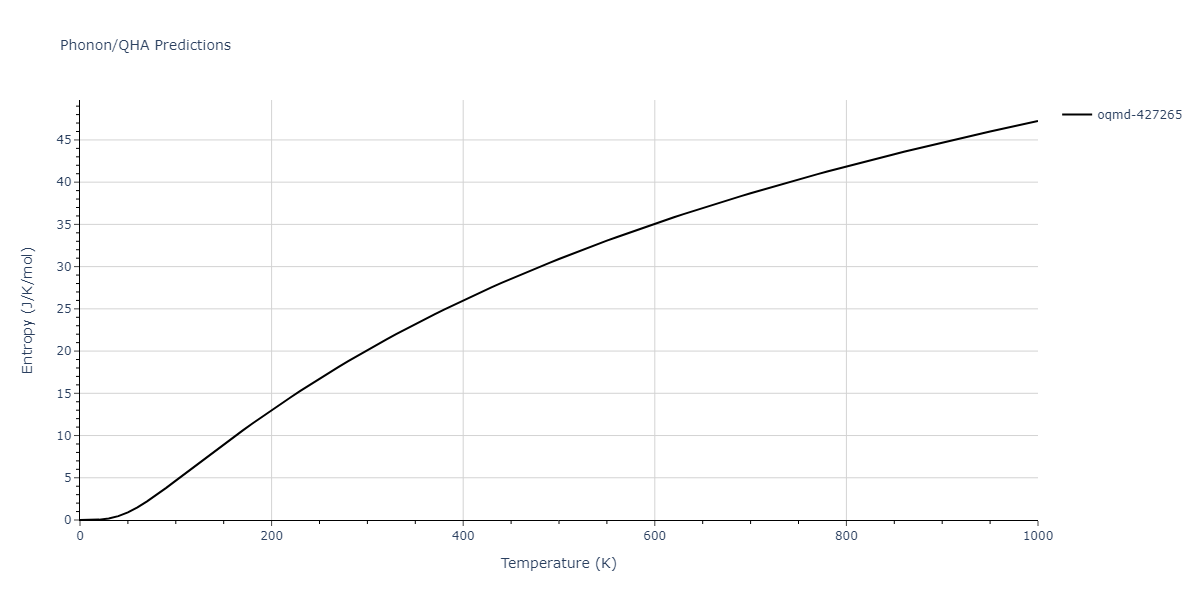 Plots of internal energy, Gibbs free energy, entropy, heat capacity and volume are shown here as a function of temperature for various crystal structures and liquid phases. The included crystal structures correspond to those in the Solid Structures vs. Temperature section, and the liquid phases to those in the Liquid Properties section. Internal energy and volume are taken from the associated structure relaxations mentioned in those previous sections. Constant pressure heat capacity is estimated using 3-point numerical derivatives of enthalpy versus temperature. Note that since all simulations done here are at 0 pressure, internal energy and enthalpy are equivalent.