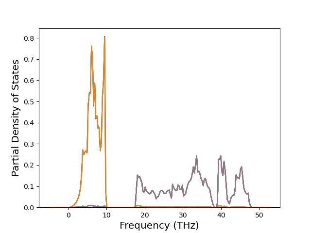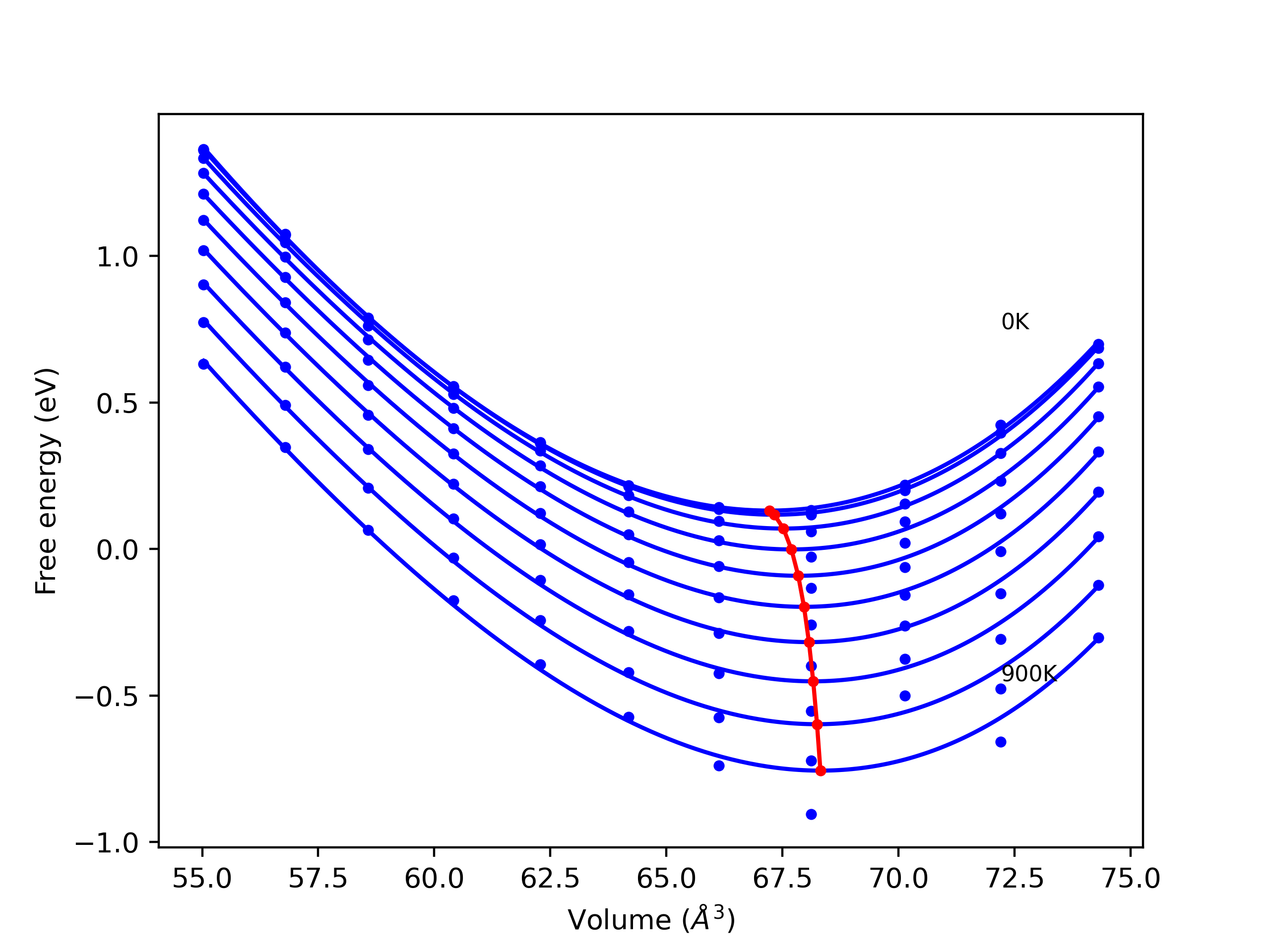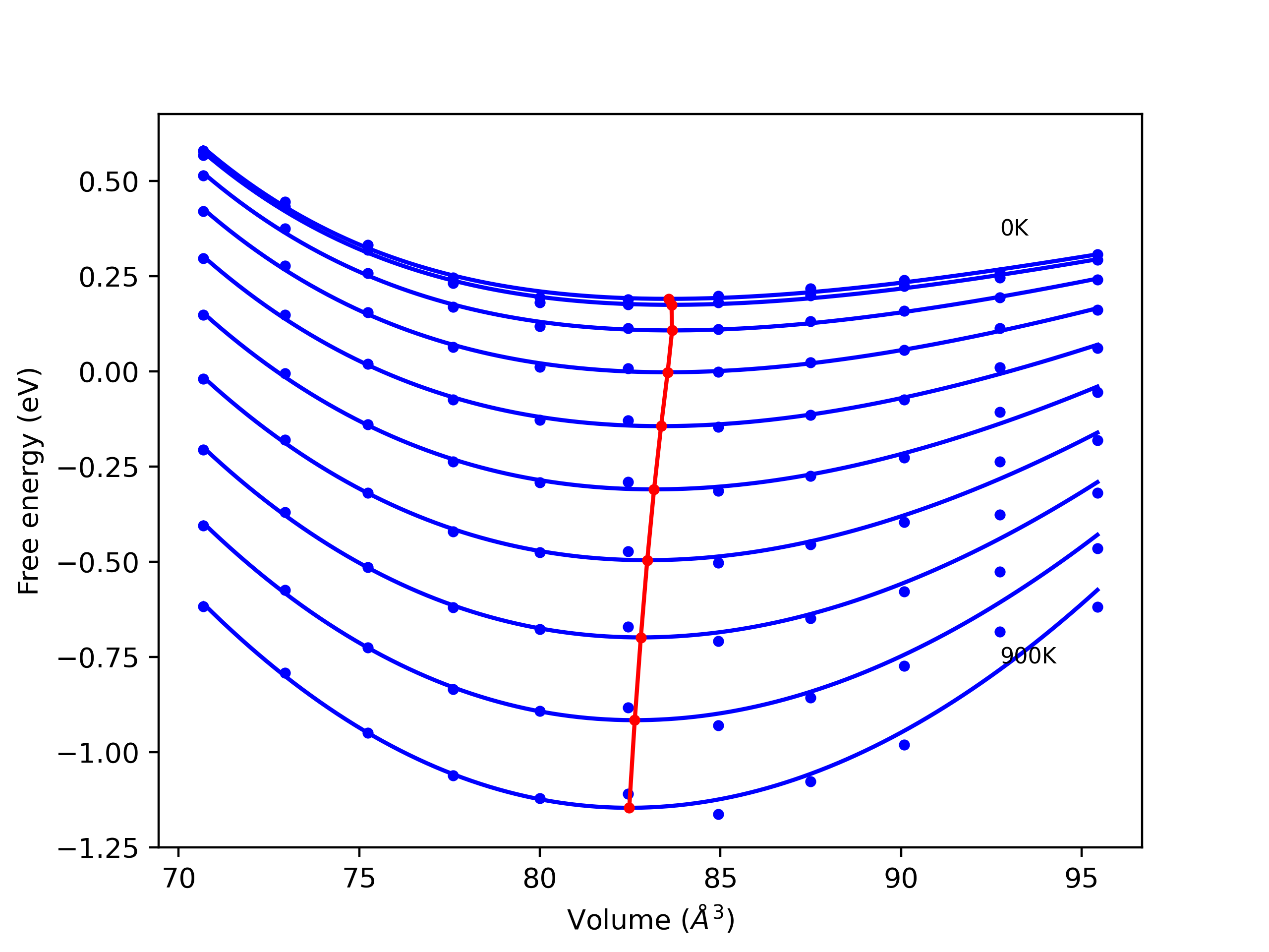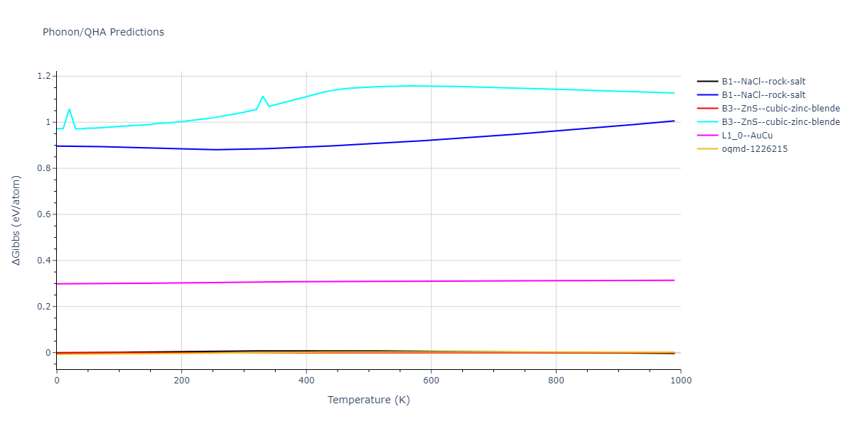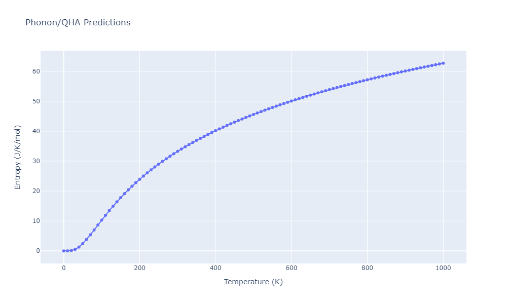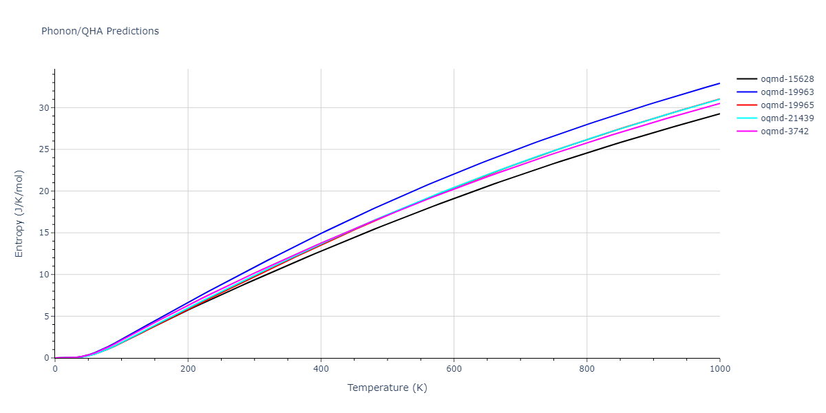 The Gibbs energies of the phases are estimated using thermodynamic integration between the interatomic potential in question and a simpler model with known Gibbs free energy values. For solids, the reference model is an Einstein solid, while for liquids it is the Uhlenbeck-Ford potential. Besides a short run at the start of the solid calculations to estimate Einstein model spring constants, the two calculations proceed similarly. Starting with the final relaxation configurations, the systems are stabilized for 25,000 steps. Then, over the next 50,000 steps the potential is swapped out for the reference potential. The system is then stabilized for another 25,000 steps with the reference model before a reverse swap of 50,000 steps is performed. The simulation ends with one final 25,000 step stabilization period. From the simulation, the irreversible work of transformation is estimated and used to compute the absolute Gibbs free energy of the target phase and potential relative to the reference potential. Entropy is estimated as the difference in enthalpy and Gibbs free energy and divided by temperature.