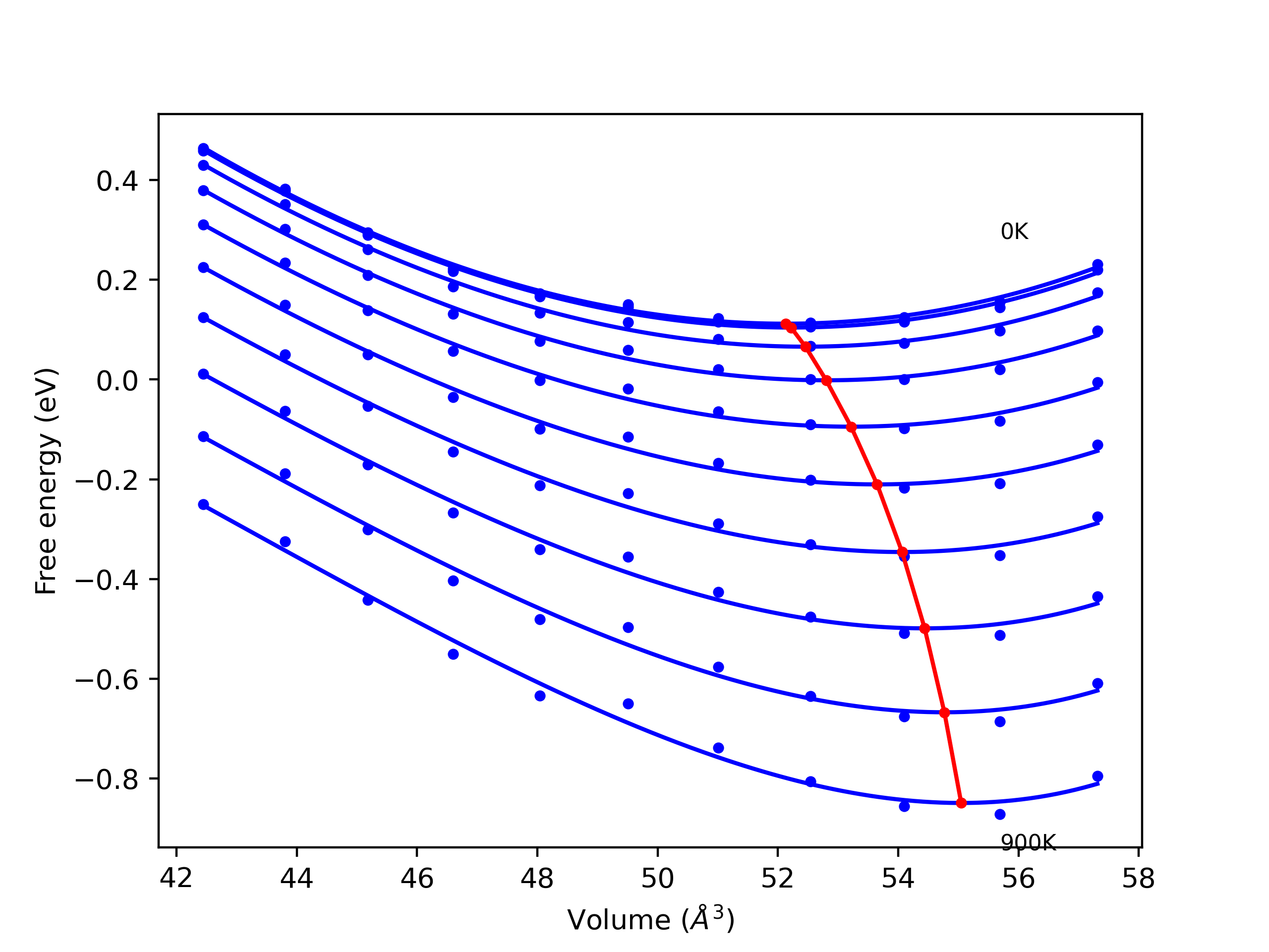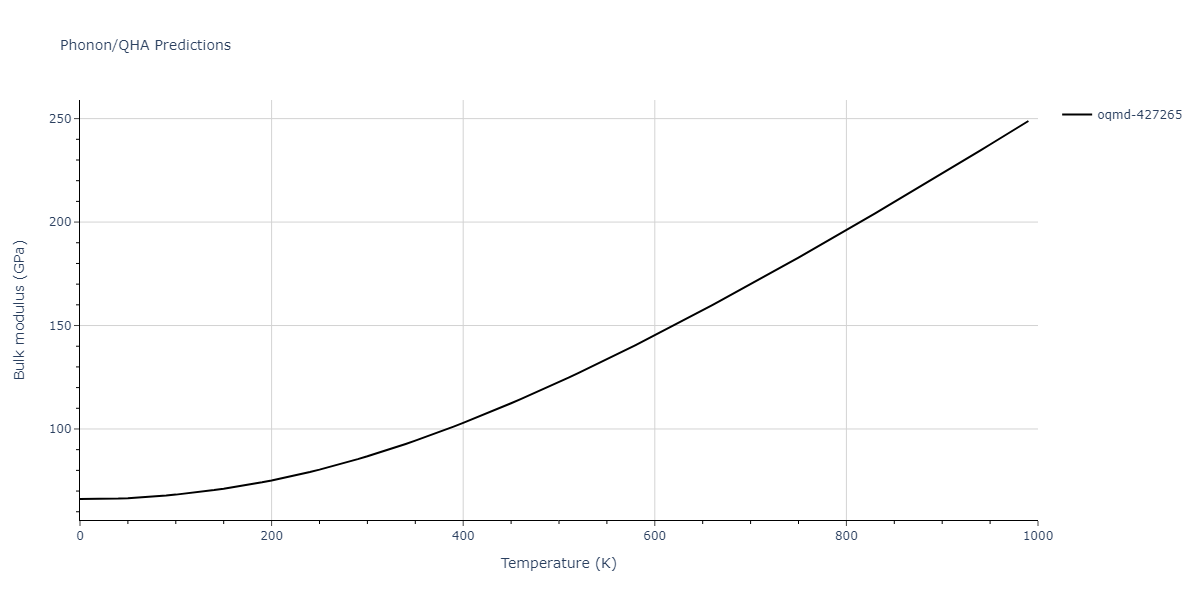 Plots of lattice and elastic constants are shown as a function of temperature. The 0K points were taken from the Crystal Structure Predictions and the Elastic Constants Predictions sections above for the unique crystal structures relaxed with the "dynamic" method. Starting from the 0 K relaxed crystal unit cells, supercell systems are created by replicating all three dimensions by the same multiplier to achieve at least 4000 atoms. The systems are then relaxed at 50 K and zero pressure using 1 million NPT steps. Lattice constants are estimated by averaging the measured box dimensions. Temperatures are iteratively increased by 50 K, with each subsequent relaxation calculation starting from the final atomic configuration at the previous temperature and relaxing for another 1 million steps.
