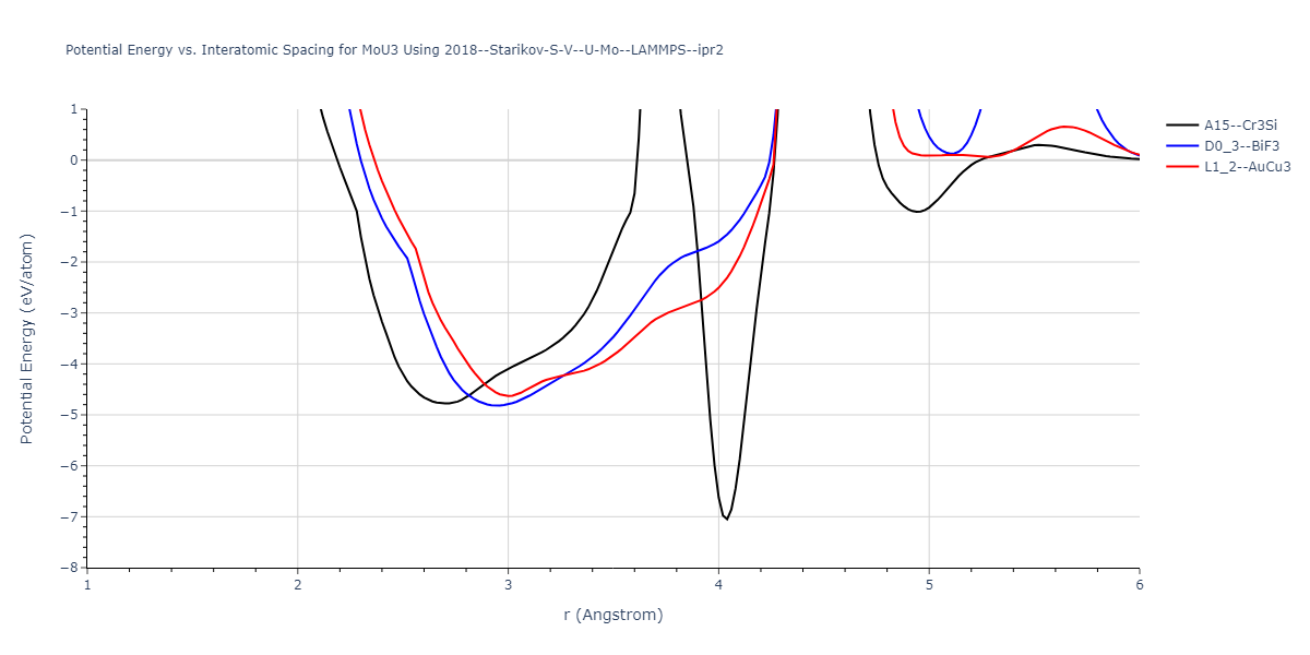 Plots of potential energy vs interatomic spacing, r, are shown below for a number of crystal structures. The structures are generated based on the ideal atomic positions and b/a and c/a lattice parameter ratios for a given crystal prototype. The size of the system is then uniformly scaled, and the energy calculated without relaxing the system. To obtain these plots, values of r are evaluated every 0.02 Å up to 6 Å.