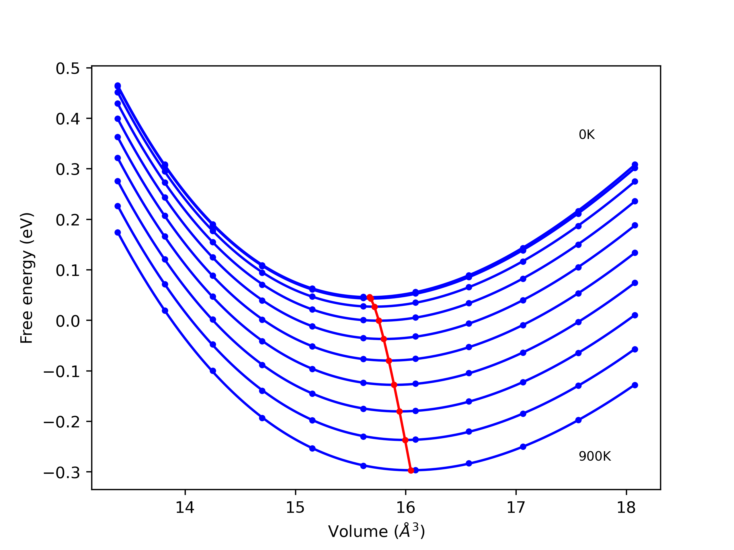 Plots of lattice and elastic constants are shown as a function of temperature. The 0K points were taken from the Crystal Structure Predictions and the Elastic Constants Predictions sections above for the unique crystal structures relaxed with the "dynamic" method. Starting from the 0 K relaxed crystal unit cells, supercell systems are created by replicating all three dimensions by the same multiplier to achieve at least 4000 atoms. The systems are then relaxed at 50 K and zero pressure using 1 million NPT steps. Lattice constants are estimated by averaging the measured box dimensions. Temperatures are iteratively increased by 50 K, with each subsequent relaxation calculation starting from the final atomic configuration at the previous temperature and relaxing for another 1 million steps.