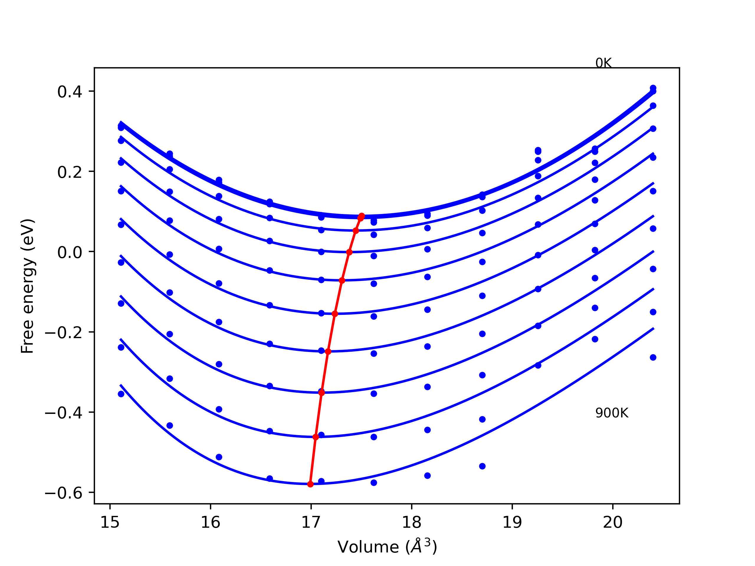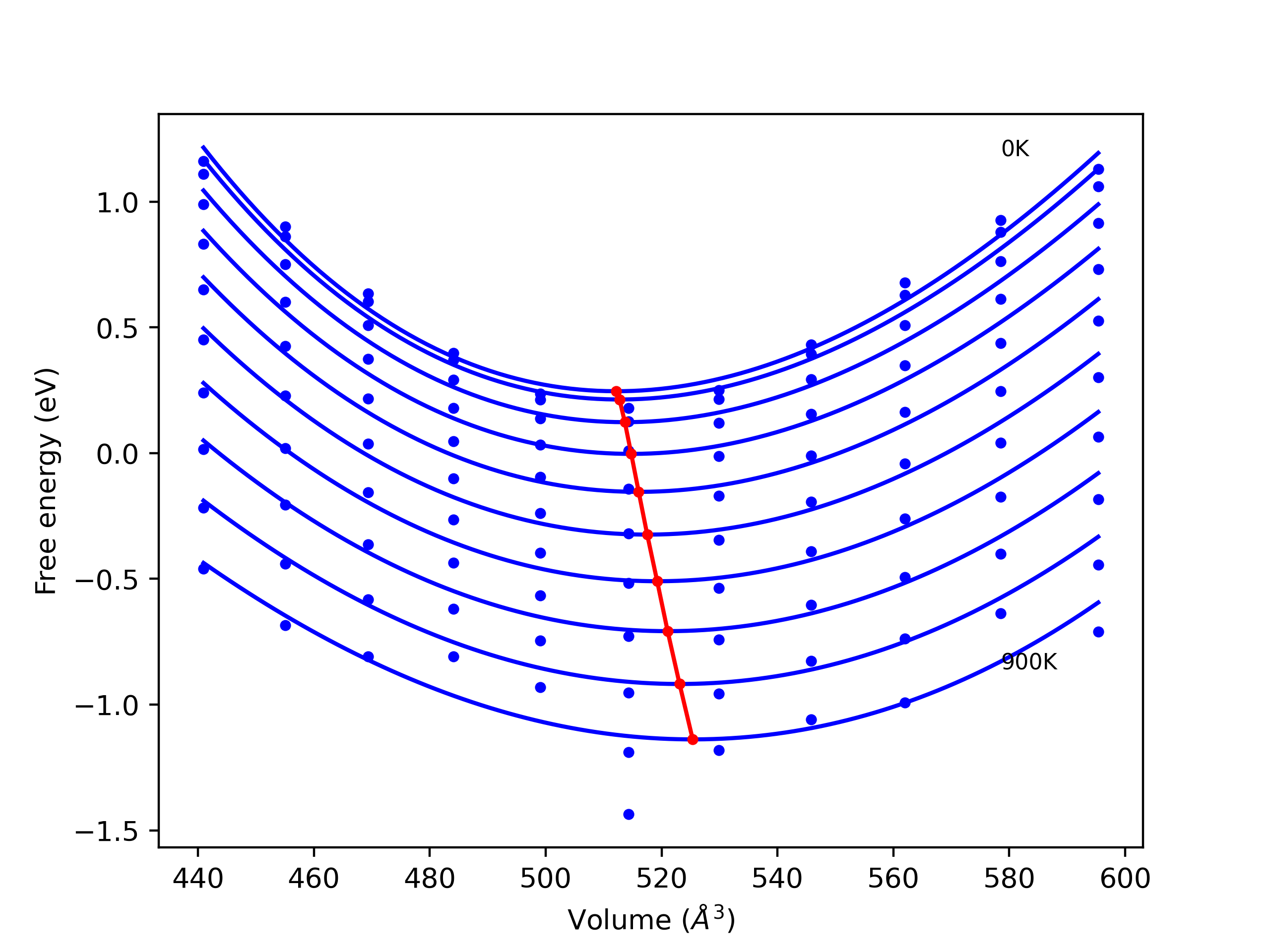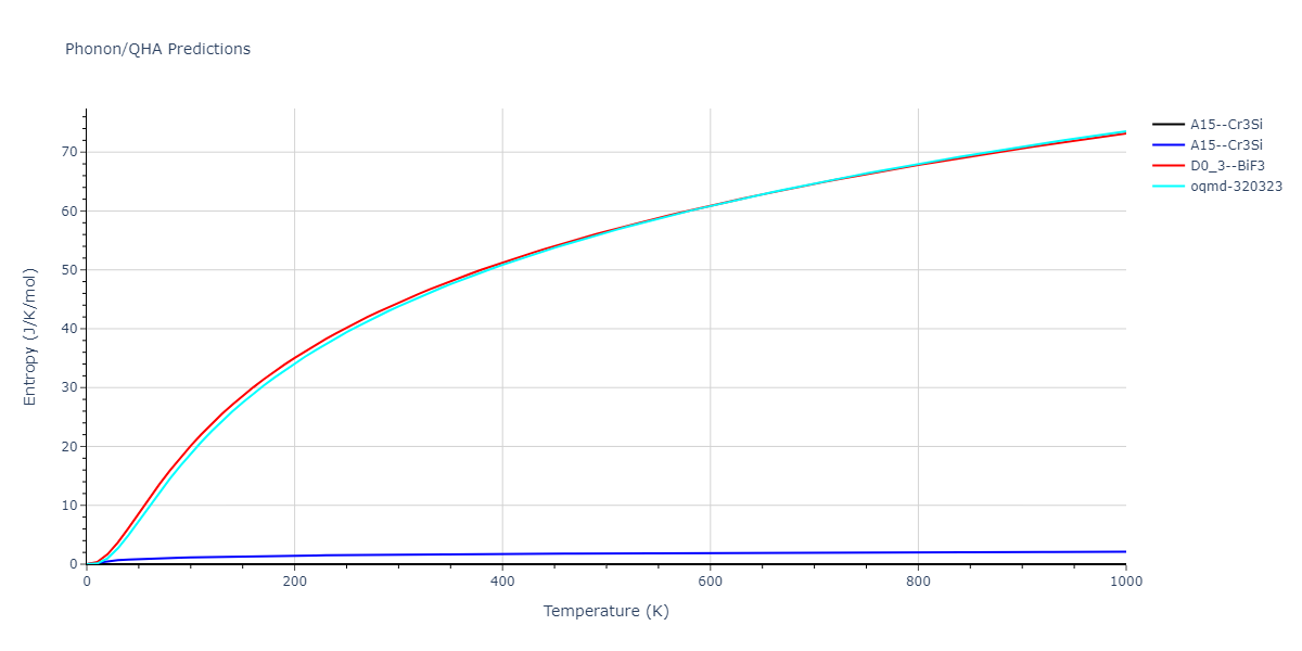 The Gibbs energies of the phases are estimated using thermodynamic integration between the interatomic potential in question and a simpler model with known Gibbs free energy values. For solids, the reference model is an Einstein solid, while for liquids it is the Uhlenbeck-Ford potential. Besides a short run at the start of the solid calculations to estimate Einstein model spring constants, the two calculations proceed similarly. Starting with the final relaxation configurations, the systems are stabilized for 25,000 steps. Then, over the next 50,000 steps the potential is swapped out for the reference potential. The system is then stabilized for another 25,000 steps with the reference model before a reverse swap of 50,000 steps is performed. The simulation ends with one final 25,000 step stabilization period. From the simulation, the irreversible work of transformation is estimated and used to compute the absolute Gibbs free energy of the target phase and potential relative to the reference potential. Entropy is estimated as the difference in enthalpy and Gibbs free energy and divided by temperature.