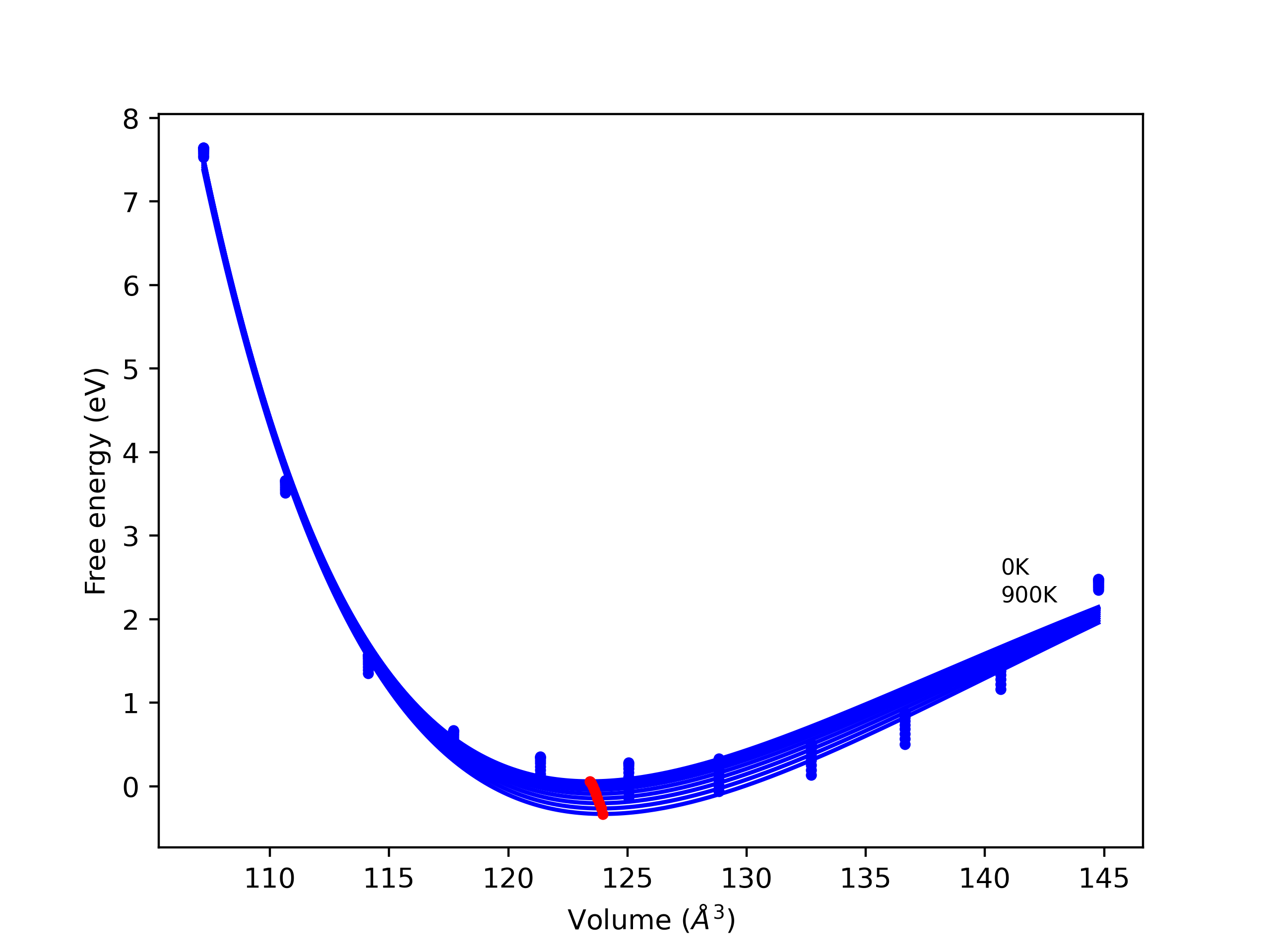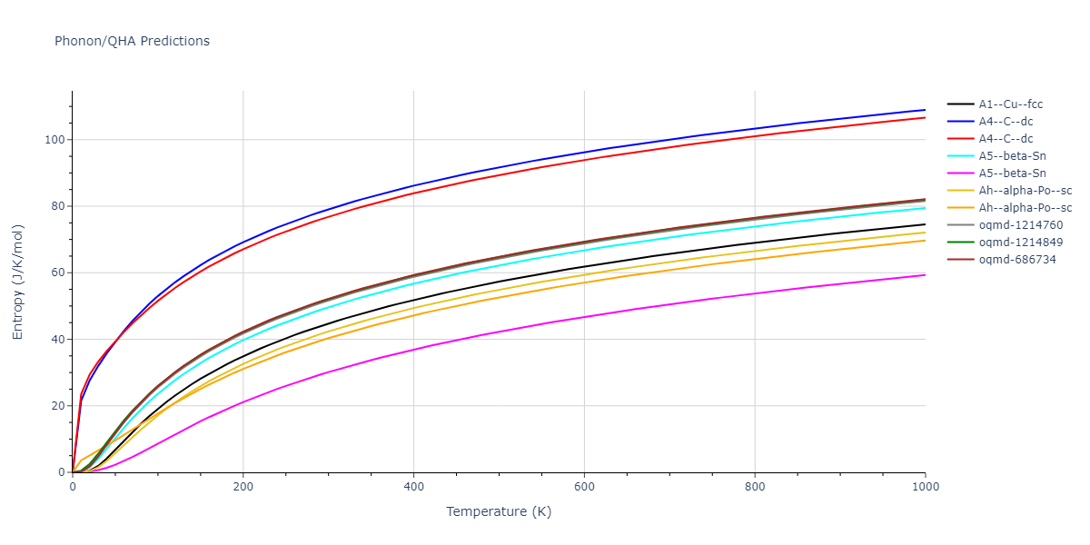 Plots of internal energy, Gibbs free energy, entropy, heat capacity and volume are shown here as a function of temperature for various crystal structures and liquid phases. The included crystal structures correspond to those in the Solid Structures vs. Temperature section, and the liquid phases to those in the Liquid Properties section. Internal energy and volume are taken from the associated structure relaxations mentioned in those previous sections. Constant pressure heat capacity is estimated using 3-point numerical derivatives of enthalpy versus temperature. Note that since all simulations done here are at 0 pressure, internal energy and enthalpy are equivalent.