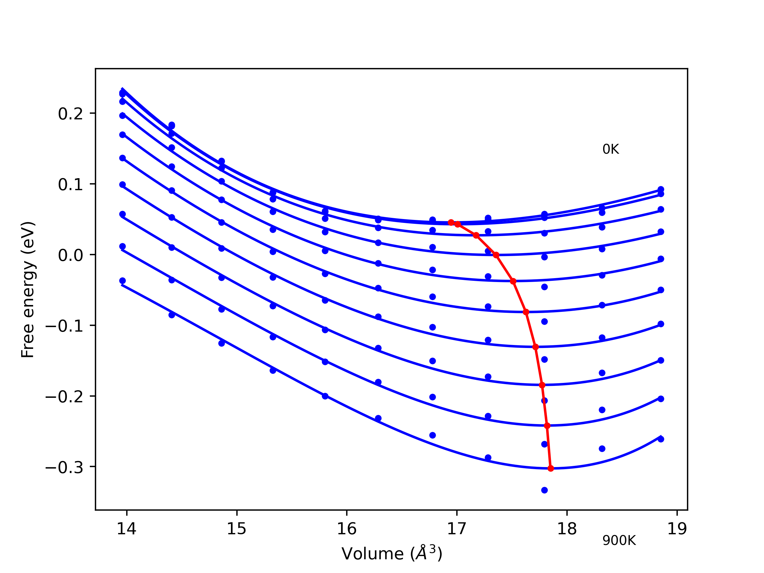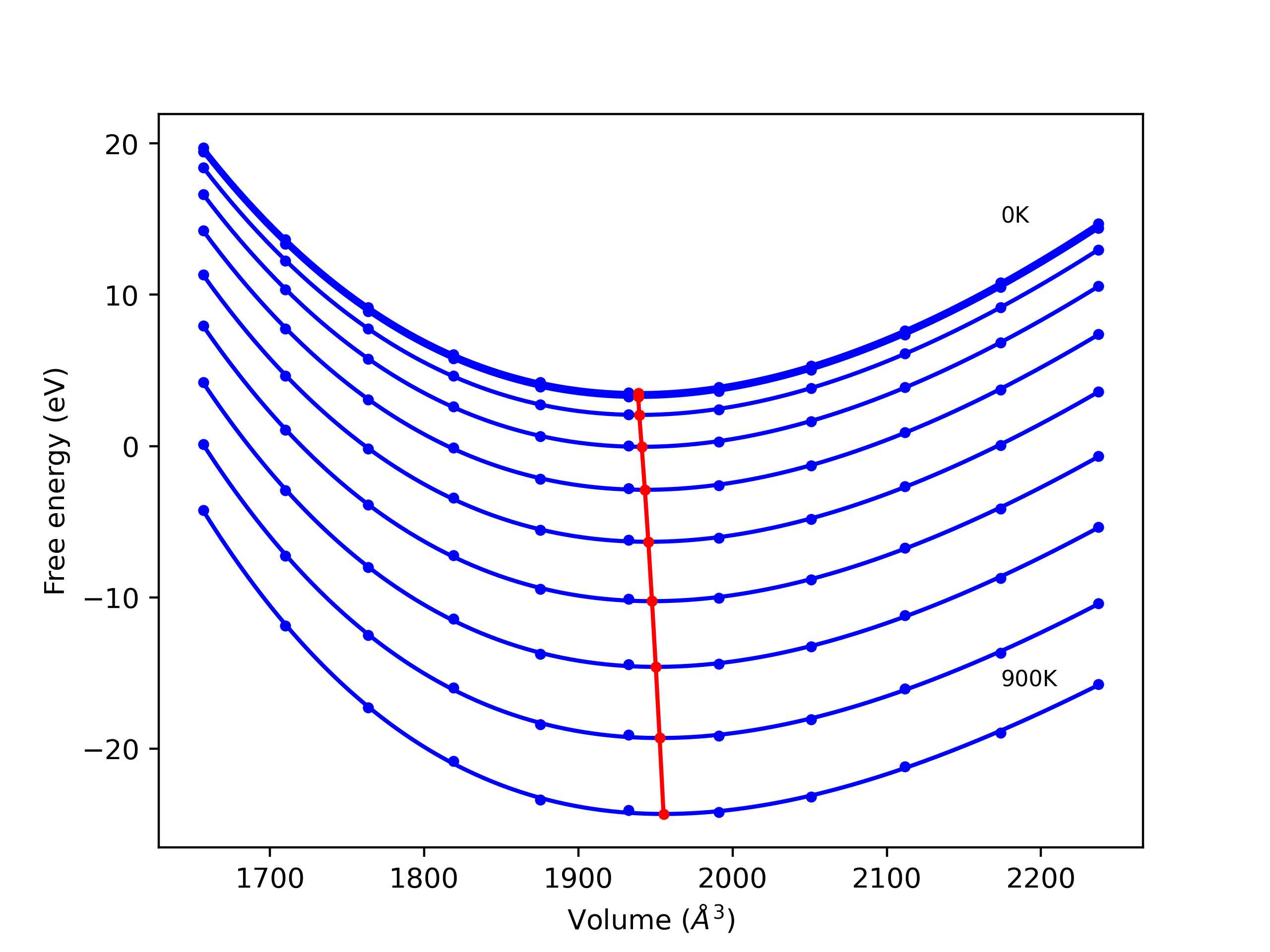 The Gibbs energies of the phases are estimated using thermodynamic integration between the interatomic potential in question and a simpler model with known Gibbs free energy values. For solids, the reference model is an Einstein solid, while for liquids it is the Uhlenbeck-Ford potential. Besides a short run at the start of the solid calculations to estimate Einstein model spring constants, the two calculations proceed similarly. Starting with the final relaxation configurations, the systems are stabilized for 25,000 steps. Then, over the next 50,000 steps the potential is swapped out for the reference potential. The system is then stabilized for another 25,000 steps with the reference model before a reverse swap of 50,000 steps is performed. The simulation ends with one final 25,000 step stabilization period. From the simulation, the irreversible work of transformation is estimated and used to compute the absolute Gibbs free energy of the target phase and potential relative to the reference potential. Entropy is estimated as the difference in enthalpy and Gibbs free energy and divided by temperature.