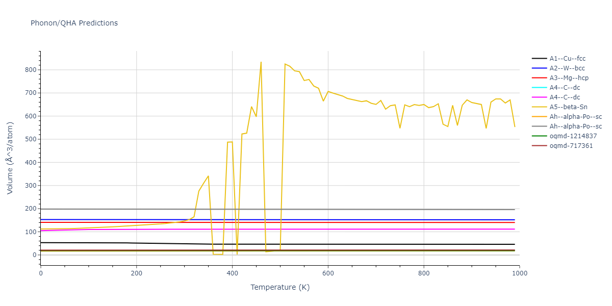 Plots of internal energy, Gibbs free energy, entropy, heat capacity and volume are shown here as a function of temperature for various crystal structures and liquid phases. The included crystal structures correspond to those in the Solid Structures vs. Temperature section, and the liquid phases to those in the Liquid Properties section. Internal energy and volume are taken from the associated structure relaxations mentioned in those previous sections. Constant pressure heat capacity is estimated using 3-point numerical derivatives of enthalpy versus temperature. Note that since all simulations done here are at 0 pressure, internal energy and enthalpy are equivalent.