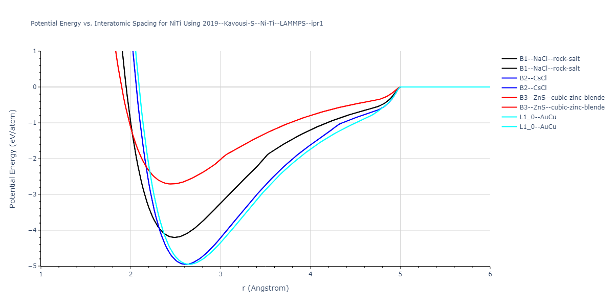 Plots of potential energy vs interatomic spacing, r, are shown below for a number of crystal structures. The structures are generated based on the ideal atomic positions and b/a and c/a lattice parameter ratios for a given crystal prototype. The size of the system is then uniformly scaled, and the energy calculated without relaxing the system. To obtain these plots, values of r are evaluated every 0.02 Å up to 6 Å.