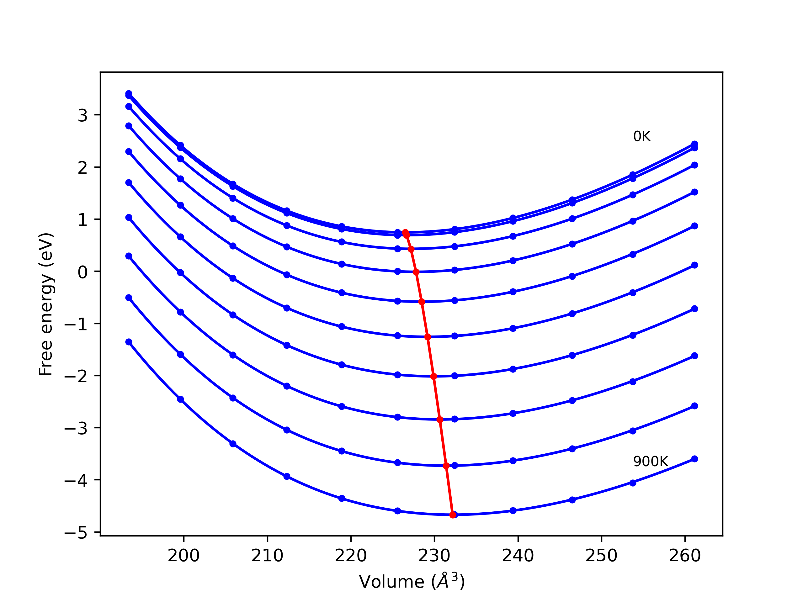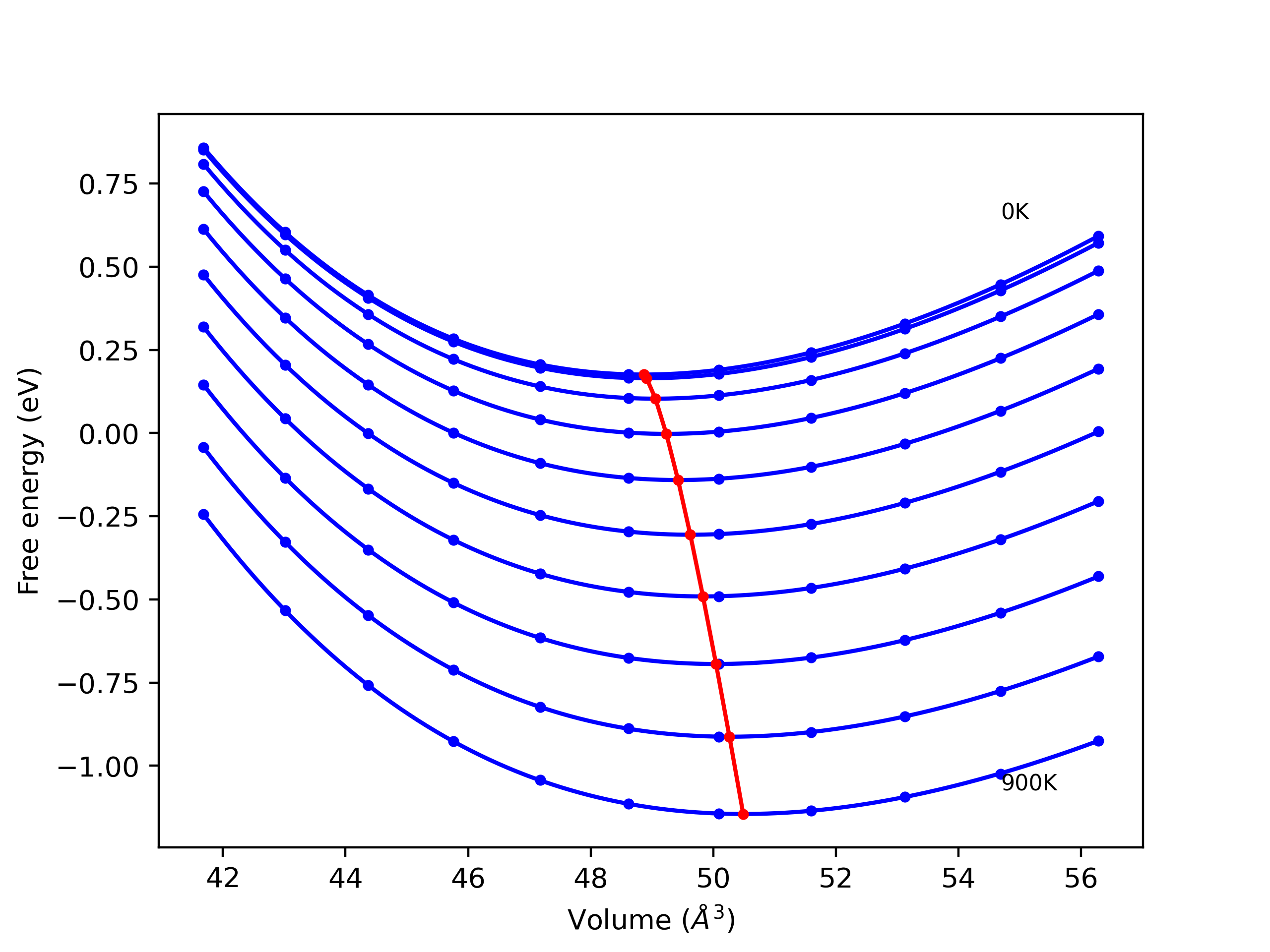 Plots of lattice and elastic constants are shown as a function of temperature. The 0K points were taken from the Crystal Structure Predictions and the Elastic Constants Predictions sections above for the unique crystal structures relaxed with the "dynamic" method. Starting from the 0 K relaxed crystal unit cells, supercell systems are created by replicating all three dimensions by the same multiplier to achieve at least 4000 atoms. The systems are then relaxed at 50 K and zero pressure using 1 million NPT steps. Lattice constants are estimated by averaging the measured box dimensions. Temperatures are iteratively increased by 50 K, with each subsequent relaxation calculation starting from the final atomic configuration at the previous temperature and relaxing for another 1 million steps.