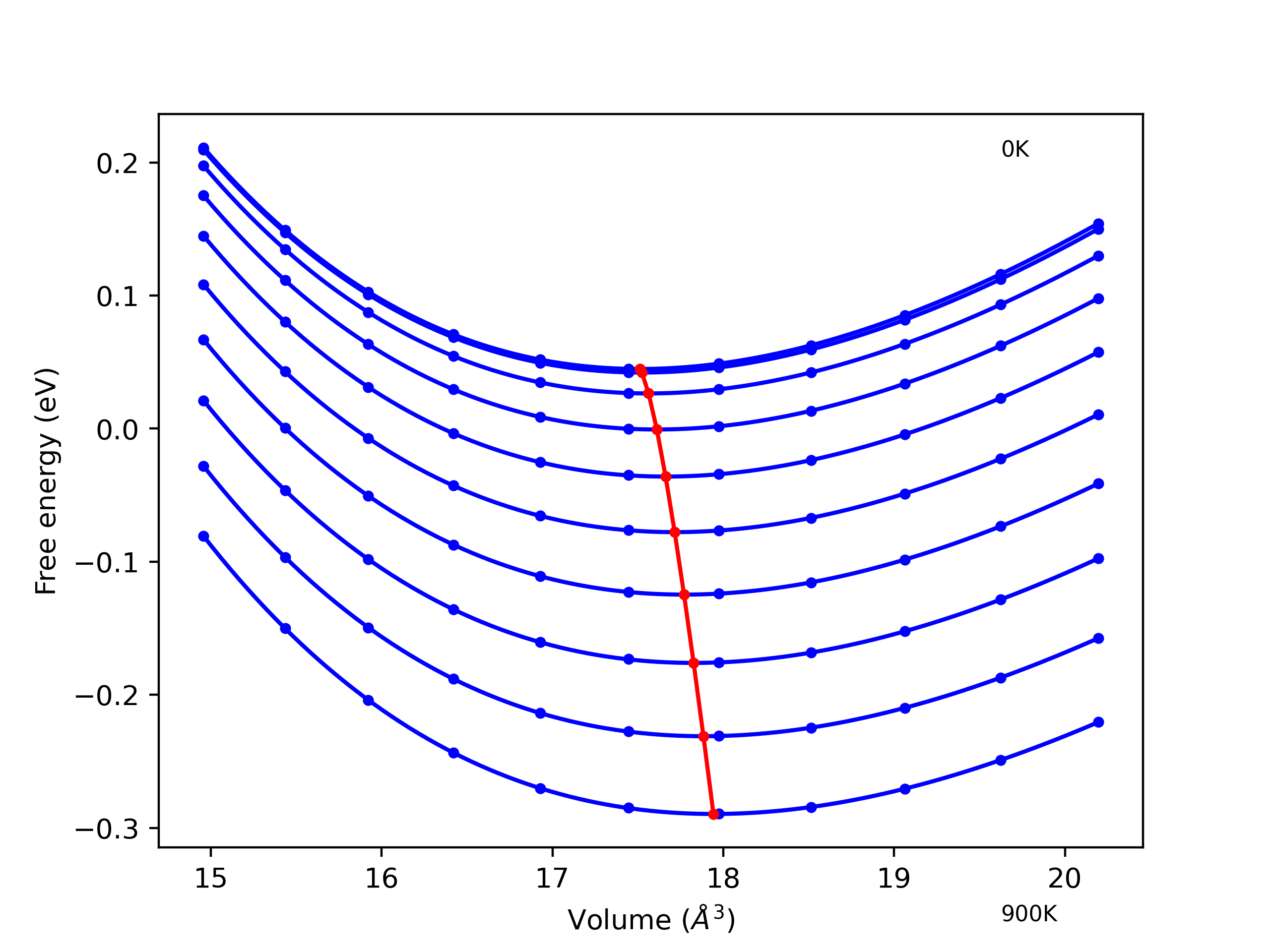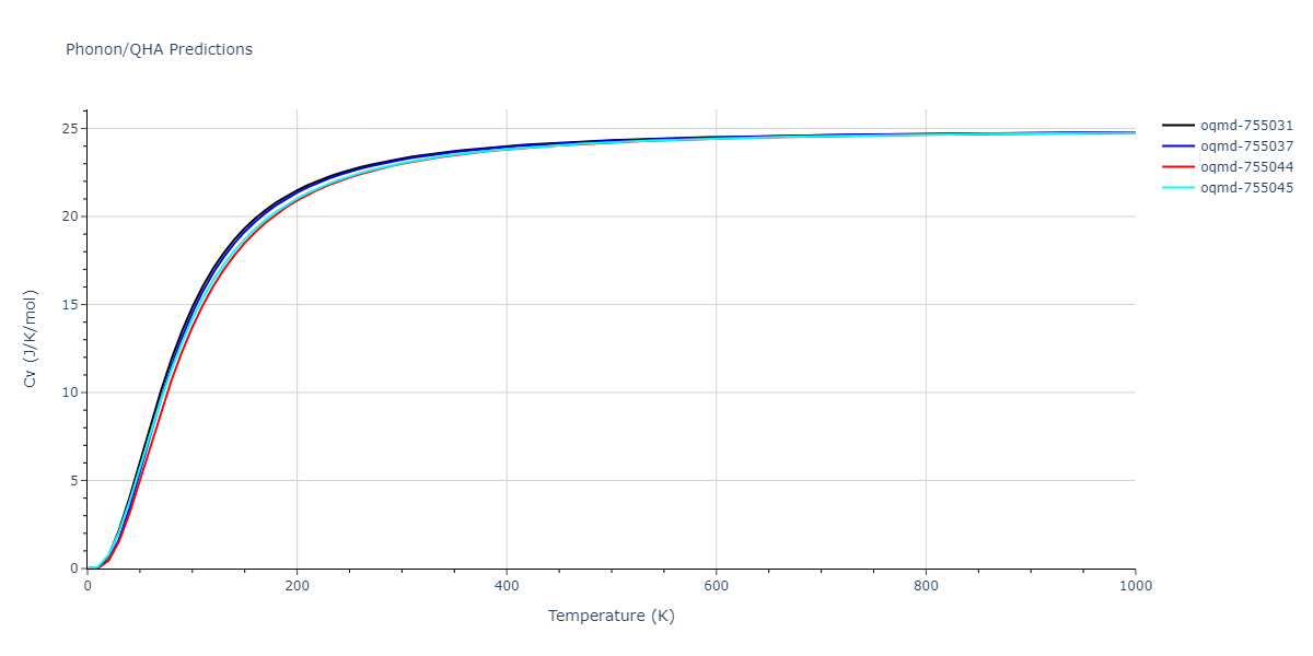 Plots of internal energy, Gibbs free energy, entropy, heat capacity and volume are shown here as a function of temperature for various crystal structures and liquid phases. The included crystal structures correspond to those in the Solid Structures vs. Temperature section, and the liquid phases to those in the Liquid Properties section. Internal energy and volume are taken from the associated structure relaxations mentioned in those previous sections. Constant pressure heat capacity is estimated using 3-point numerical derivatives of enthalpy versus temperature. Note that since all simulations done here are at 0 pressure, internal energy and enthalpy are equivalent.