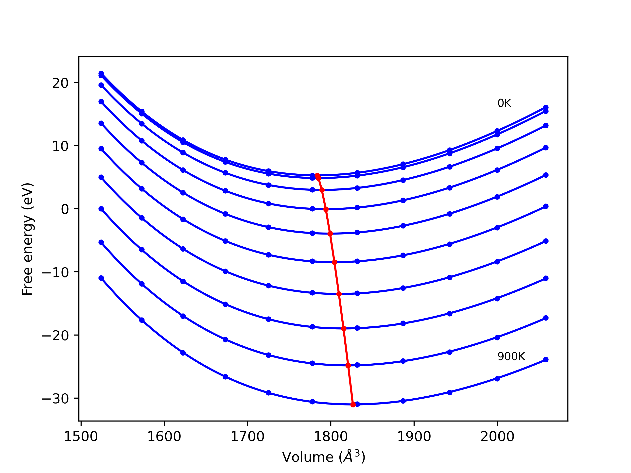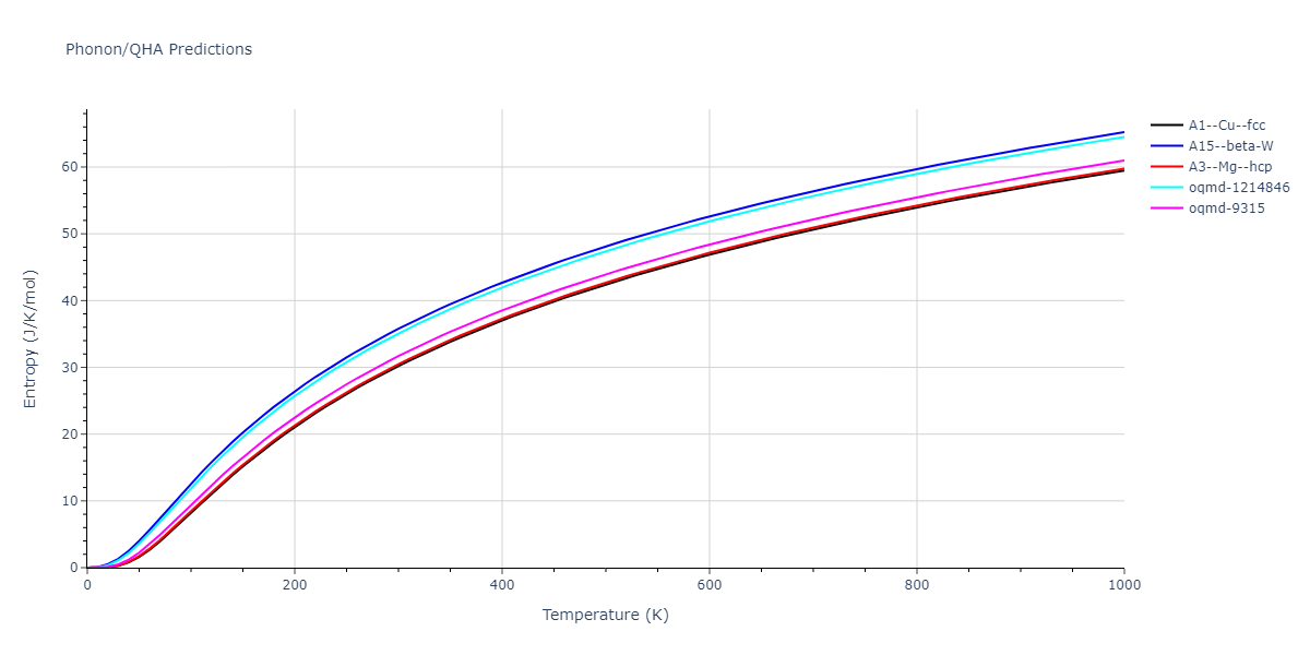 The Gibbs energies of the phases are estimated using thermodynamic integration between the interatomic potential in question and a simpler model with known Gibbs free energy values. For solids, the reference model is an Einstein solid, while for liquids it is the Uhlenbeck-Ford potential. Besides a short run at the start of the solid calculations to estimate Einstein model spring constants, the two calculations proceed similarly. Starting with the final relaxation configurations, the systems are stabilized for 25,000 steps. Then, over the next 50,000 steps the potential is swapped out for the reference potential. The system is then stabilized for another 25,000 steps with the reference model before a reverse swap of 50,000 steps is performed. The simulation ends with one final 25,000 step stabilization period. From the simulation, the irreversible work of transformation is estimated and used to compute the absolute Gibbs free energy of the target phase and potential relative to the reference potential. Entropy is estimated as the difference in enthalpy and Gibbs free energy and divided by temperature.