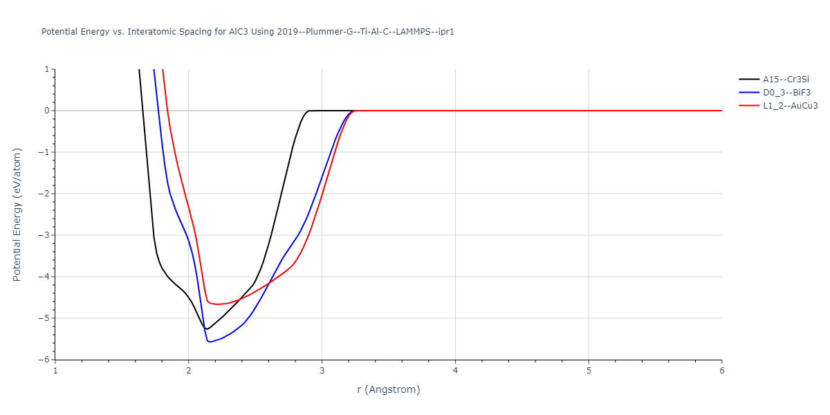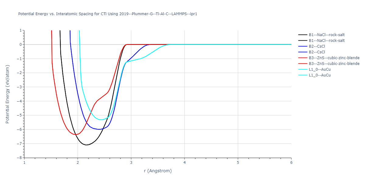 Plots of potential energy vs interatomic spacing, r, are shown below for a number of crystal structures. The structures are generated based on the ideal atomic positions and b/a and c/a lattice parameter ratios for a given crystal prototype. The size of the system is then uniformly scaled, and the energy calculated without relaxing the system. To obtain these plots, values of r are evaluated every 0.02 Å up to 6 Å.