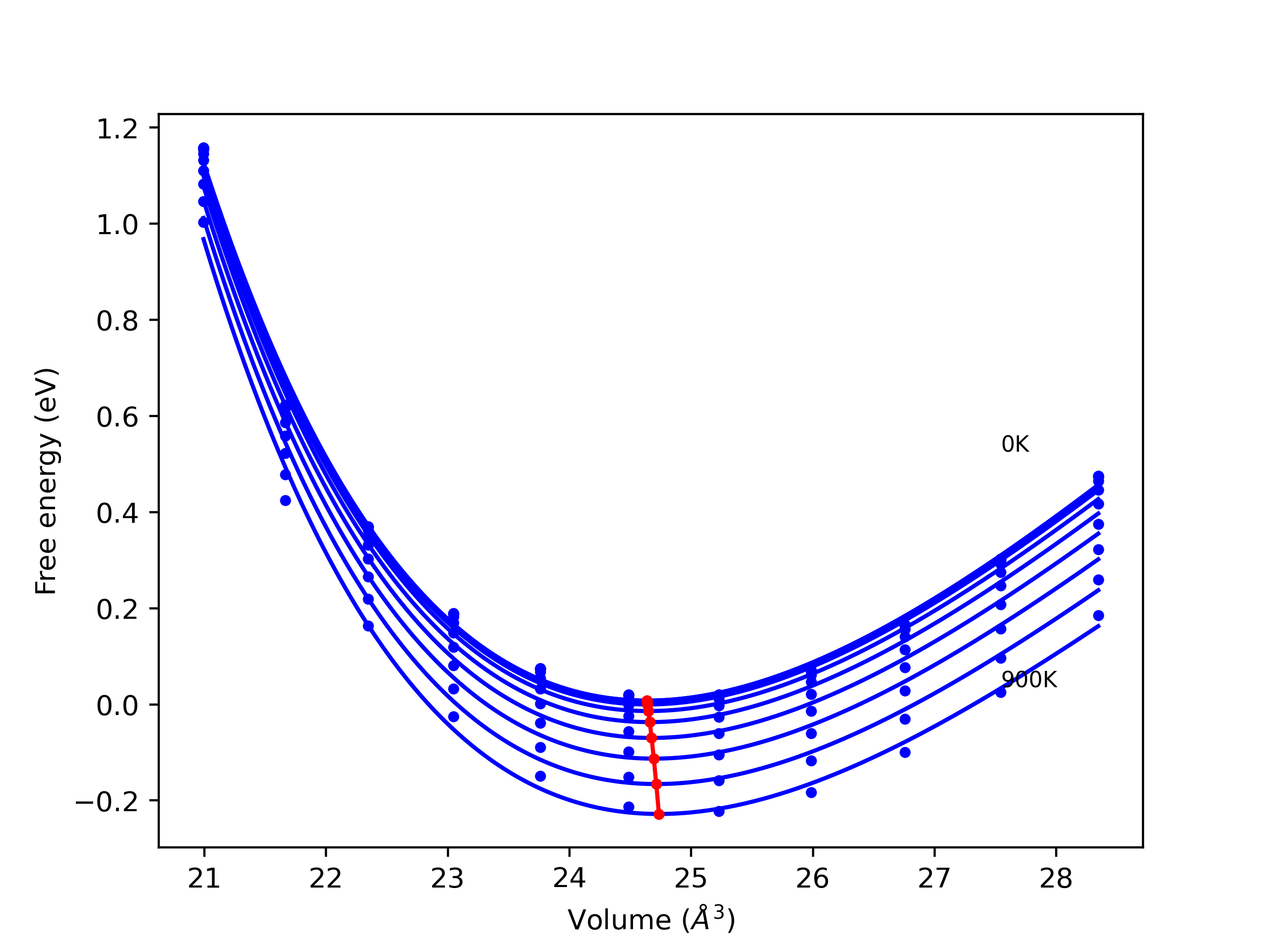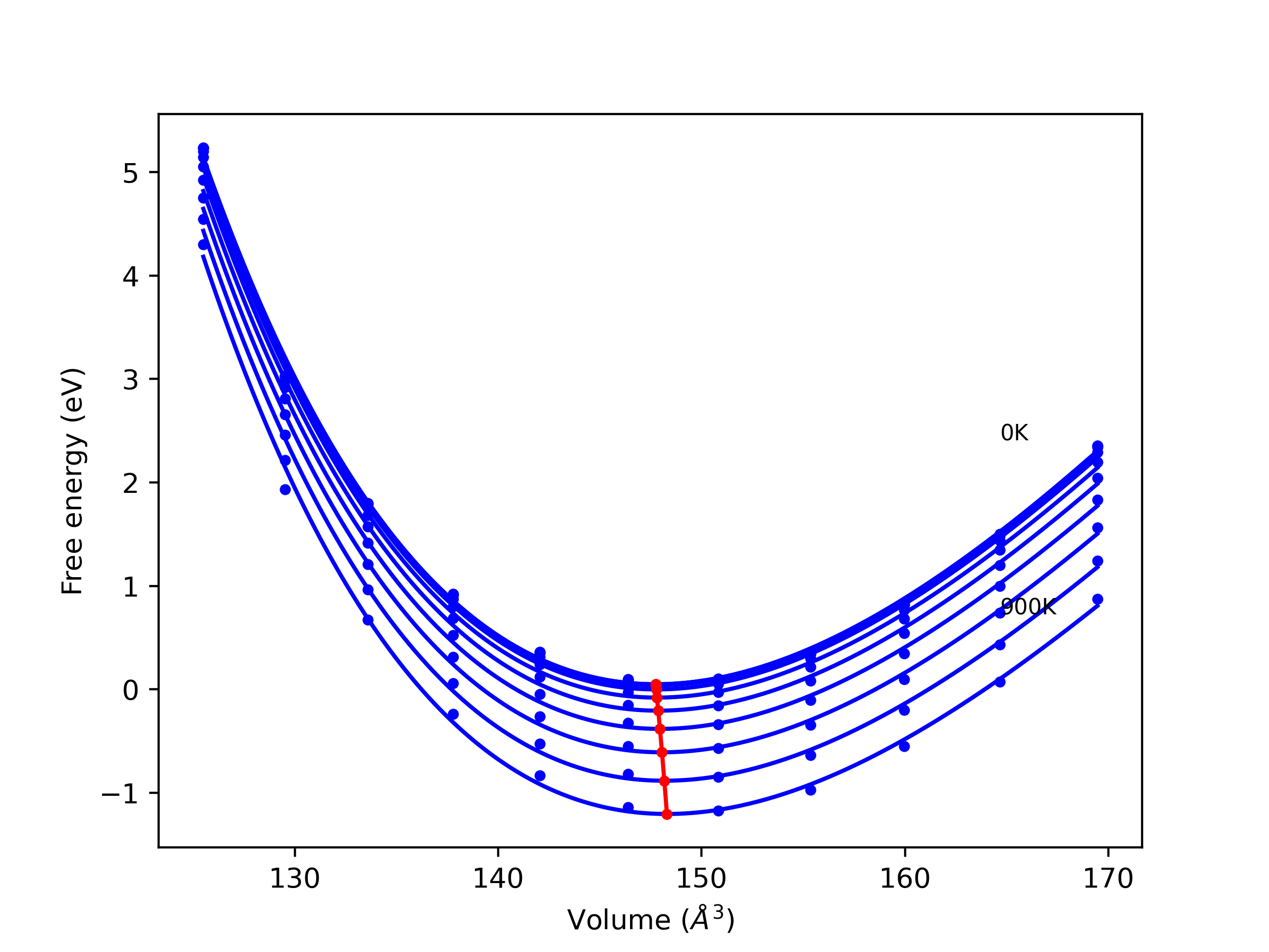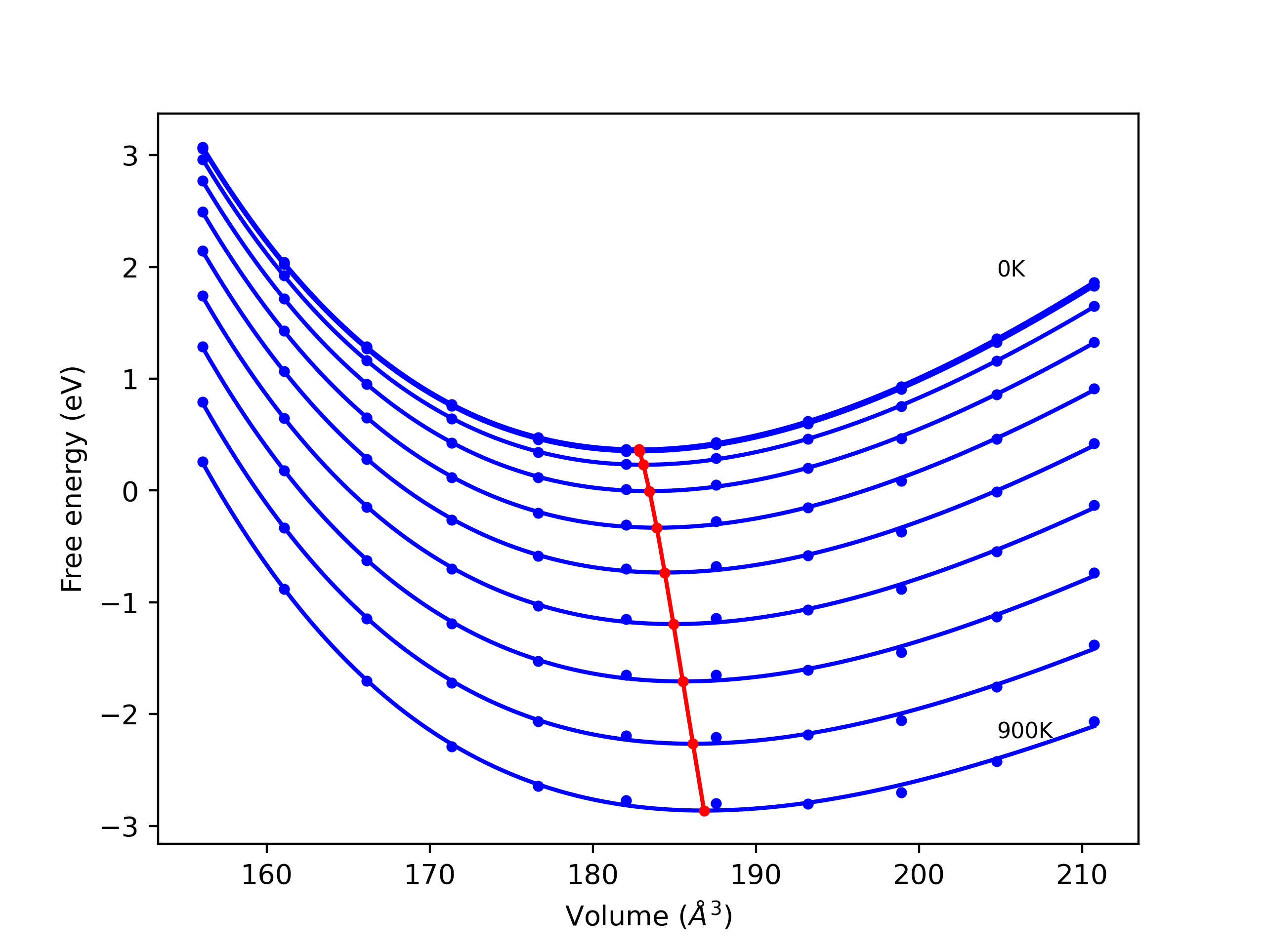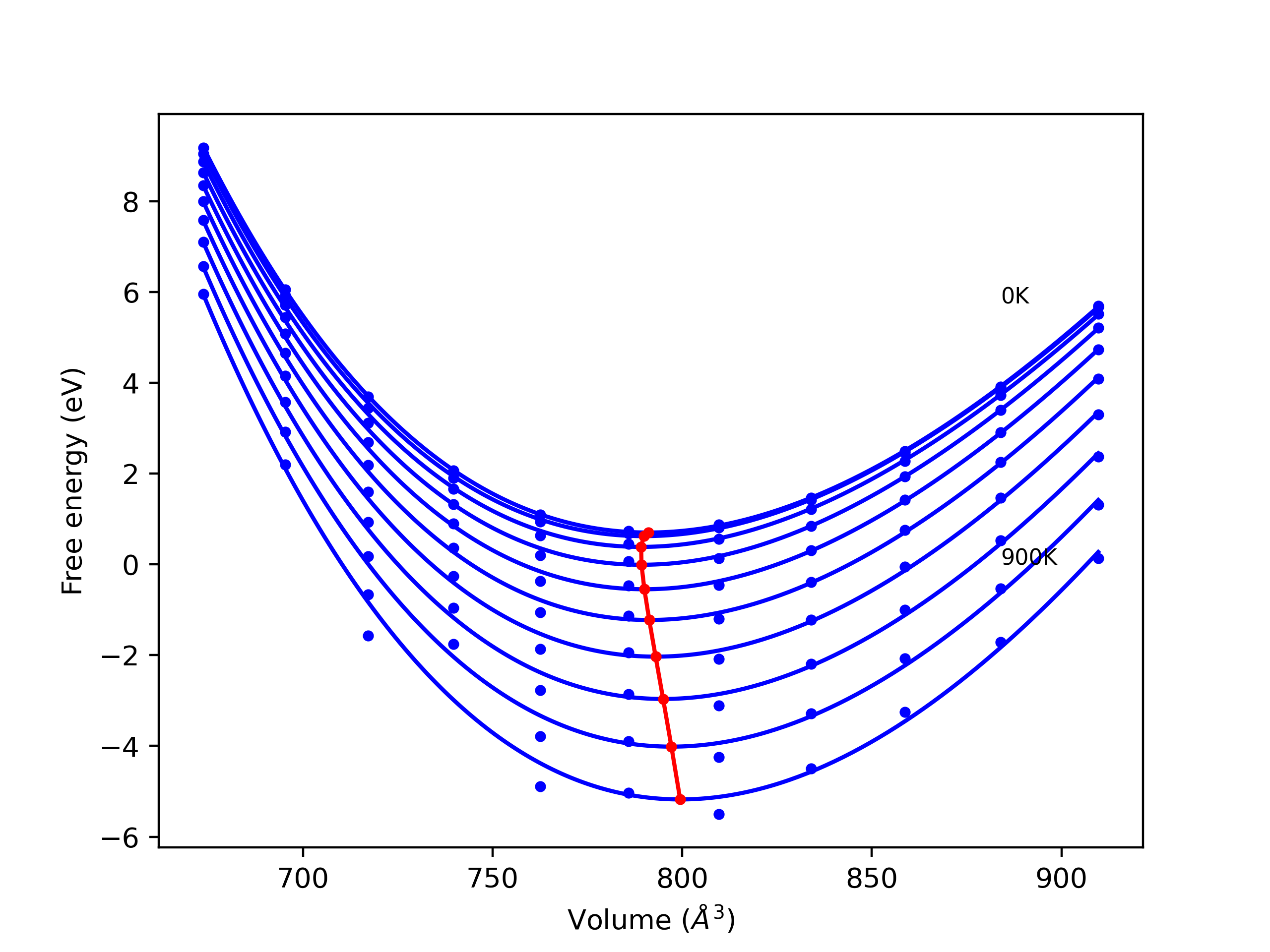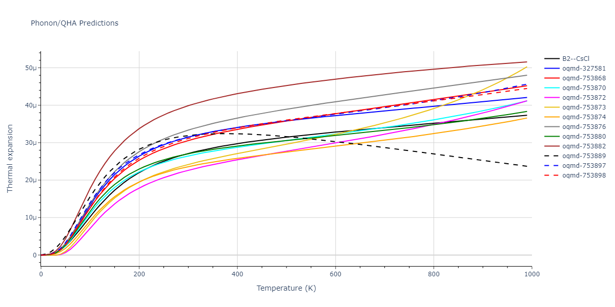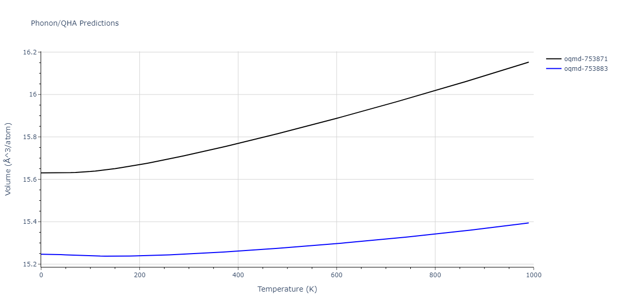 Plots of lattice and elastic constants are shown as a function of temperature. The 0K points were taken from the Crystal Structure Predictions and the Elastic Constants Predictions sections above for the unique crystal structures relaxed with the "dynamic" method. Starting from the 0 K relaxed crystal unit cells, supercell systems are created by replicating all three dimensions by the same multiplier to achieve at least 4000 atoms. The systems are then relaxed at 50 K and zero pressure using 1 million NPT steps. Lattice constants are estimated by averaging the measured box dimensions. Temperatures are iteratively increased by 50 K, with each subsequent relaxation calculation starting from the final atomic configuration at the previous temperature and relaxing for another 1 million steps.