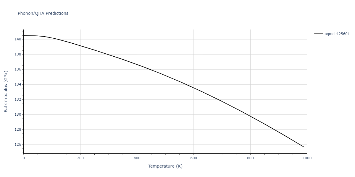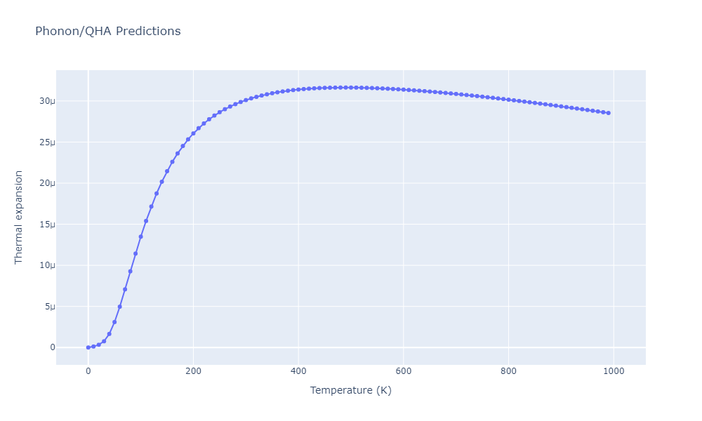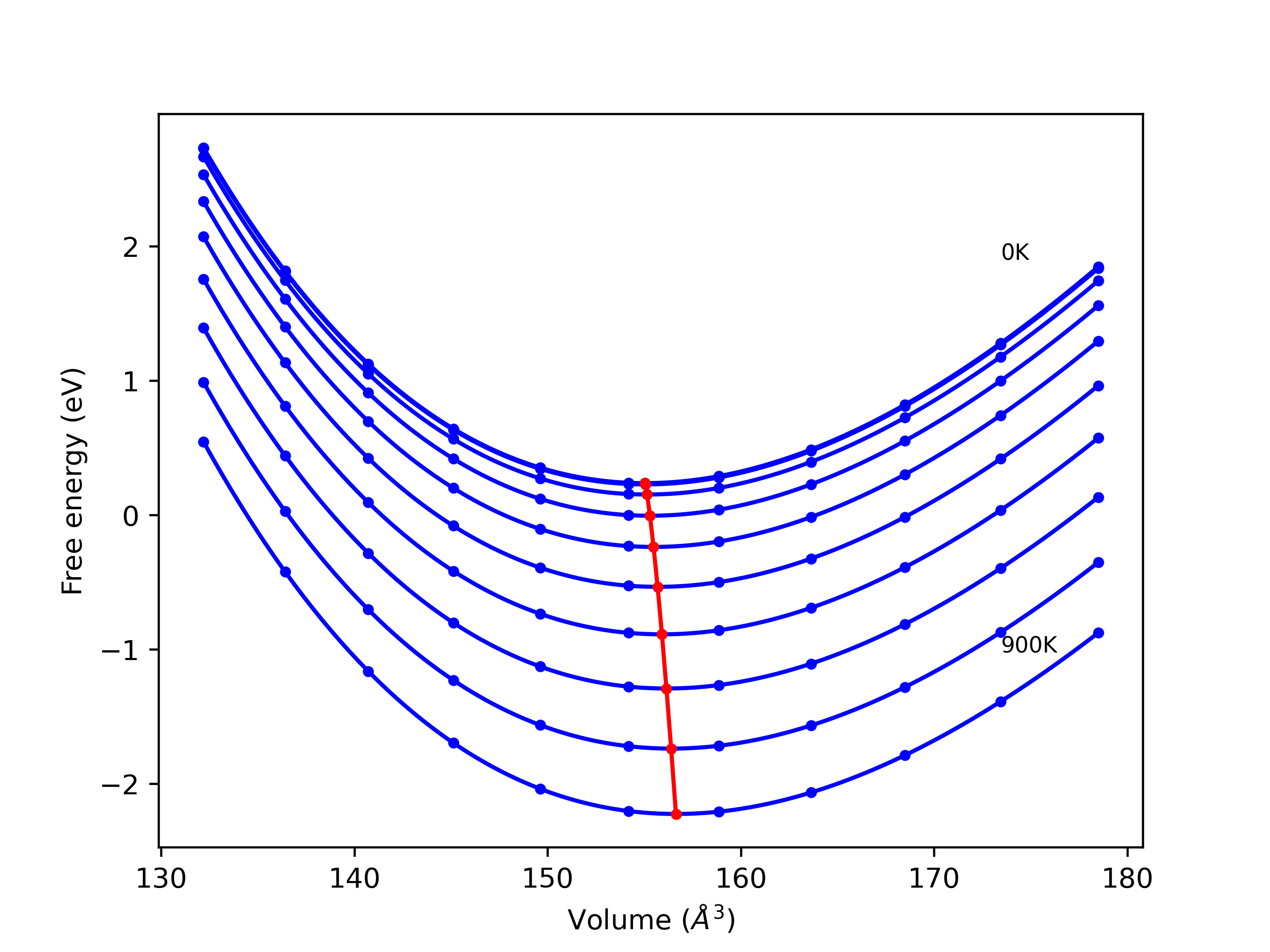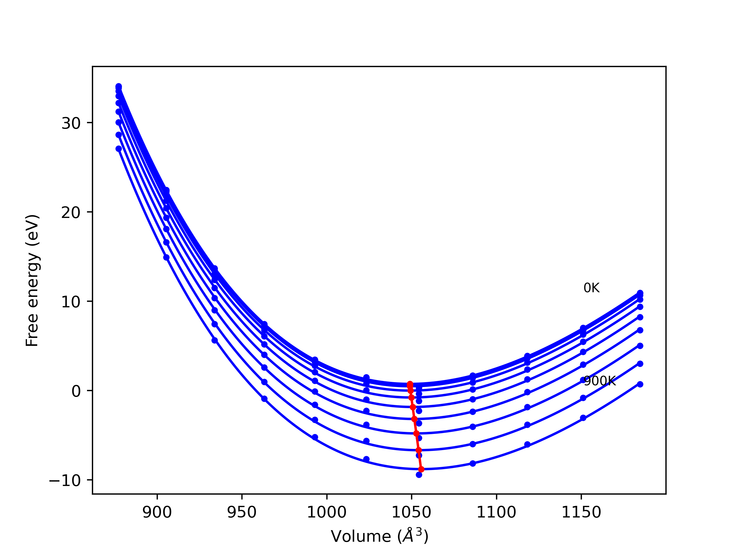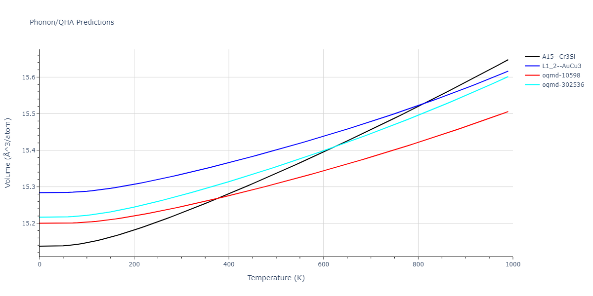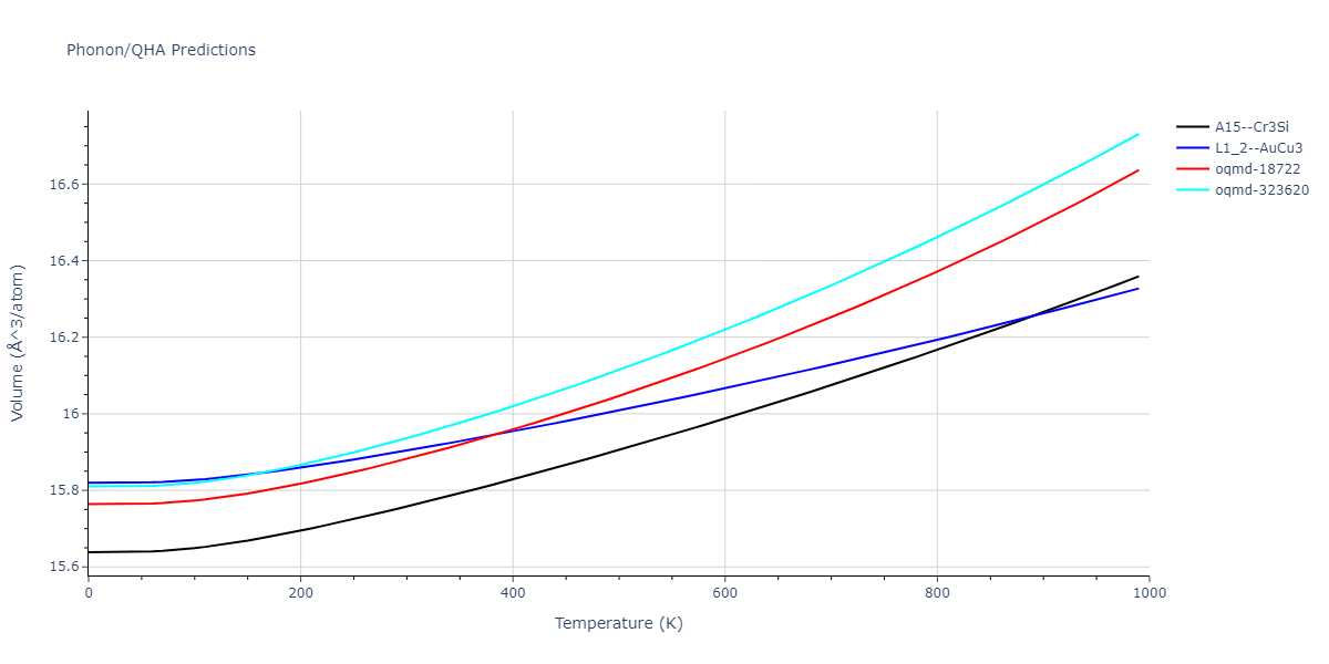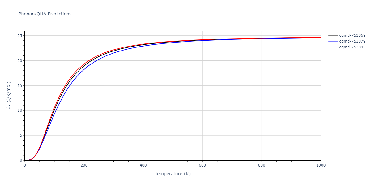 Plots of lattice and elastic constants are shown as a function of temperature. The 0K points were taken from the Crystal Structure Predictions and the Elastic Constants Predictions sections above for the unique crystal structures relaxed with the "dynamic" method. Starting from the 0 K relaxed crystal unit cells, supercell systems are created by replicating all three dimensions by the same multiplier to achieve at least 4000 atoms. The systems are then relaxed at 50 K and zero pressure using 1 million NPT steps. Lattice constants are estimated by averaging the measured box dimensions. Temperatures are iteratively increased by 50 K, with each subsequent relaxation calculation starting from the final atomic configuration at the previous temperature and relaxing for another 1 million steps.
