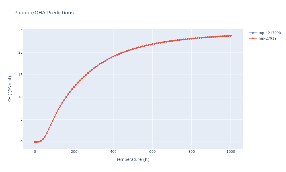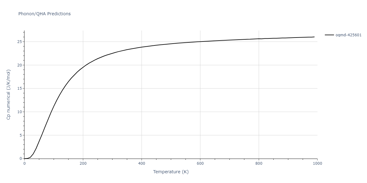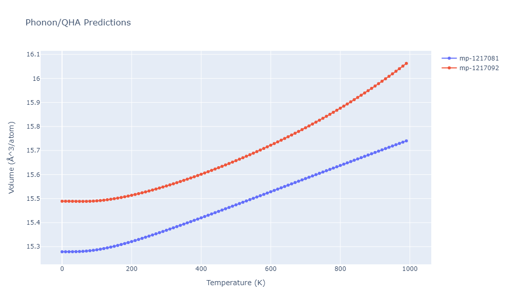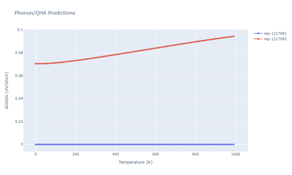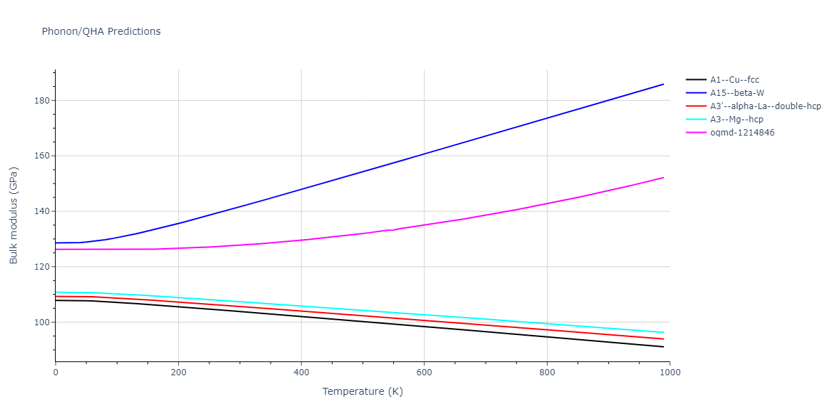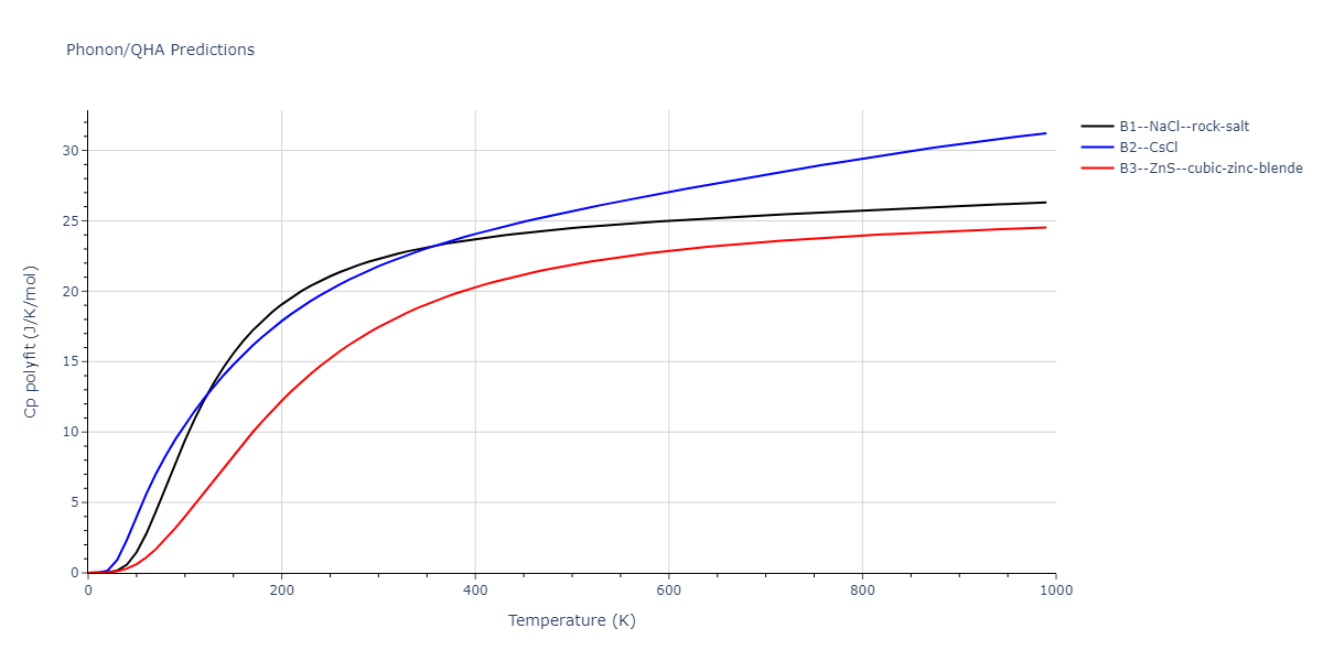Plots of internal energy, Gibbs free energy, entropy, heat capacity and volume are shown here as a function of temperature for various crystal structures and liquid phases. The included crystal structures correspond to those in the Solid Structures vs. Temperature section, and the liquid phases to those in the Liquid Properties section. Internal energy and volume are taken from the associated structure relaxations mentioned in those previous sections. Constant pressure heat capacity is estimated using 3-point numerical derivatives of enthalpy versus temperature. Note that since all simulations done here are at 0 pressure, internal energy and enthalpy are equivalent.