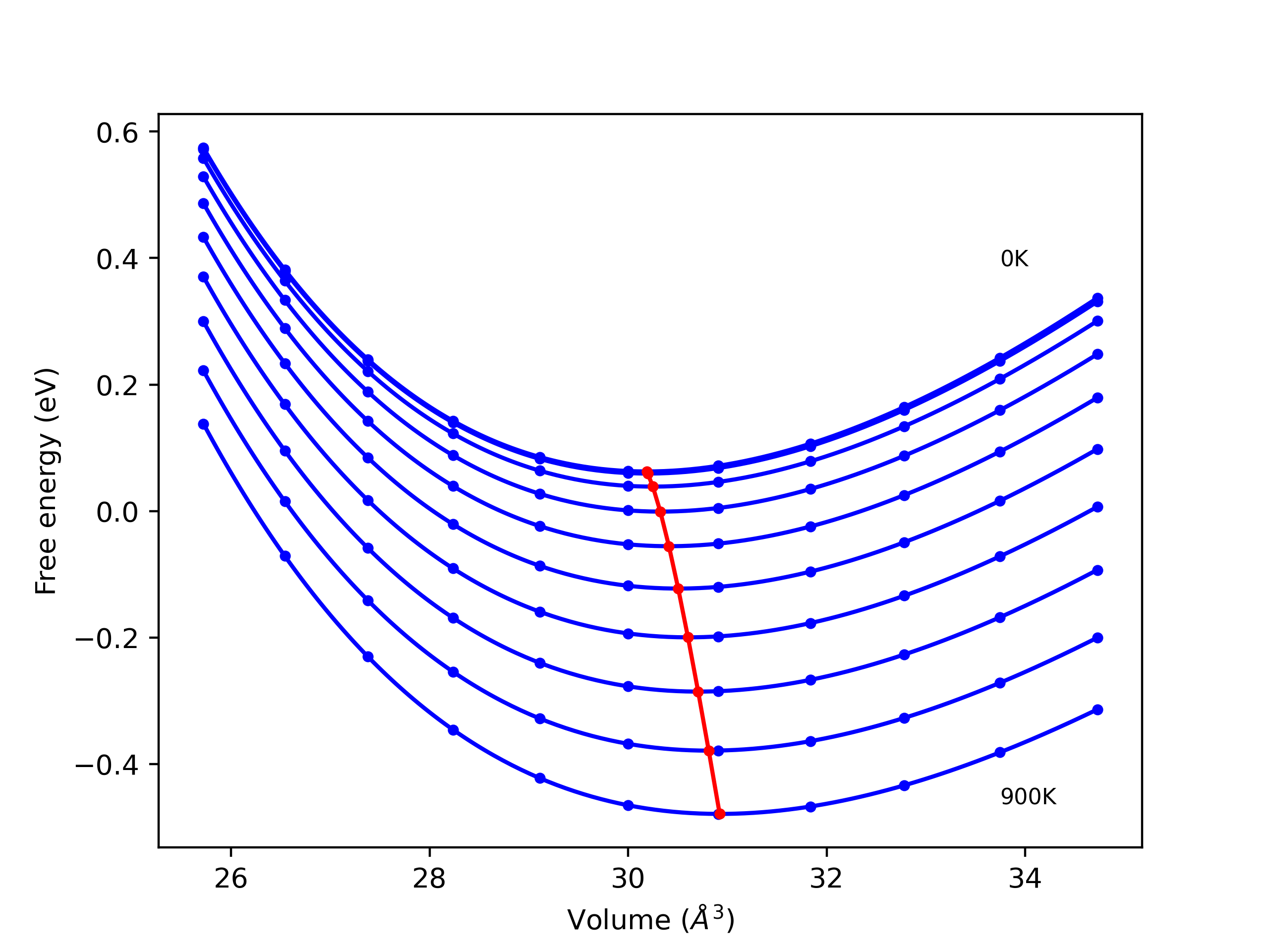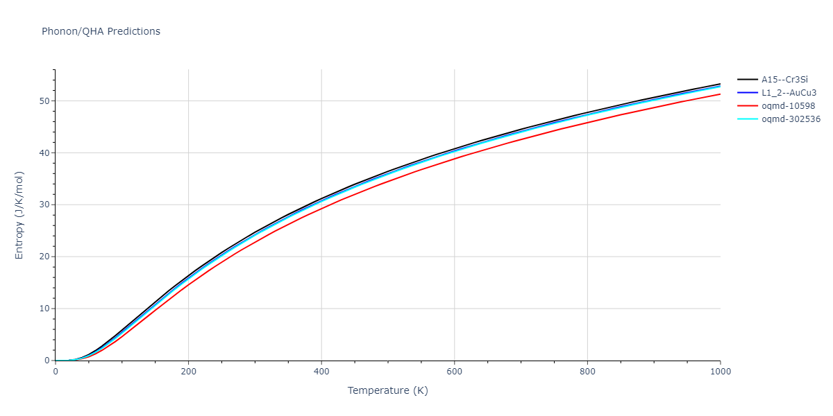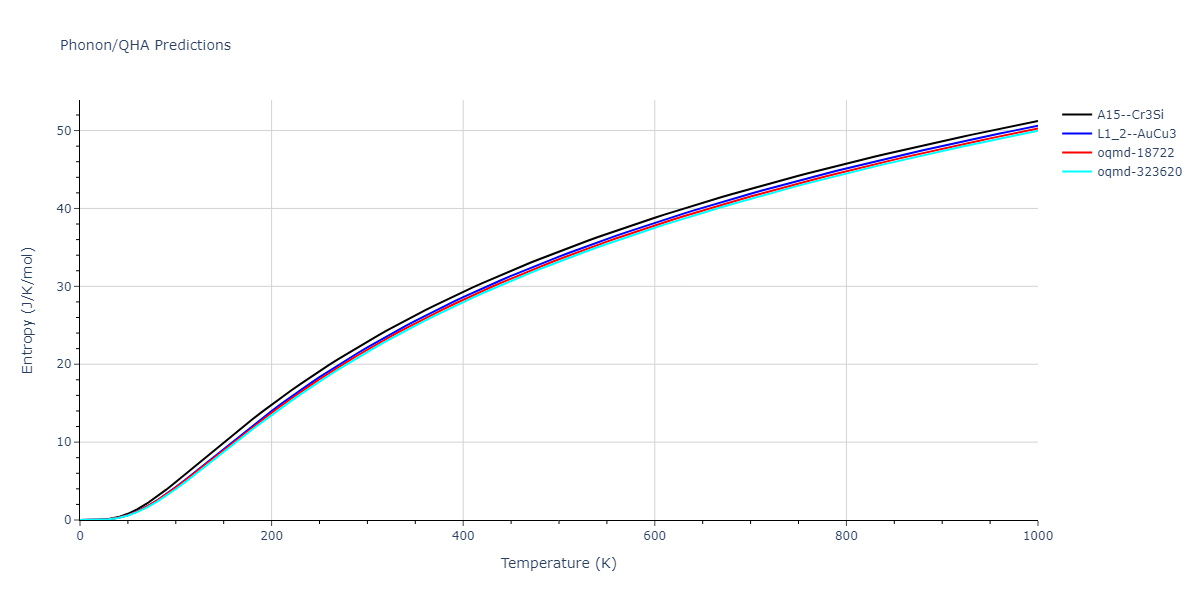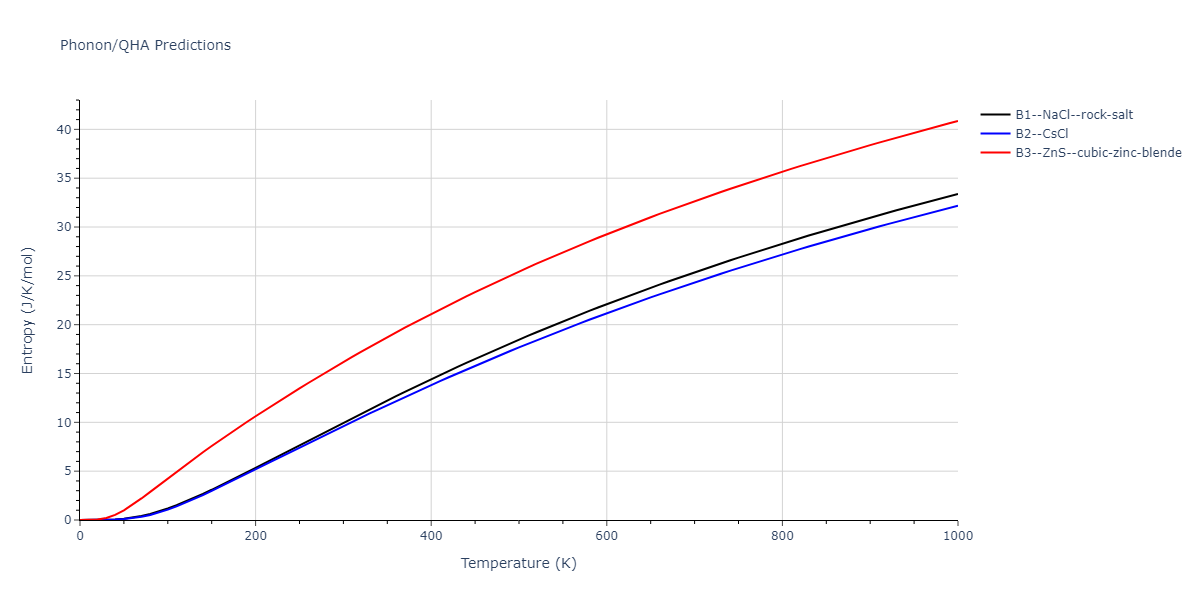 The Gibbs energies of the phases are estimated using thermodynamic integration between the interatomic potential in question and a simpler model with known Gibbs free energy values. For solids, the reference model is an Einstein solid, while for liquids it is the Uhlenbeck-Ford potential. Besides a short run at the start of the solid calculations to estimate Einstein model spring constants, the two calculations proceed similarly. Starting with the final relaxation configurations, the systems are stabilized for 25,000 steps. Then, over the next 50,000 steps the potential is swapped out for the reference potential. The system is then stabilized for another 25,000 steps with the reference model before a reverse swap of 50,000 steps is performed. The simulation ends with one final 25,000 step stabilization period. From the simulation, the irreversible work of transformation is estimated and used to compute the absolute Gibbs free energy of the target phase and potential relative to the reference potential. Entropy is estimated as the difference in enthalpy and Gibbs free energy and divided by temperature.
