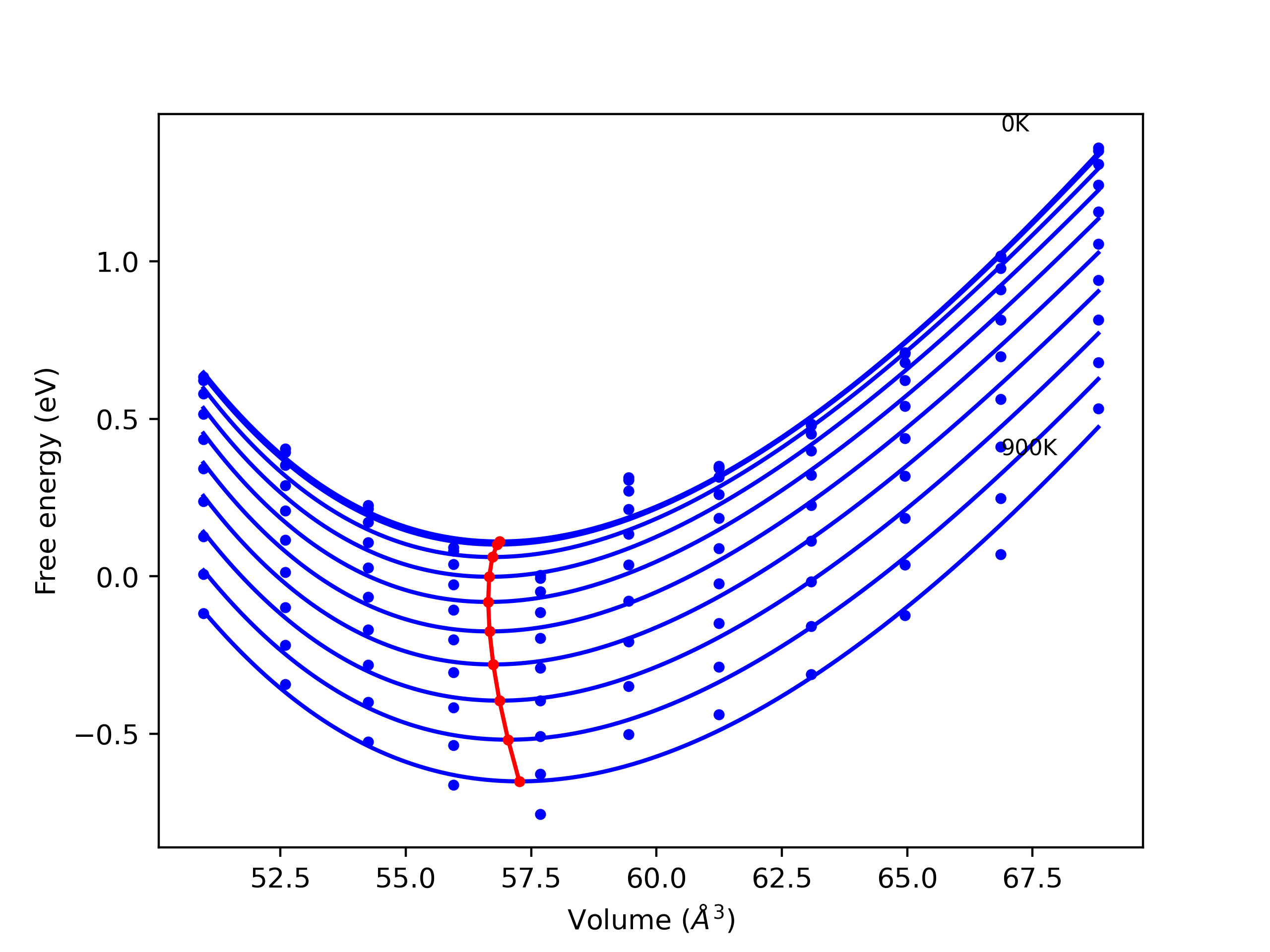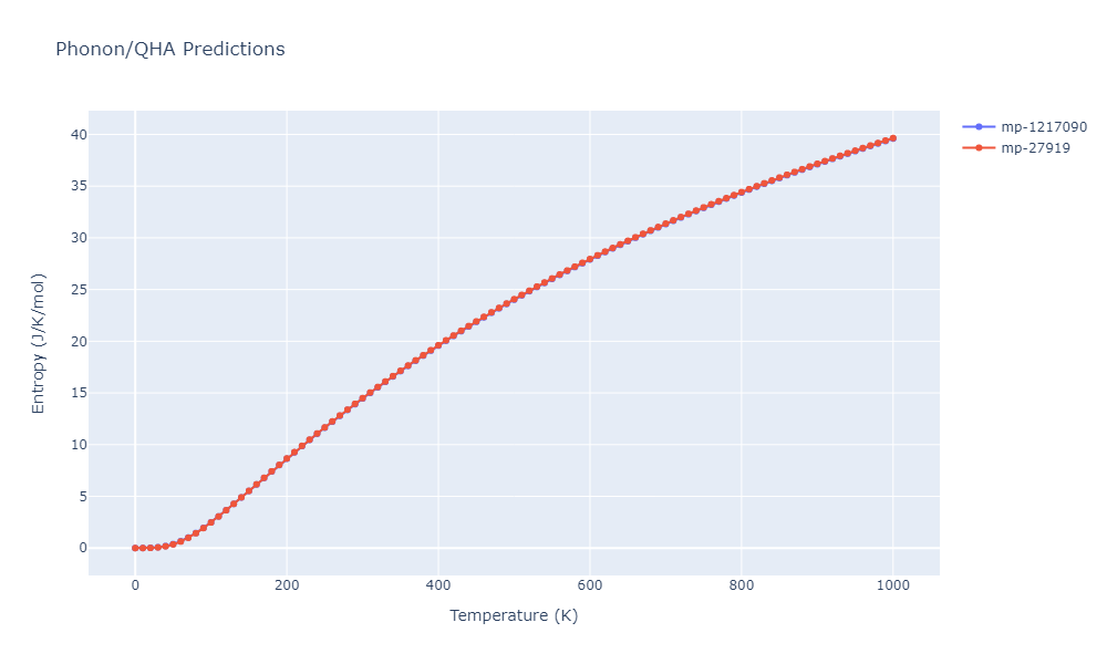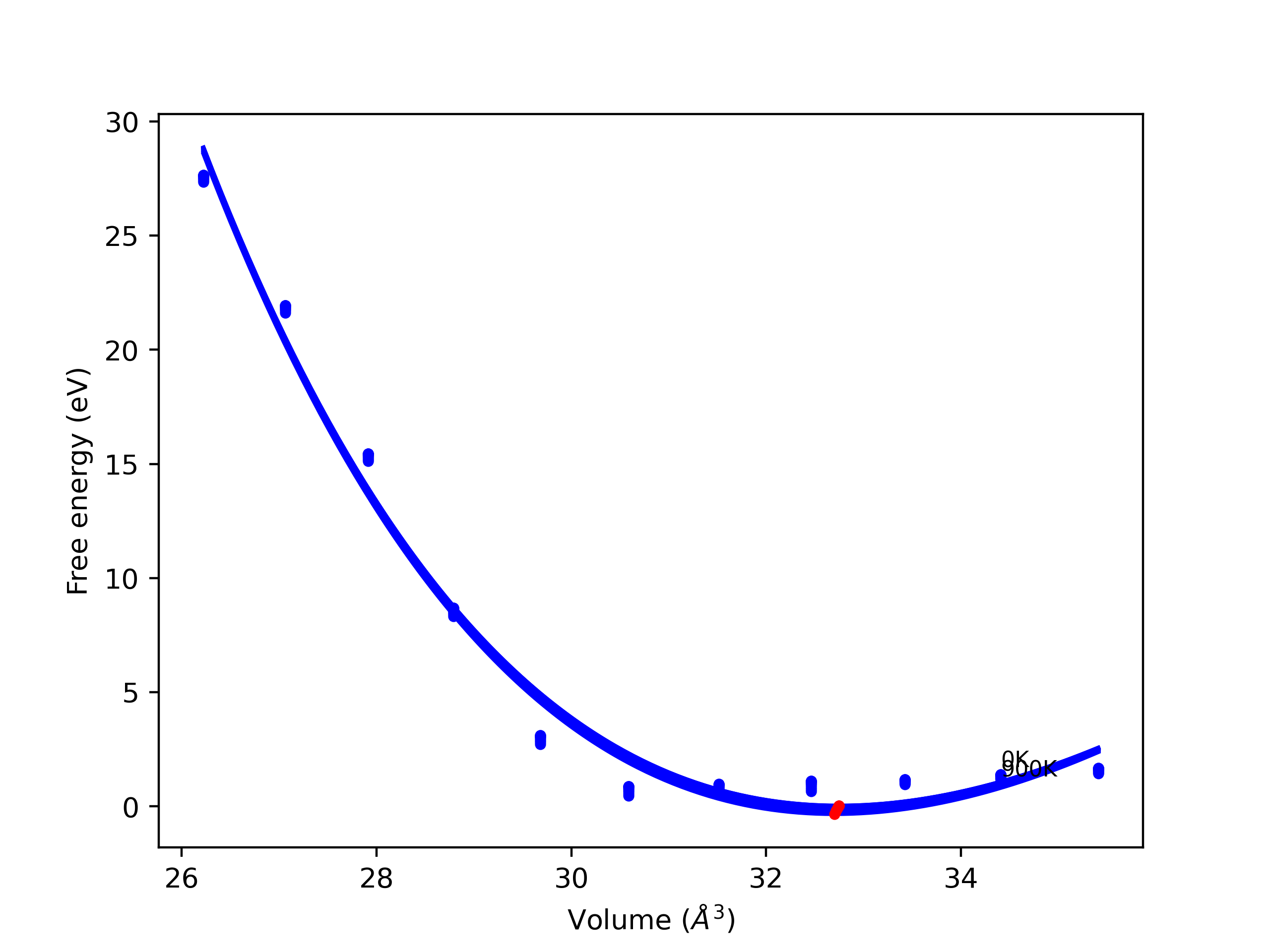 The Gibbs energies of the phases are estimated using thermodynamic integration between the interatomic potential in question and a simpler model with known Gibbs free energy values. For solids, the reference model is an Einstein solid, while for liquids it is the Uhlenbeck-Ford potential. Besides a short run at the start of the solid calculations to estimate Einstein model spring constants, the two calculations proceed similarly. Starting with the final relaxation configurations, the systems are stabilized for 25,000 steps. Then, over the next 50,000 steps the potential is swapped out for the reference potential. The system is then stabilized for another 25,000 steps with the reference model before a reverse swap of 50,000 steps is performed. The simulation ends with one final 25,000 step stabilization period. From the simulation, the irreversible work of transformation is estimated and used to compute the absolute Gibbs free energy of the target phase and potential relative to the reference potential. Entropy is estimated as the difference in enthalpy and Gibbs free energy and divided by temperature.