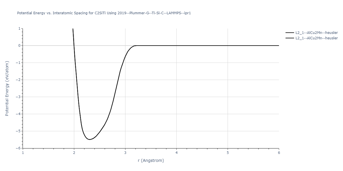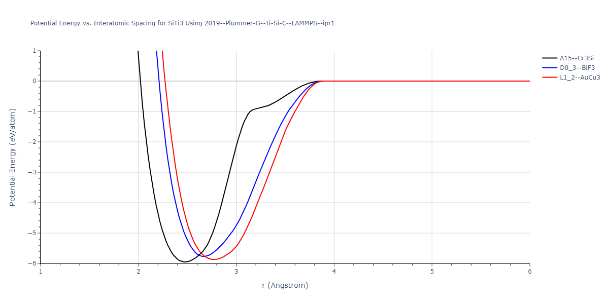 Plots of potential energy vs interatomic spacing, r, are shown below for a number of crystal structures. The structures are generated based on the ideal atomic positions and b/a and c/a lattice parameter ratios for a given crystal prototype. The size of the system is then uniformly scaled, and the energy calculated without relaxing the system. To obtain these plots, values of r are evaluated every 0.02 Å up to 6 Å.