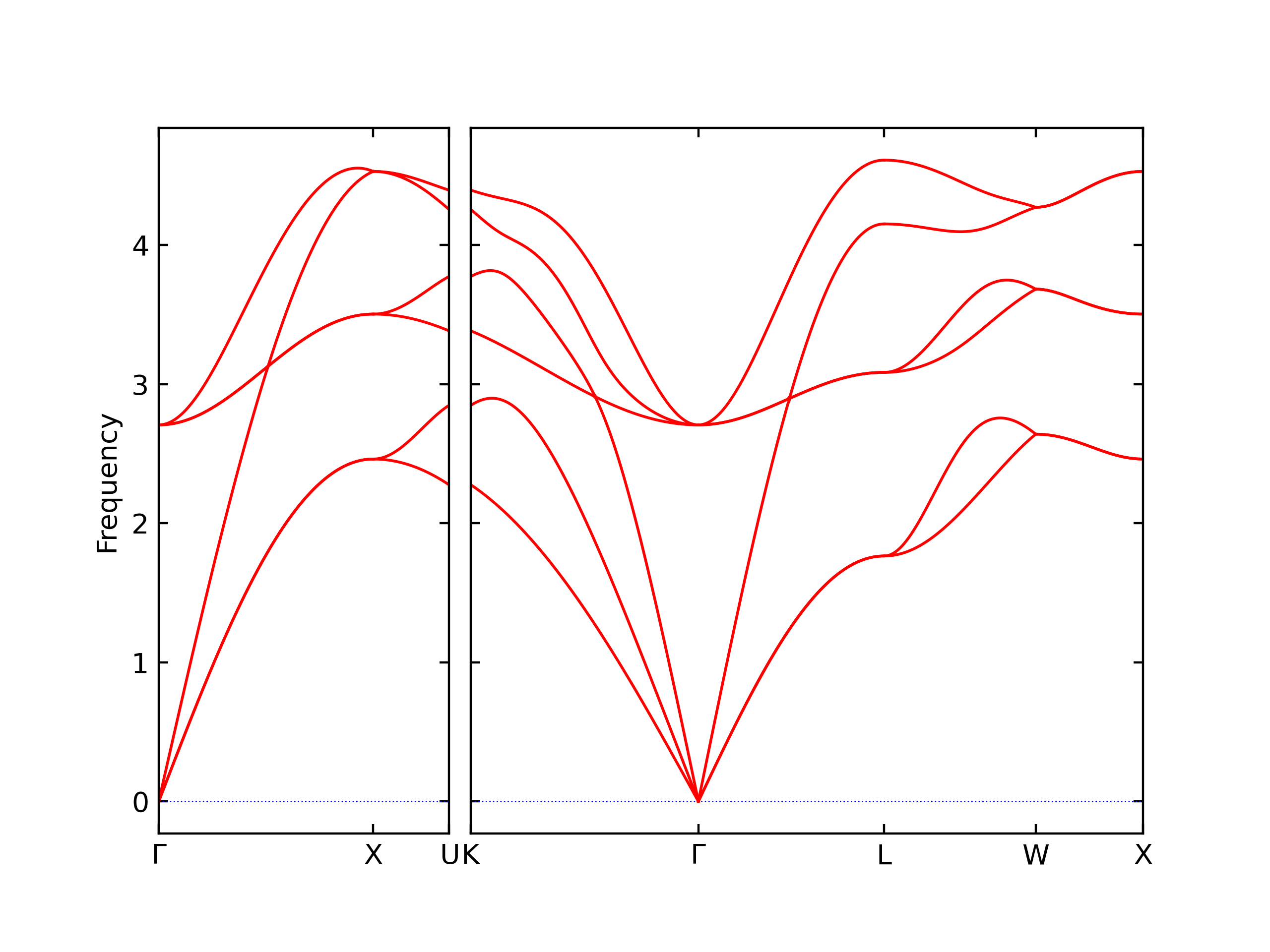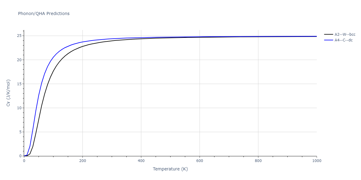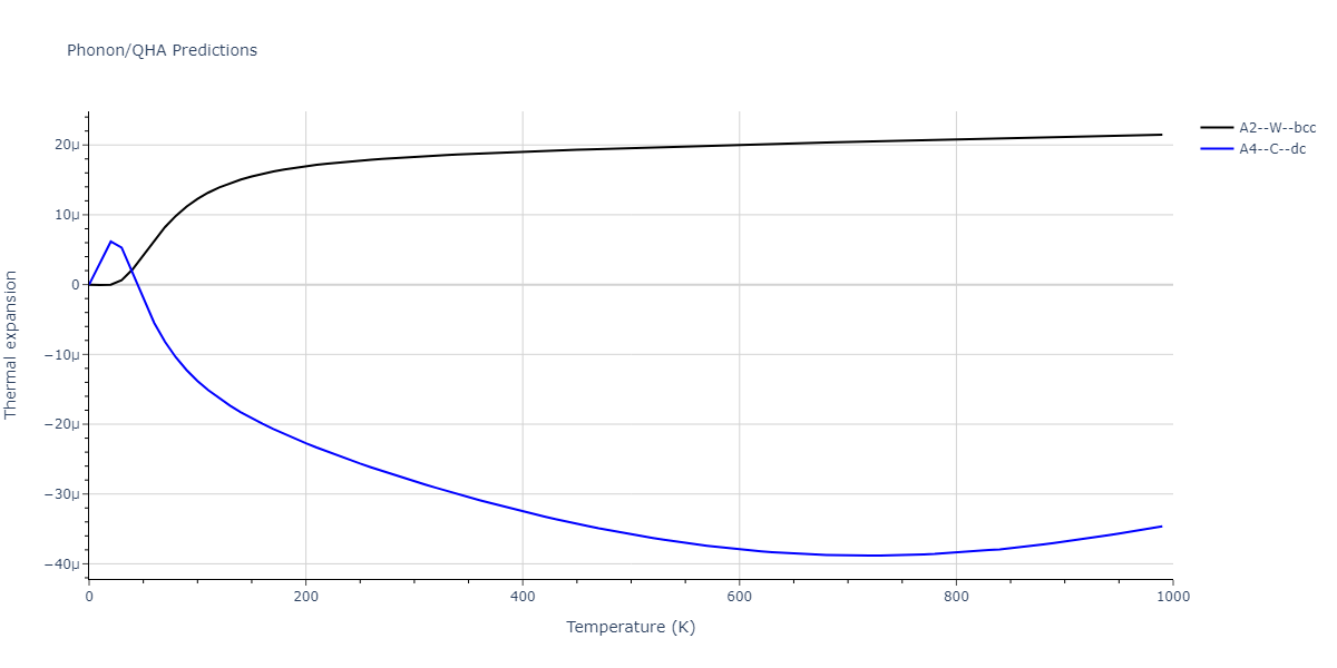 Phonon band structures and crystal properties estimated from quasi-harmonic approximation (QHA) calculations are displayed for select crystals. The calculations were performed using phonopy and LAMMPS. For the phonon calculations, 3x3 supercells of the potential-specific relaxed crystals were used. The QHA calculations were based on 11 strain states ranging from -0.05 to 0.05.