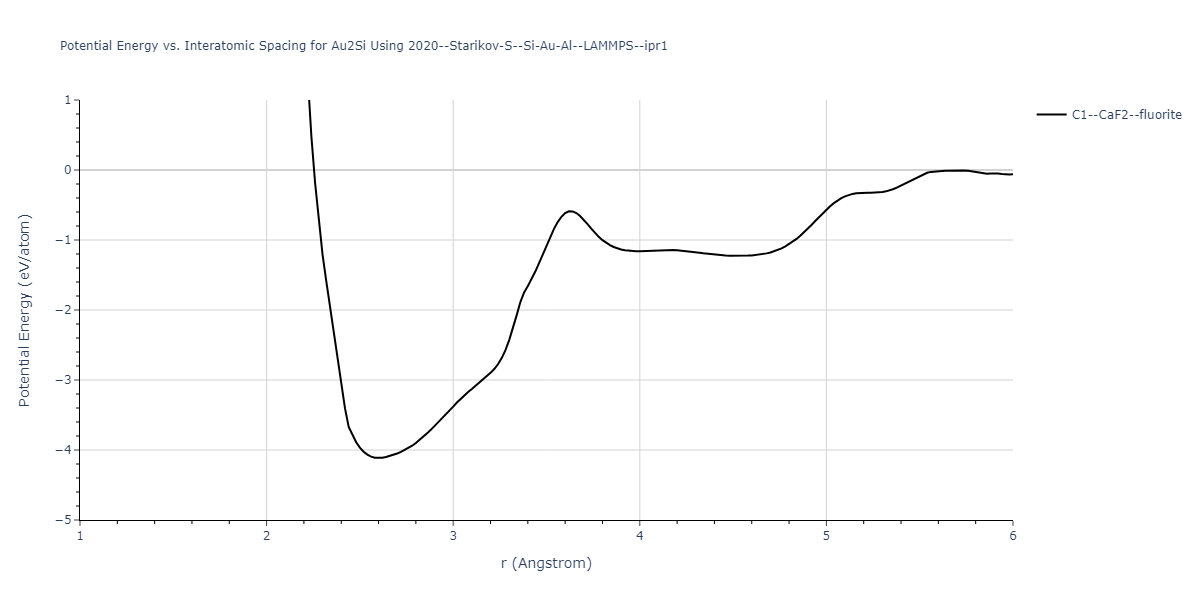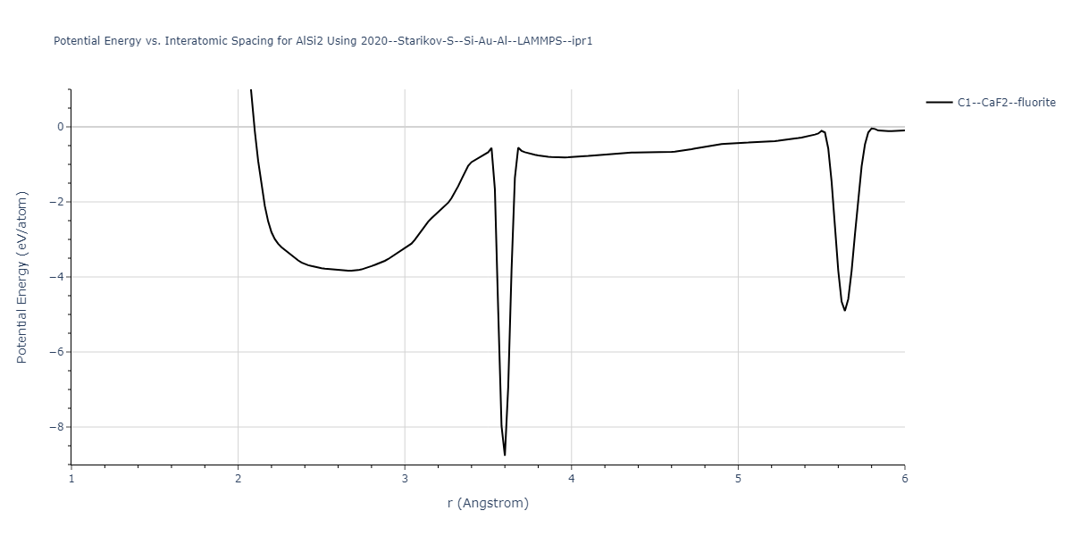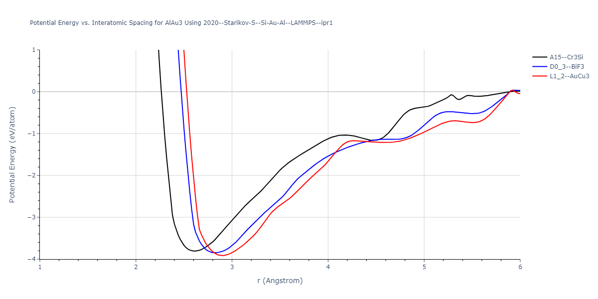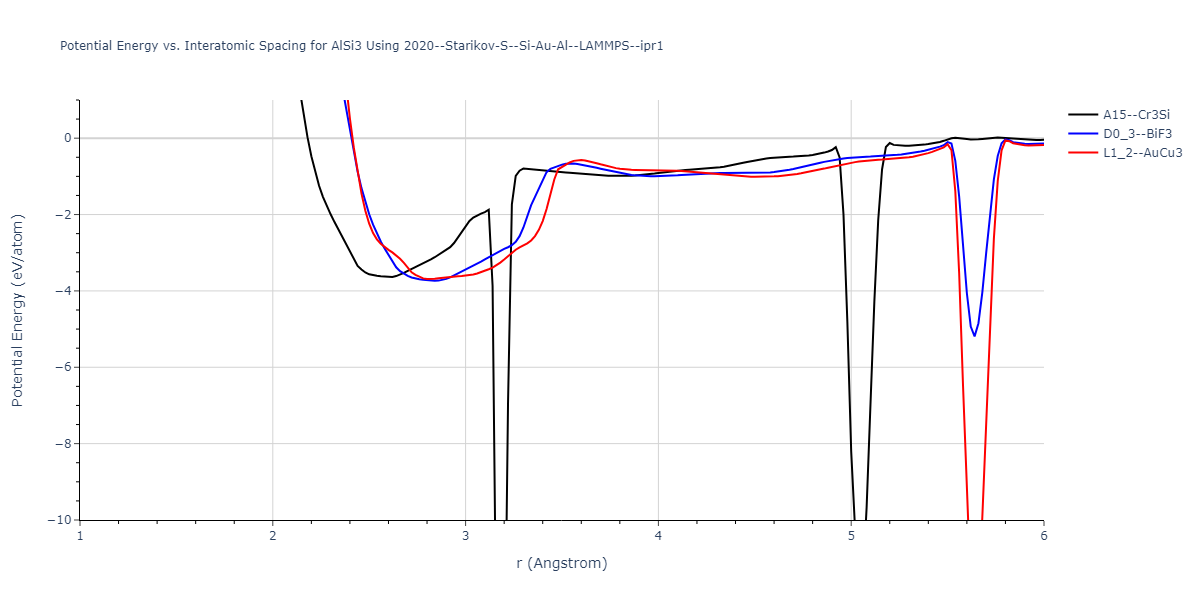 Plots of potential energy vs interatomic spacing, r, are shown below for a number of crystal structures. The structures are generated based on the ideal atomic positions and b/a and c/a lattice parameter ratios for a given crystal prototype. The size of the system is then uniformly scaled, and the energy calculated without relaxing the system. To obtain these plots, values of r are evaluated every 0.02 Å up to 6 Å.