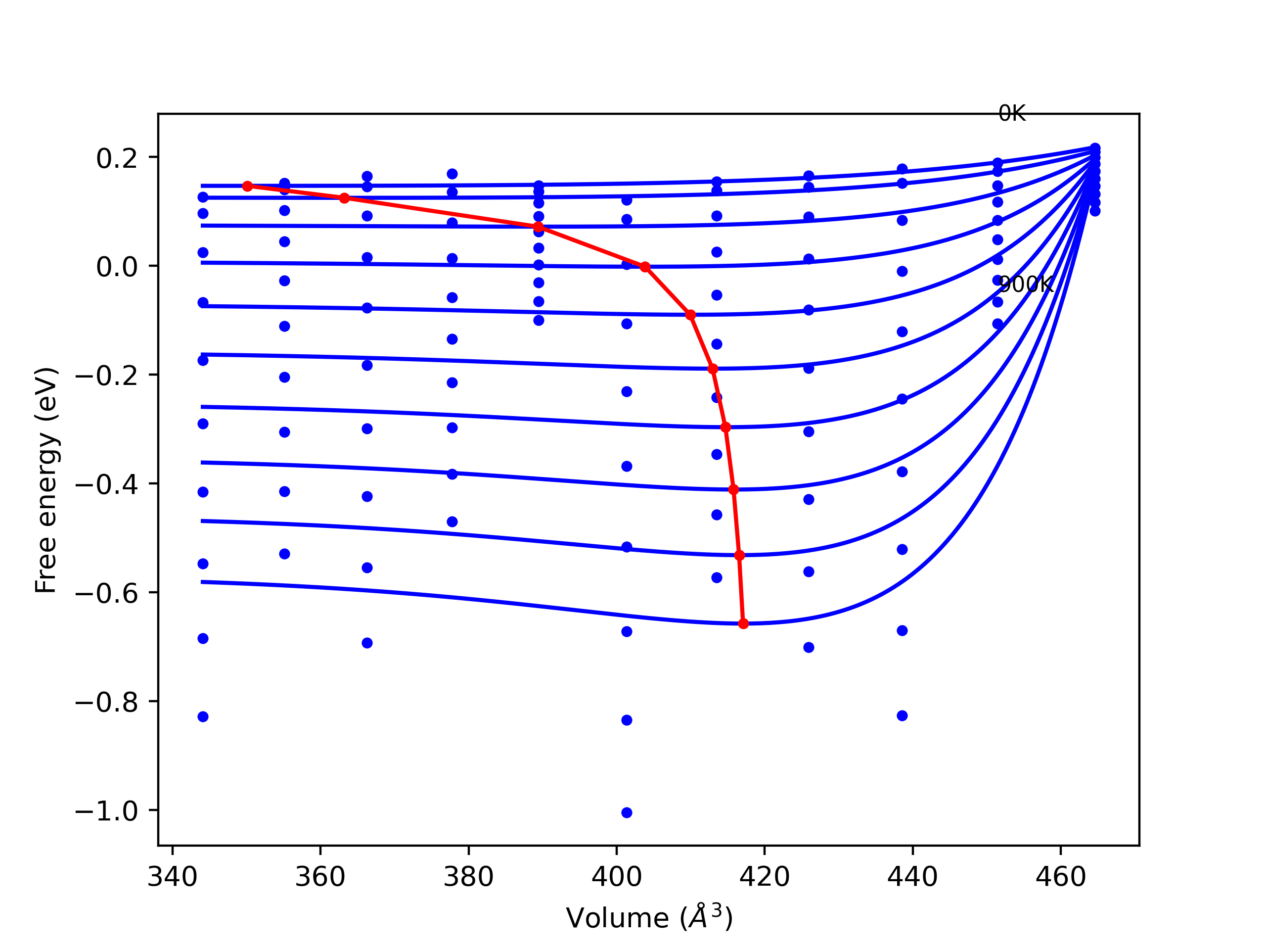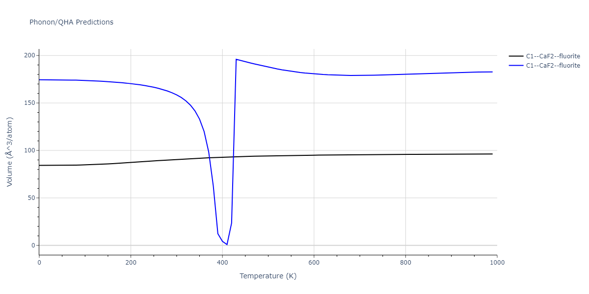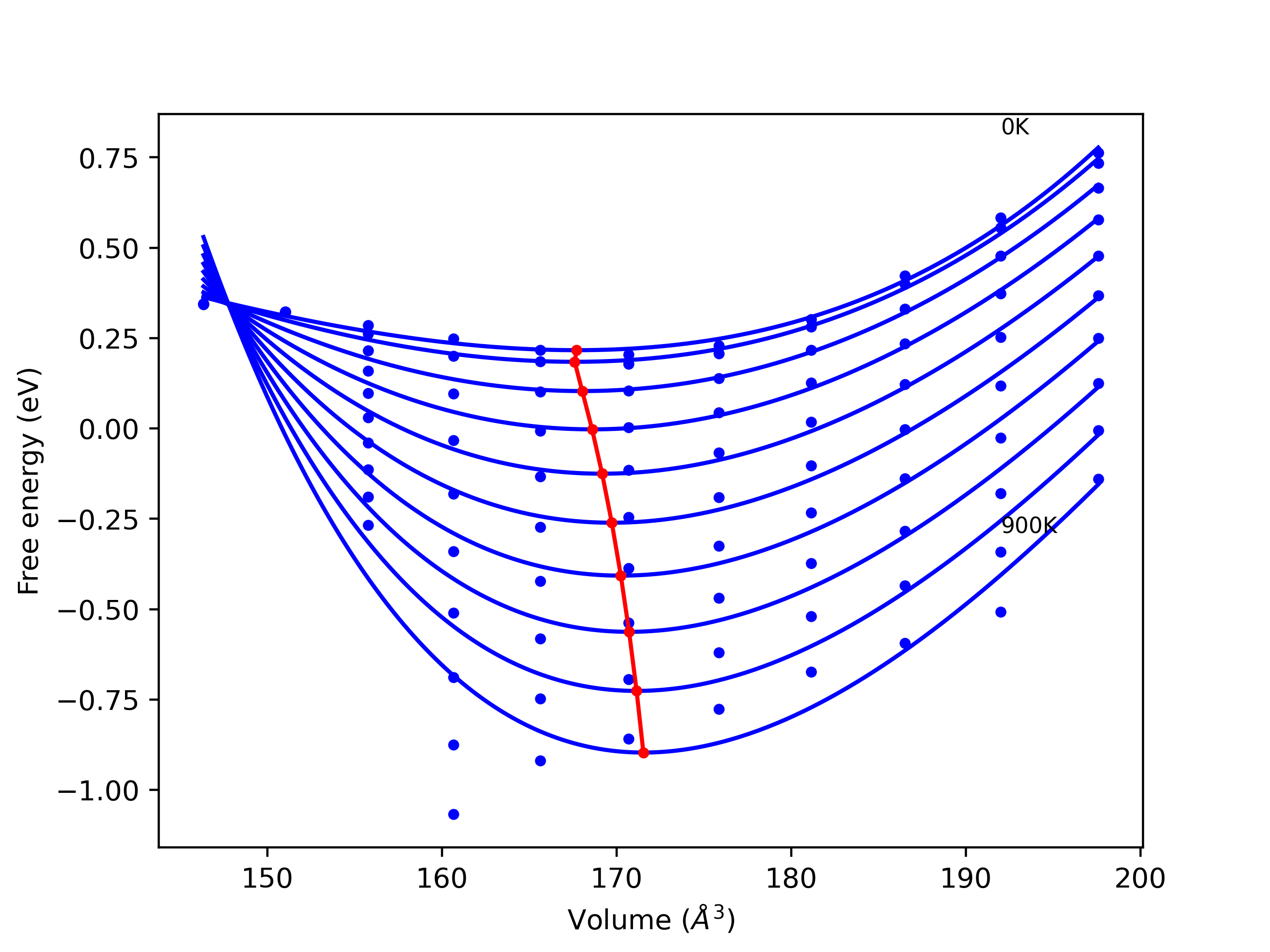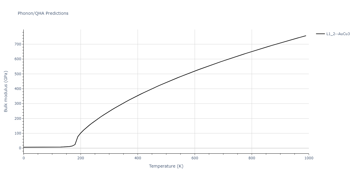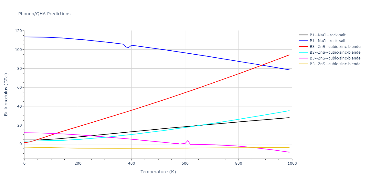 Plots of lattice and elastic constants are shown as a function of temperature. The 0K points were taken from the Crystal Structure Predictions and the Elastic Constants Predictions sections above for the unique crystal structures relaxed with the "dynamic" method. Starting from the 0 K relaxed crystal unit cells, supercell systems are created by replicating all three dimensions by the same multiplier to achieve at least 4000 atoms. The systems are then relaxed at 50 K and zero pressure using 1 million NPT steps. Lattice constants are estimated by averaging the measured box dimensions. Temperatures are iteratively increased by 50 K, with each subsequent relaxation calculation starting from the final atomic configuration at the previous temperature and relaxing for another 1 million steps.