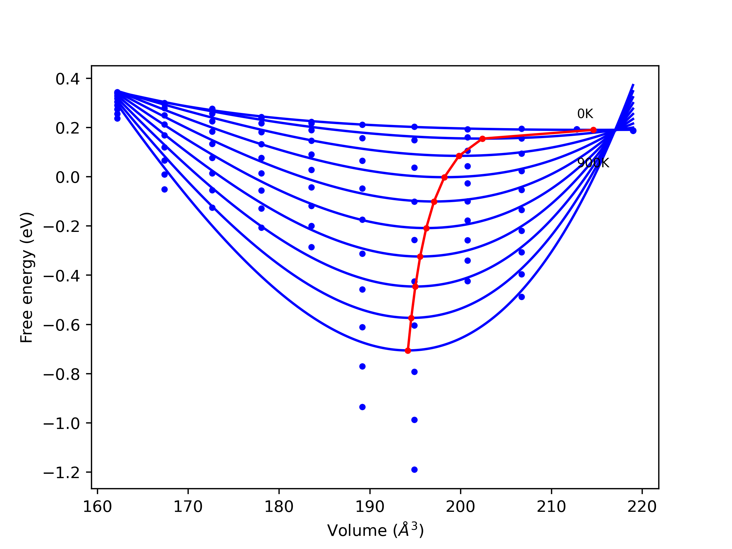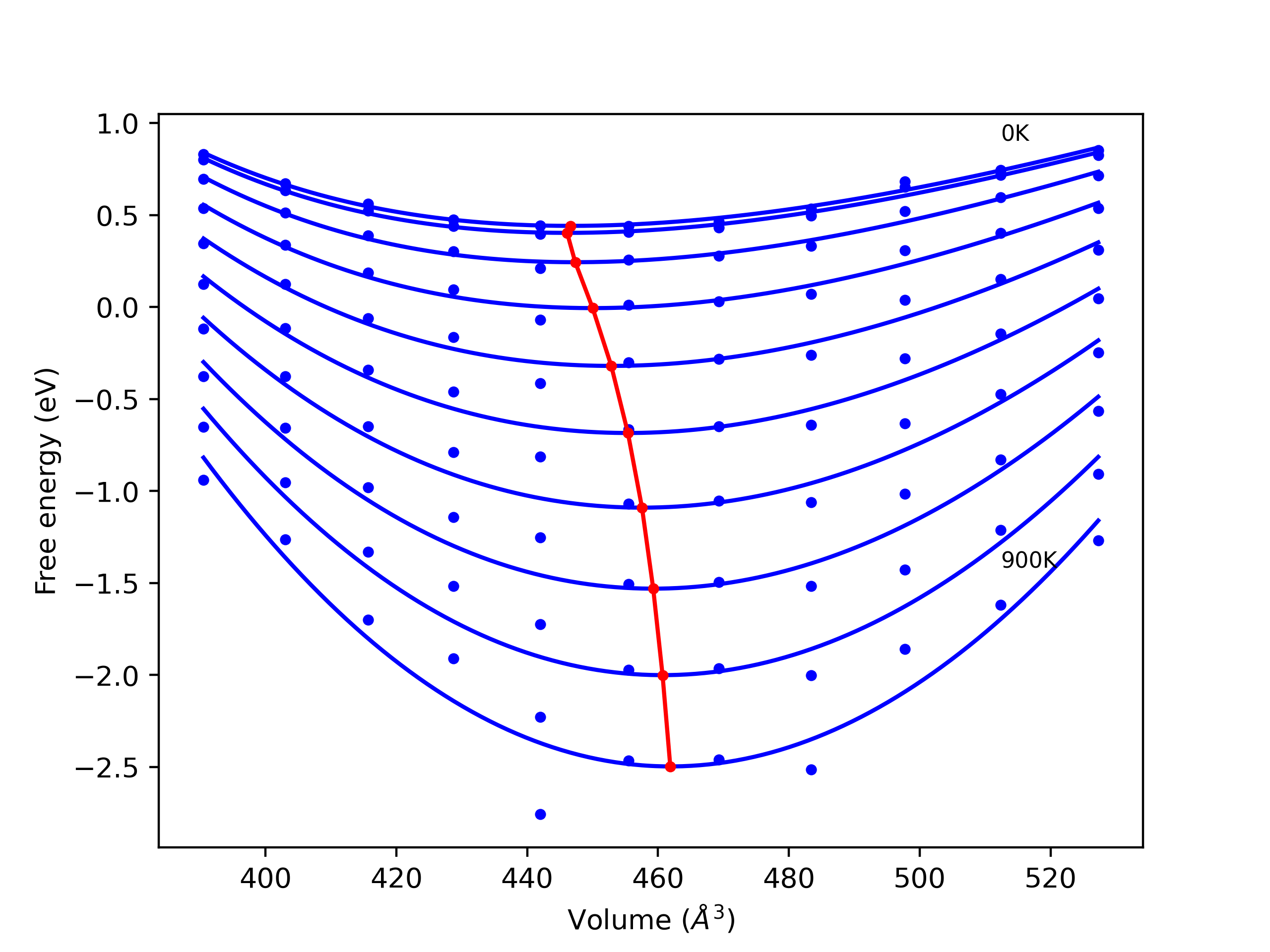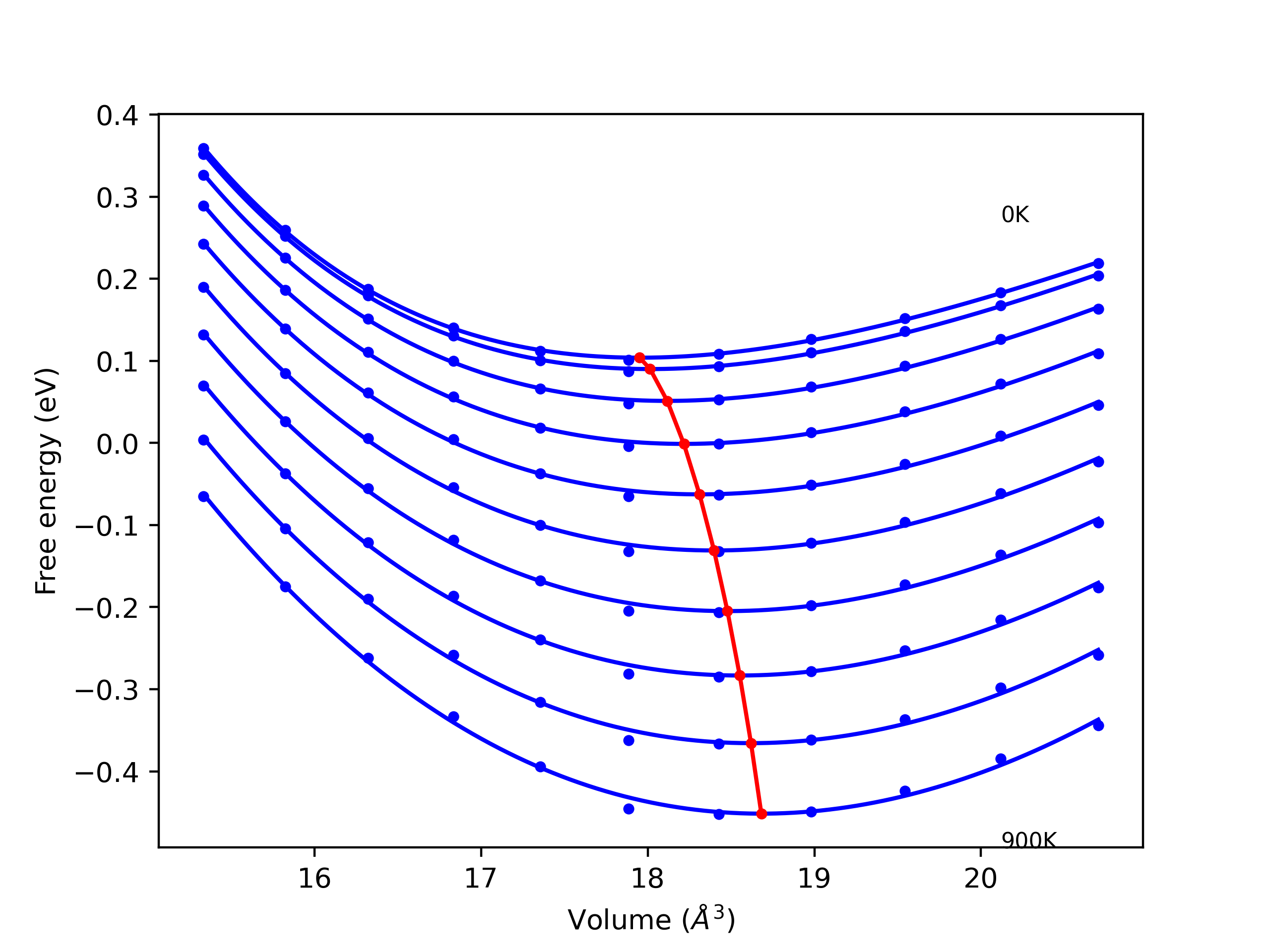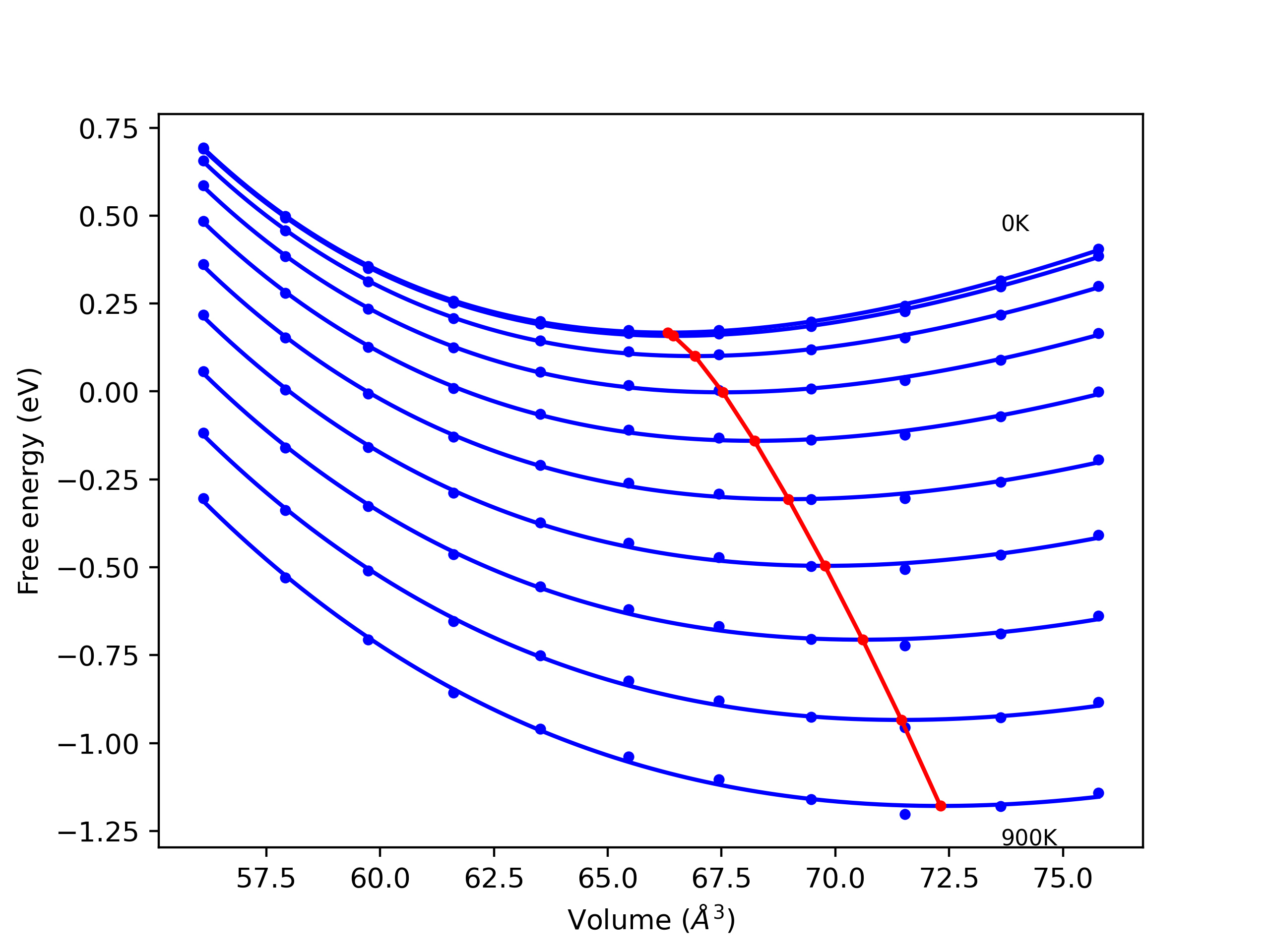 Plots of lattice and elastic constants are shown as a function of temperature. The 0K points were taken from the Crystal Structure Predictions and the Elastic Constants Predictions sections above for the unique crystal structures relaxed with the "dynamic" method. Starting from the 0 K relaxed crystal unit cells, supercell systems are created by replicating all three dimensions by the same multiplier to achieve at least 4000 atoms. The systems are then relaxed at 50 K and zero pressure using 1 million NPT steps. Lattice constants are estimated by averaging the measured box dimensions. Temperatures are iteratively increased by 50 K, with each subsequent relaxation calculation starting from the final atomic configuration at the previous temperature and relaxing for another 1 million steps.