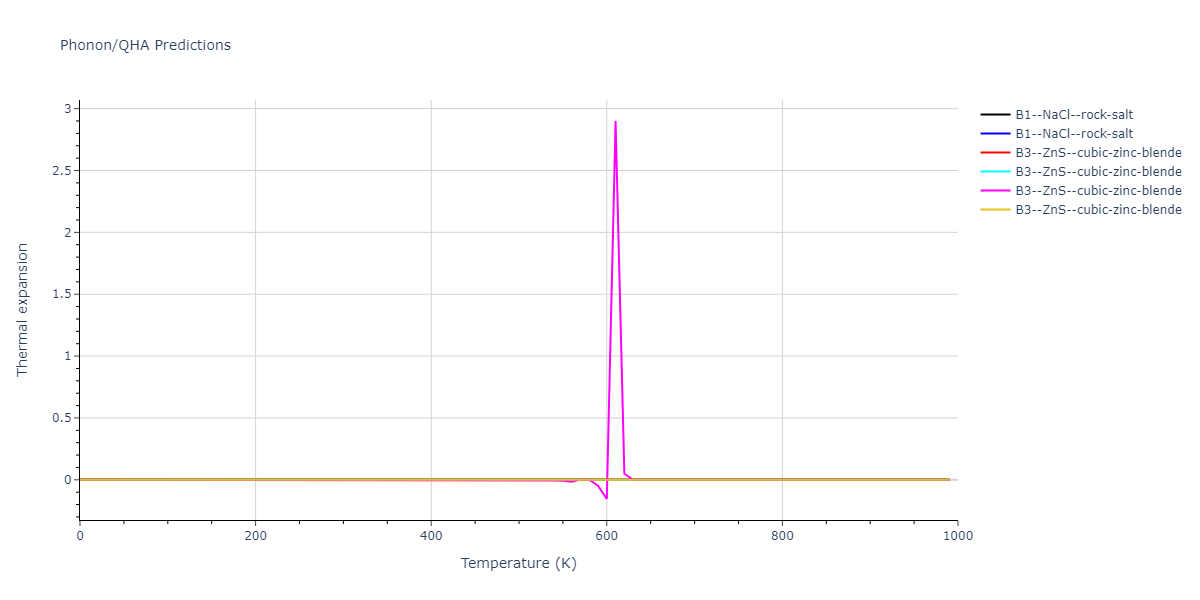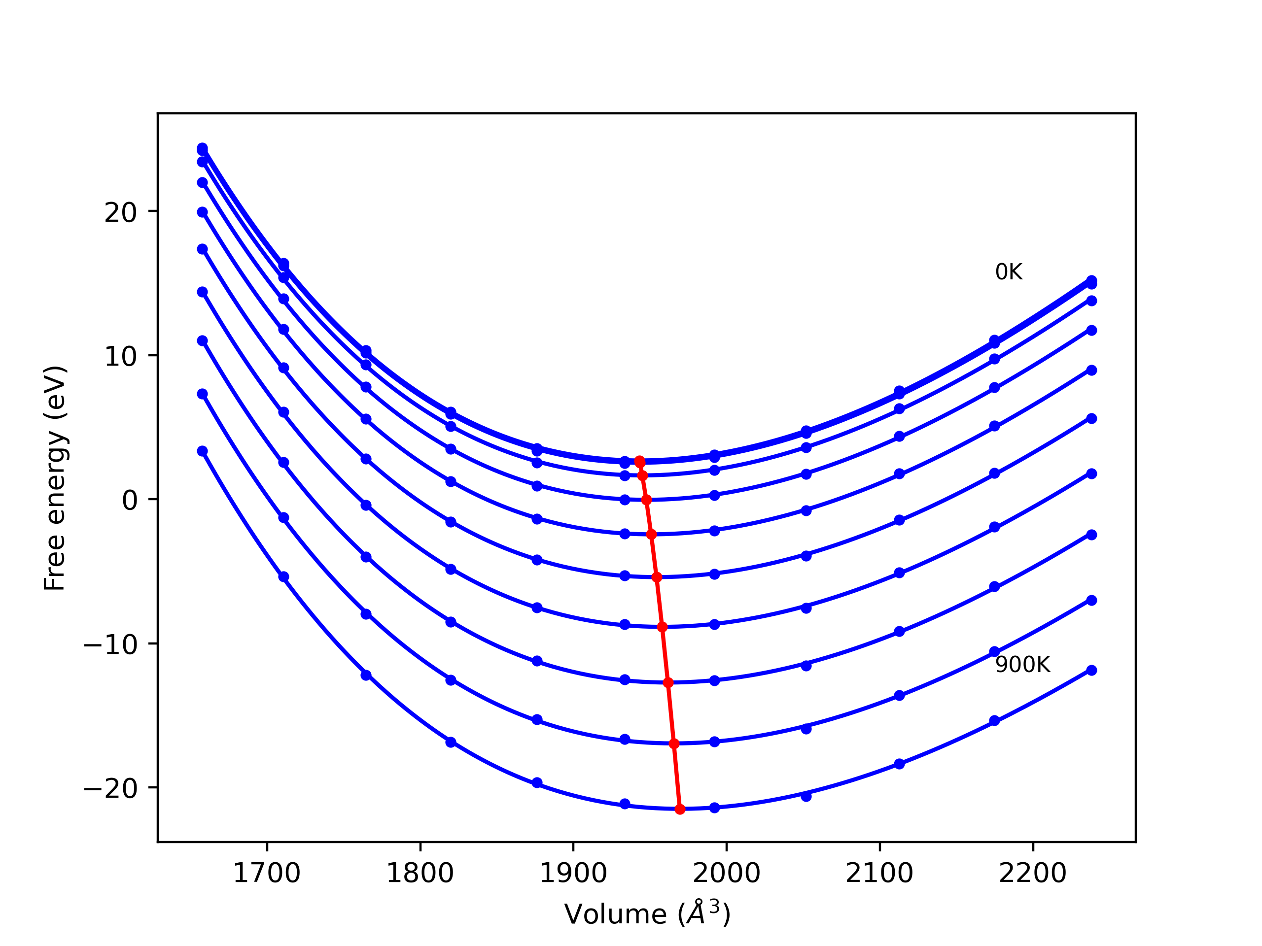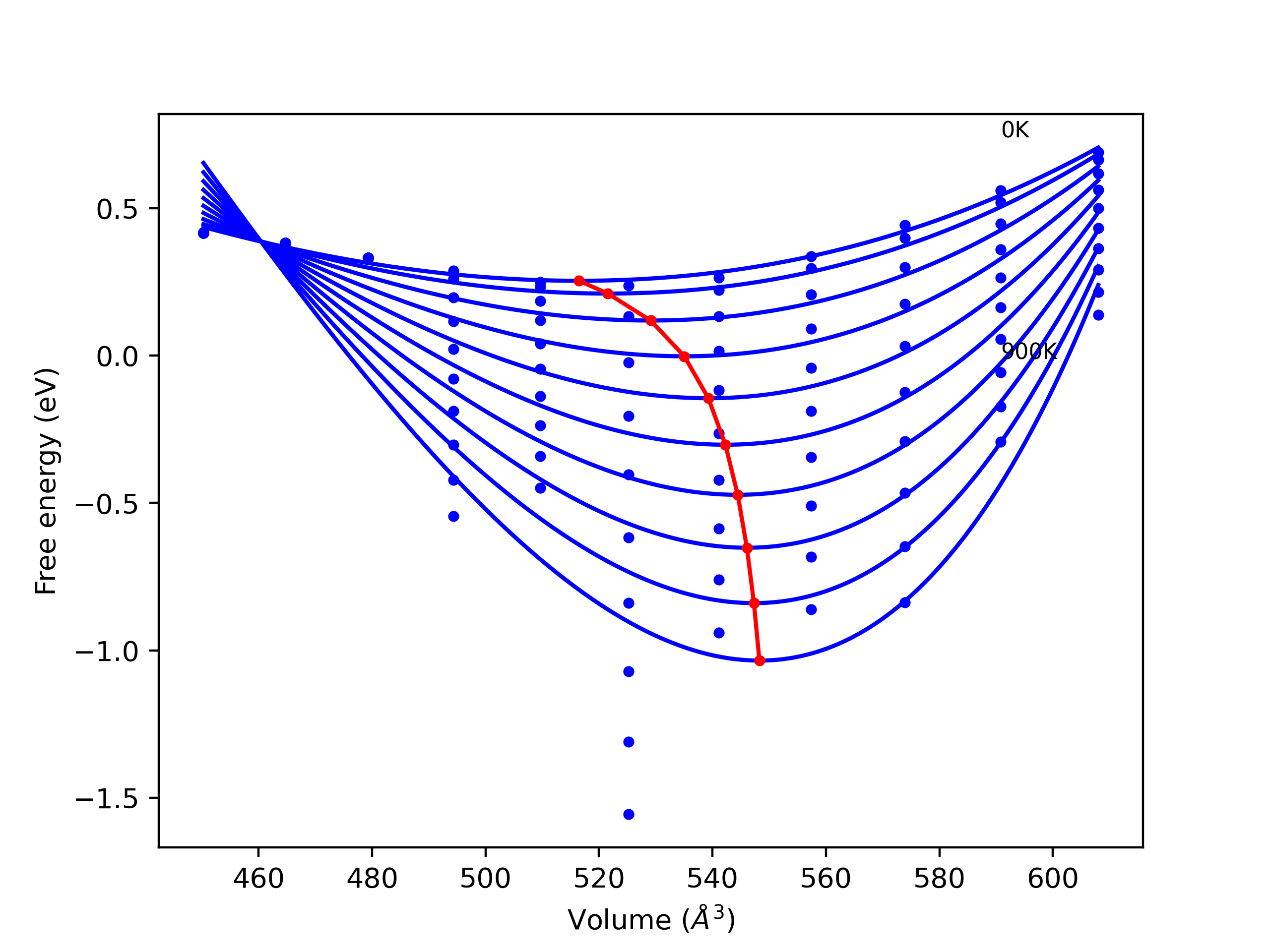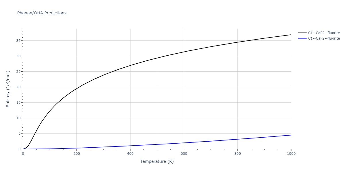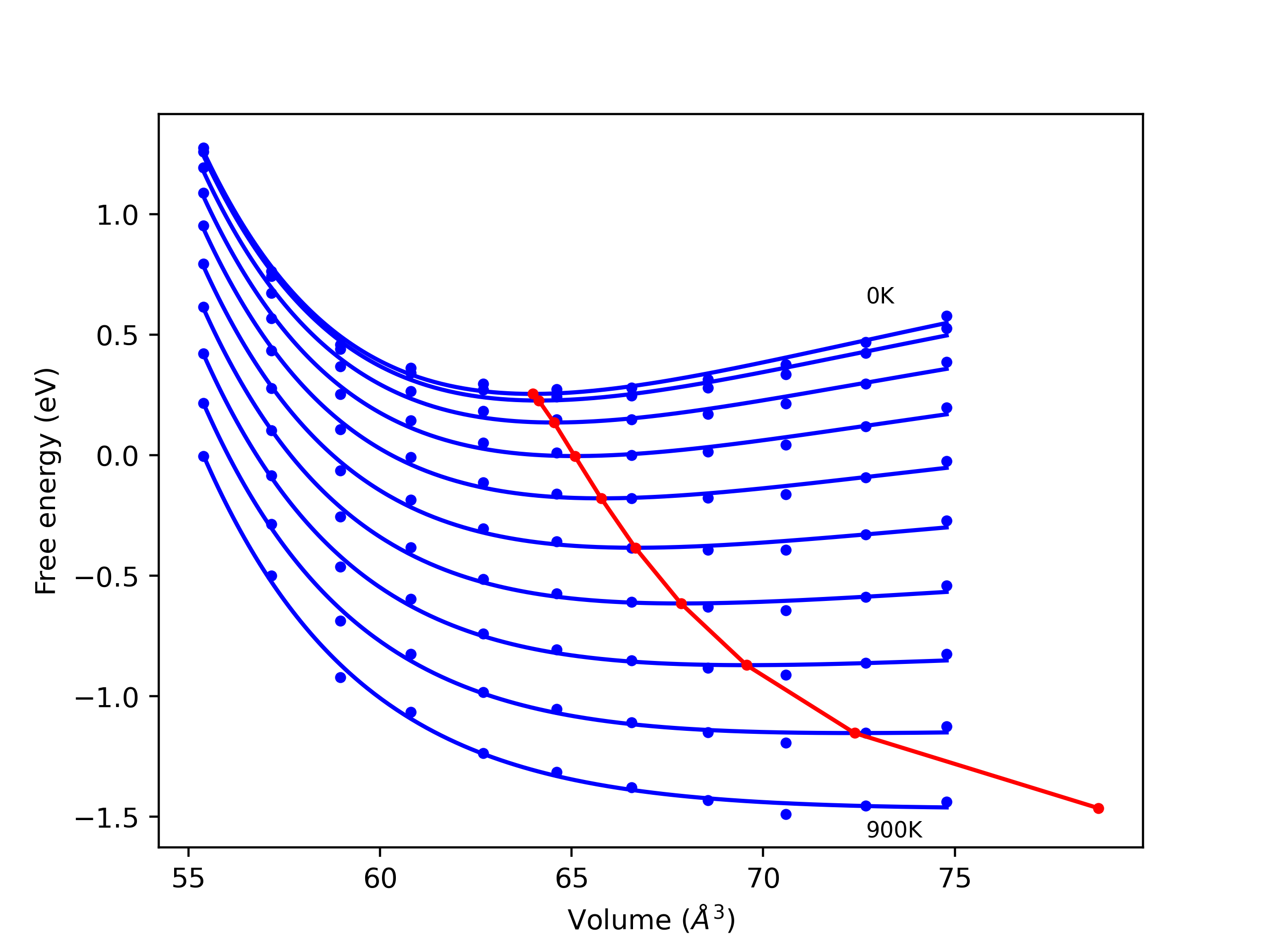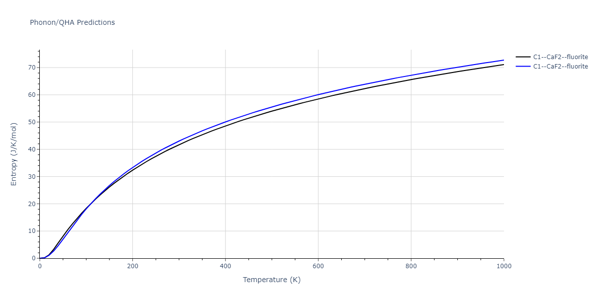 The Gibbs energies of the phases are estimated using thermodynamic integration between the interatomic potential in question and a simpler model with known Gibbs free energy values. For solids, the reference model is an Einstein solid, while for liquids it is the Uhlenbeck-Ford potential. Besides a short run at the start of the solid calculations to estimate Einstein model spring constants, the two calculations proceed similarly. Starting with the final relaxation configurations, the systems are stabilized for 25,000 steps. Then, over the next 50,000 steps the potential is swapped out for the reference potential. The system is then stabilized for another 25,000 steps with the reference model before a reverse swap of 50,000 steps is performed. The simulation ends with one final 25,000 step stabilization period. From the simulation, the irreversible work of transformation is estimated and used to compute the absolute Gibbs free energy of the target phase and potential relative to the reference potential. Entropy is estimated as the difference in enthalpy and Gibbs free energy and divided by temperature.
