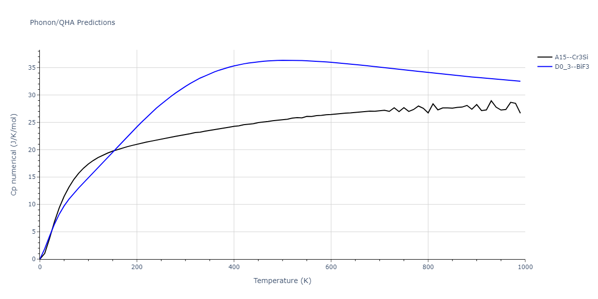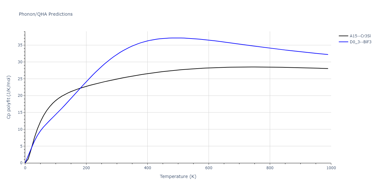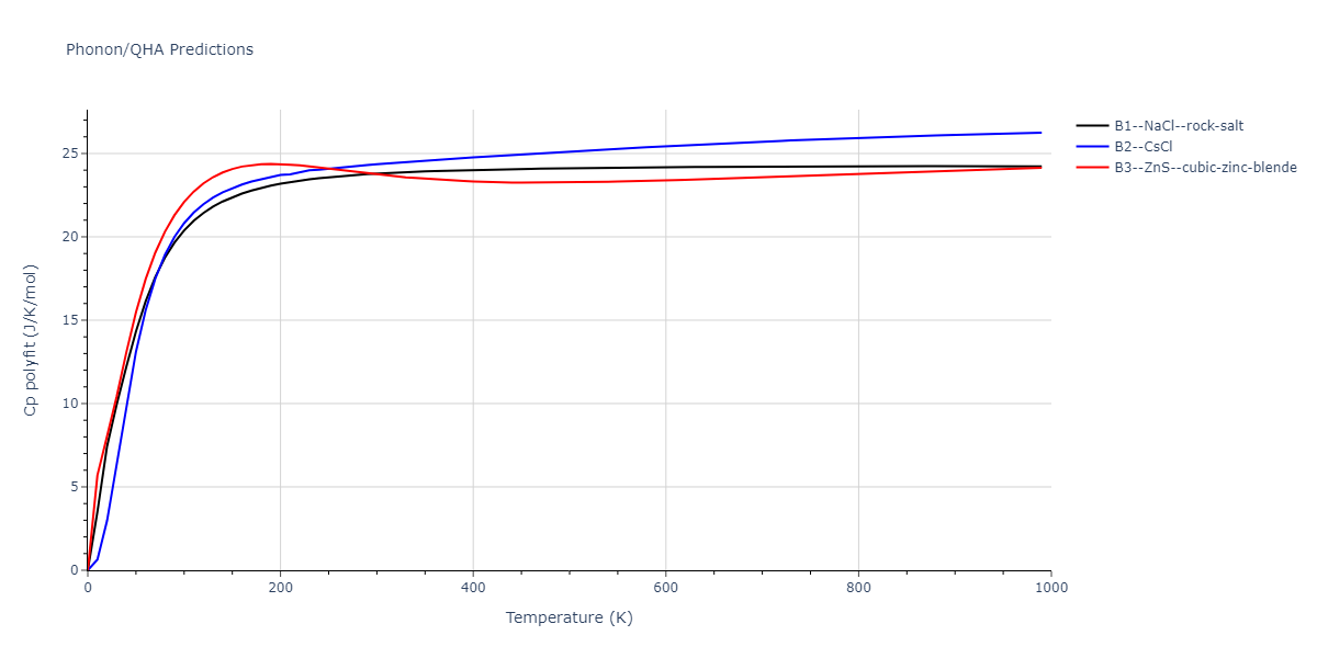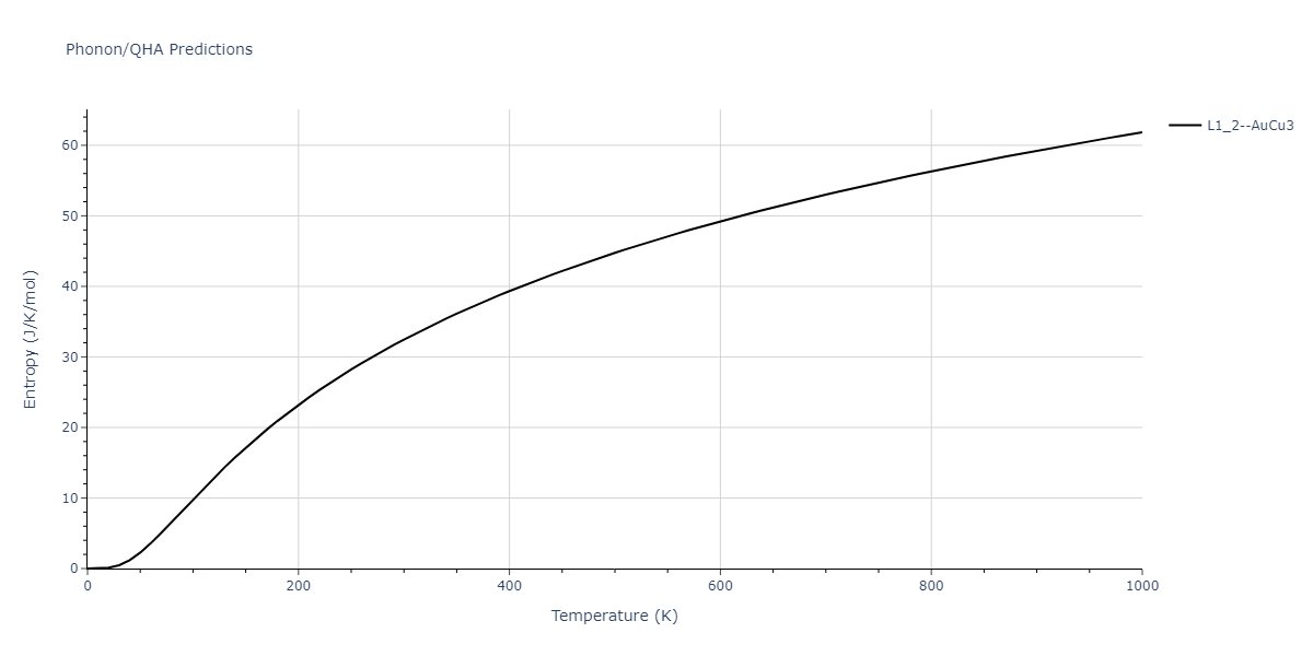 Plots of internal energy, Gibbs free energy, entropy, heat capacity and volume are shown here as a function of temperature for various crystal structures and liquid phases. The included crystal structures correspond to those in the Solid Structures vs. Temperature section, and the liquid phases to those in the Liquid Properties section. Internal energy and volume are taken from the associated structure relaxations mentioned in those previous sections. Constant pressure heat capacity is estimated using 3-point numerical derivatives of enthalpy versus temperature. Note that since all simulations done here are at 0 pressure, internal energy and enthalpy are equivalent.
