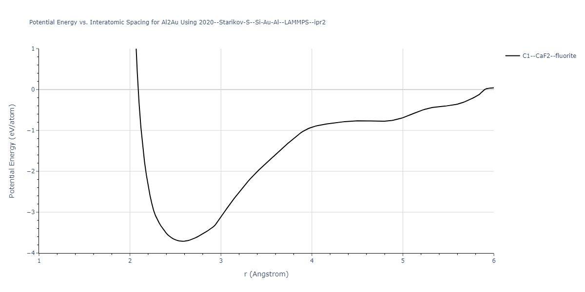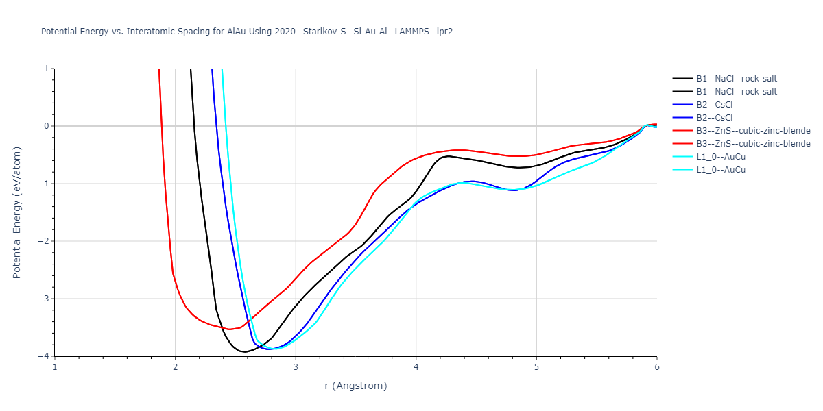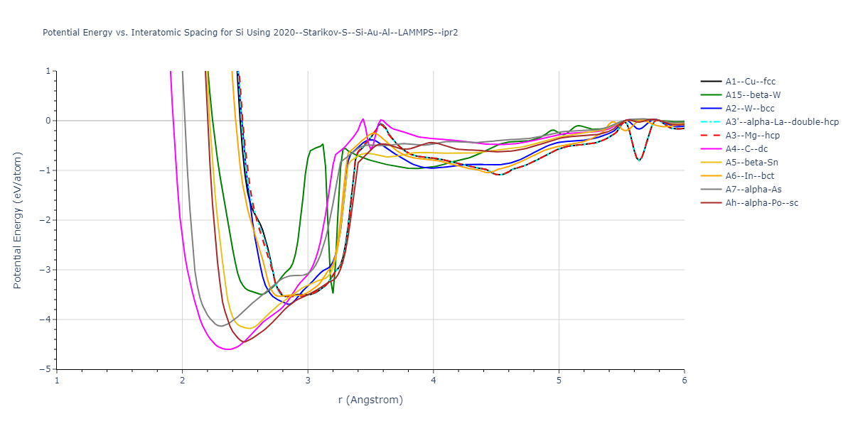 Plots of potential energy vs interatomic spacing, r, are shown below for a number of crystal structures. The structures are generated based on the ideal atomic positions and b/a and c/a lattice parameter ratios for a given crystal prototype. The size of the system is then uniformly scaled, and the energy calculated without relaxing the system. To obtain these plots, values of r are evaluated every 0.02 Å up to 6 Å.