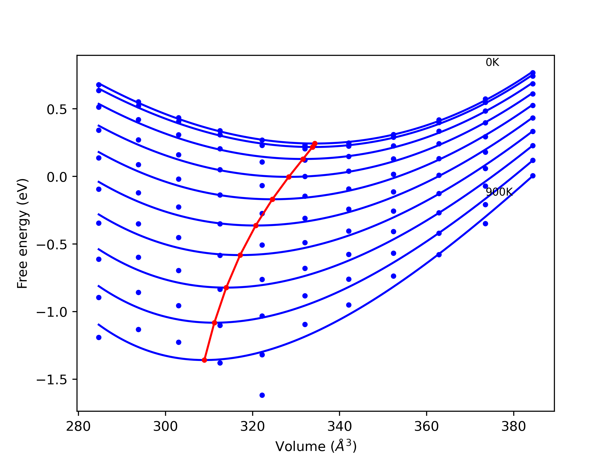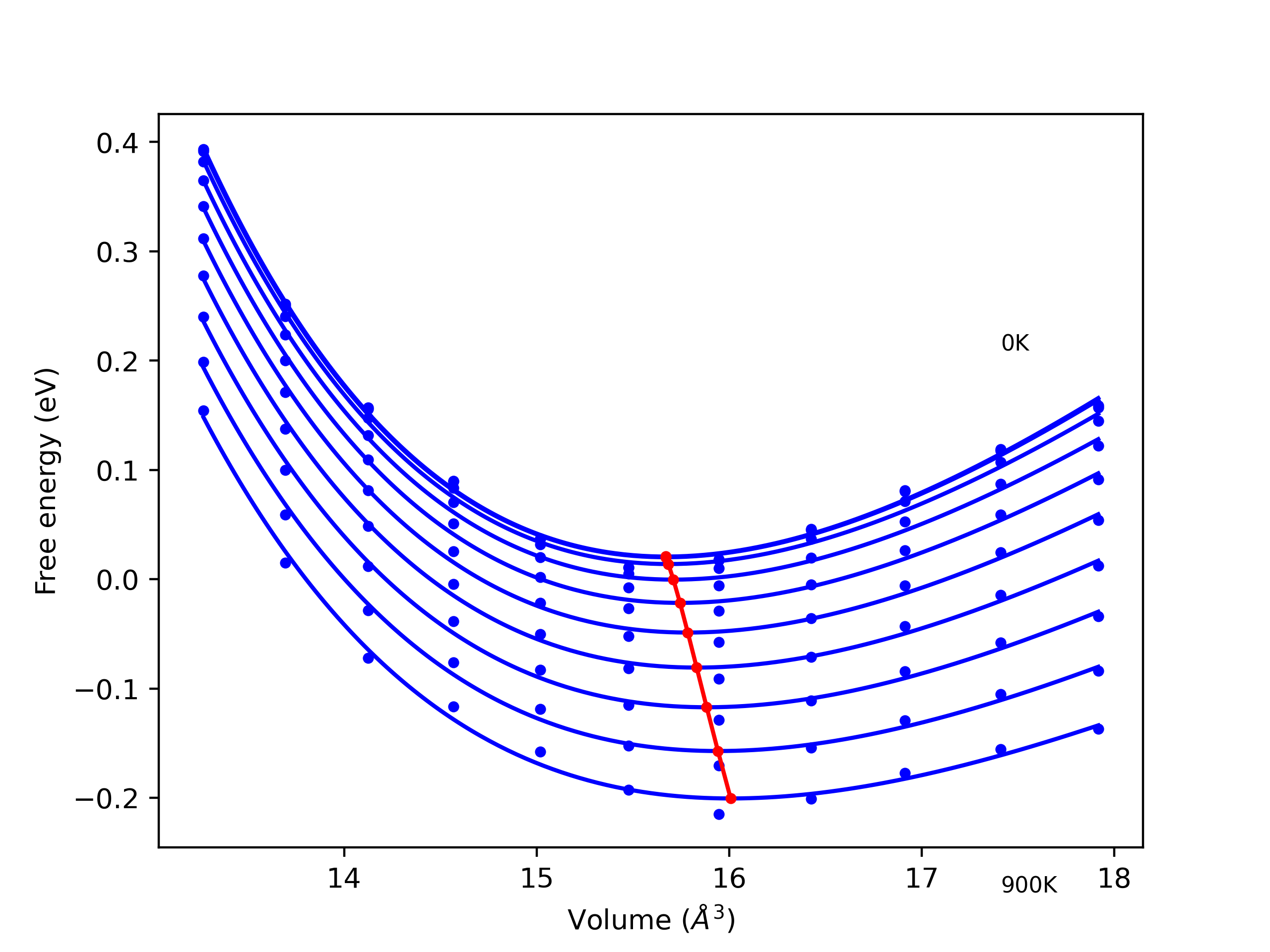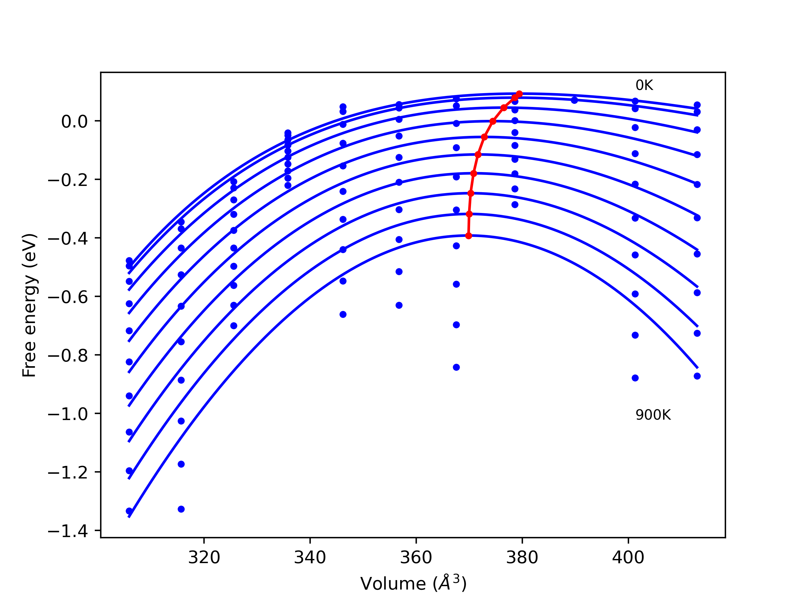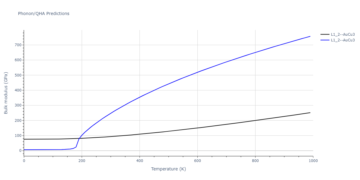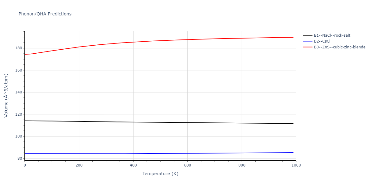 Plots of lattice and elastic constants are shown as a function of temperature. The 0K points were taken from the Crystal Structure Predictions and the Elastic Constants Predictions sections above for the unique crystal structures relaxed with the "dynamic" method. Starting from the 0 K relaxed crystal unit cells, supercell systems are created by replicating all three dimensions by the same multiplier to achieve at least 4000 atoms. The systems are then relaxed at 50 K and zero pressure using 1 million NPT steps. Lattice constants are estimated by averaging the measured box dimensions. Temperatures are iteratively increased by 50 K, with each subsequent relaxation calculation starting from the final atomic configuration at the previous temperature and relaxing for another 1 million steps.