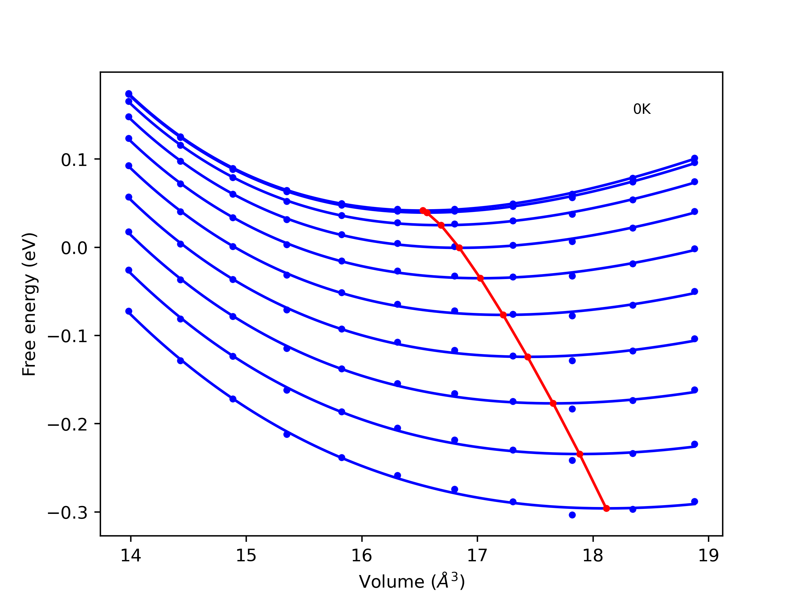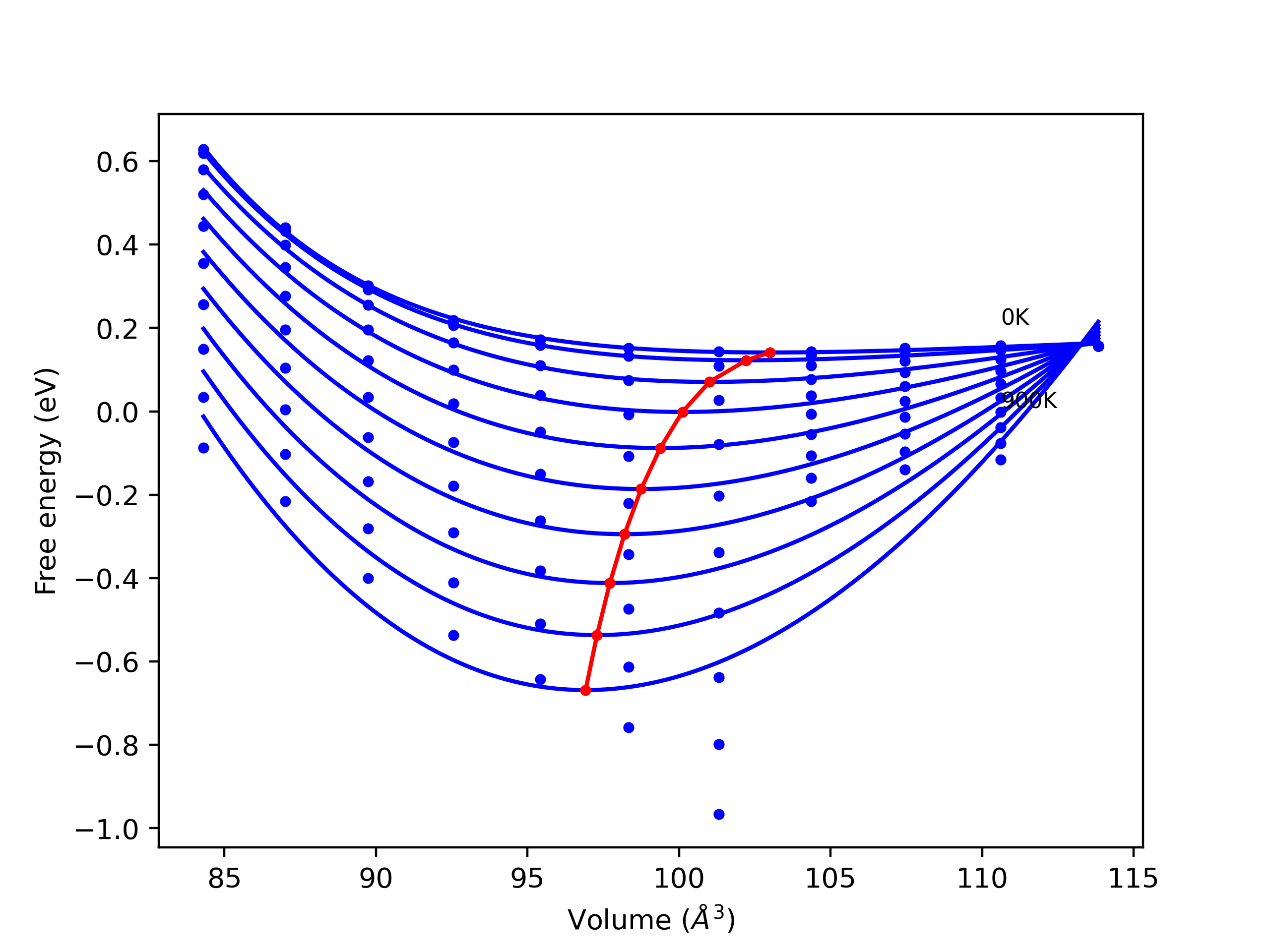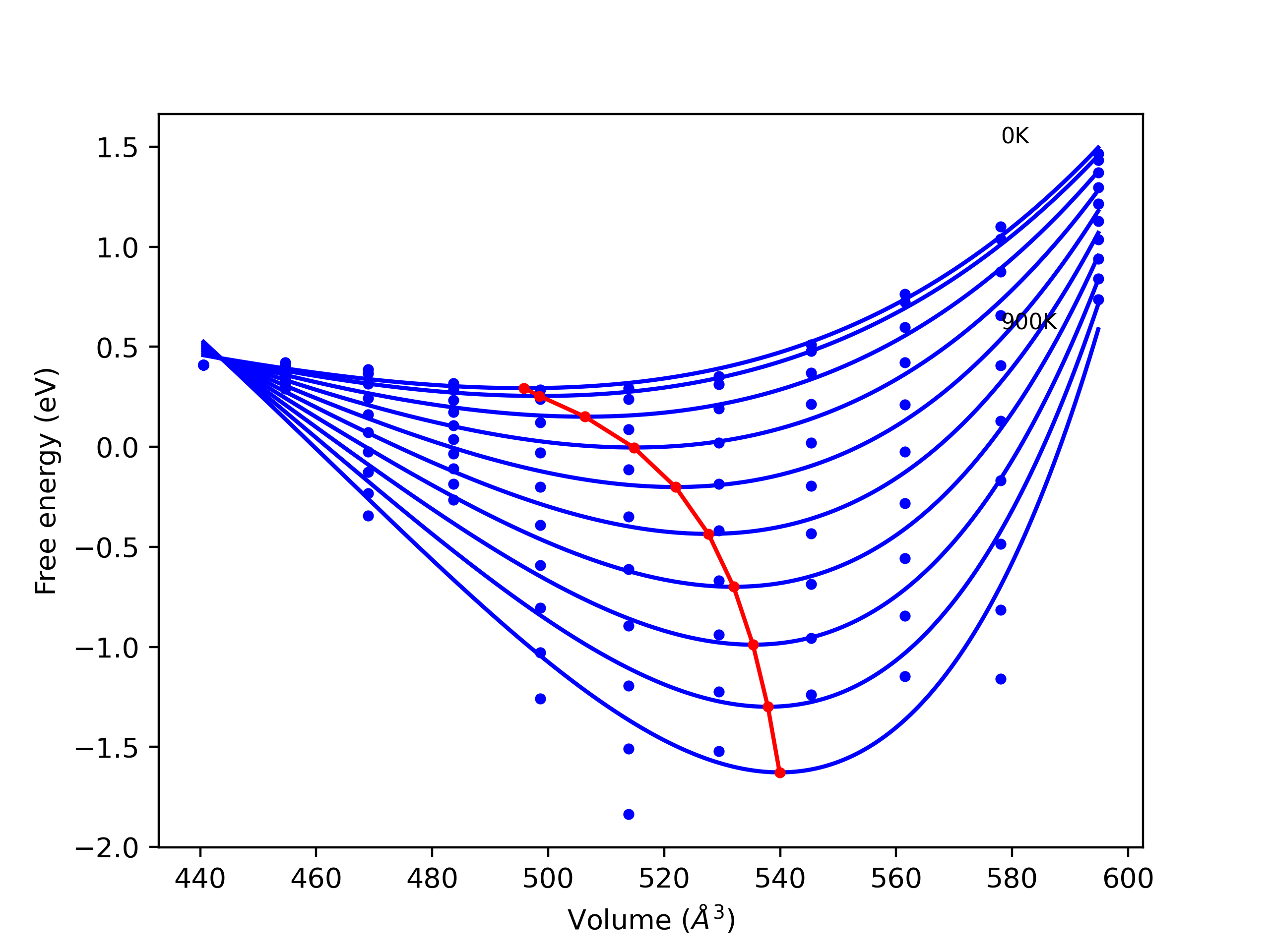 Plots of lattice and elastic constants are shown as a function of temperature. The 0K points were taken from the Crystal Structure Predictions and the Elastic Constants Predictions sections above for the unique crystal structures relaxed with the "dynamic" method. Starting from the 0 K relaxed crystal unit cells, supercell systems are created by replicating all three dimensions by the same multiplier to achieve at least 4000 atoms. The systems are then relaxed at 50 K and zero pressure using 1 million NPT steps. Lattice constants are estimated by averaging the measured box dimensions. Temperatures are iteratively increased by 50 K, with each subsequent relaxation calculation starting from the final atomic configuration at the previous temperature and relaxing for another 1 million steps.