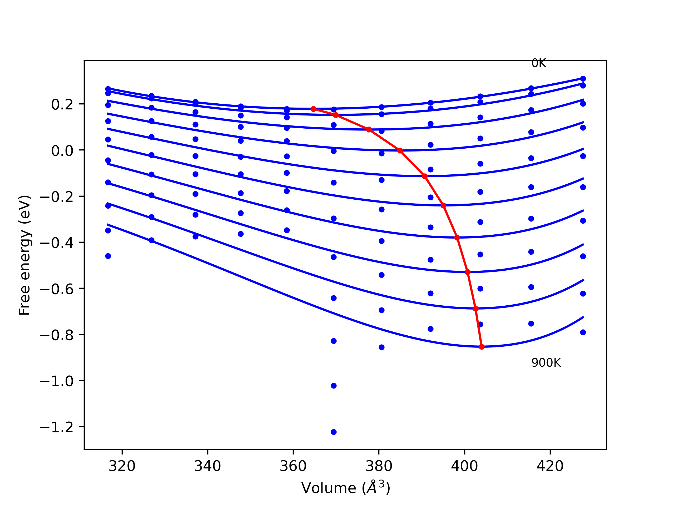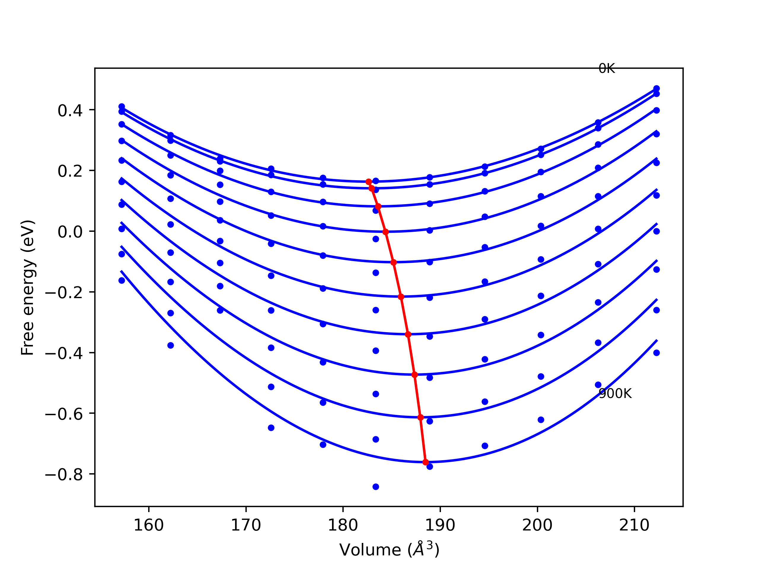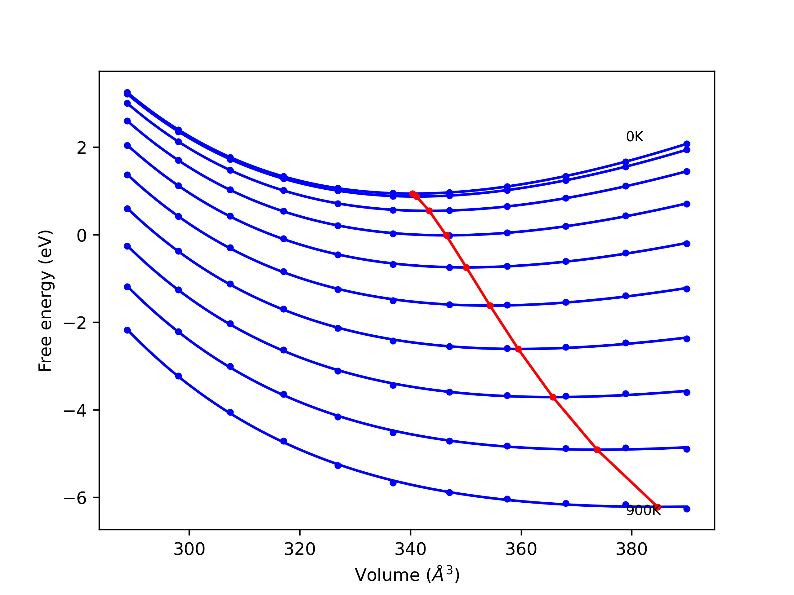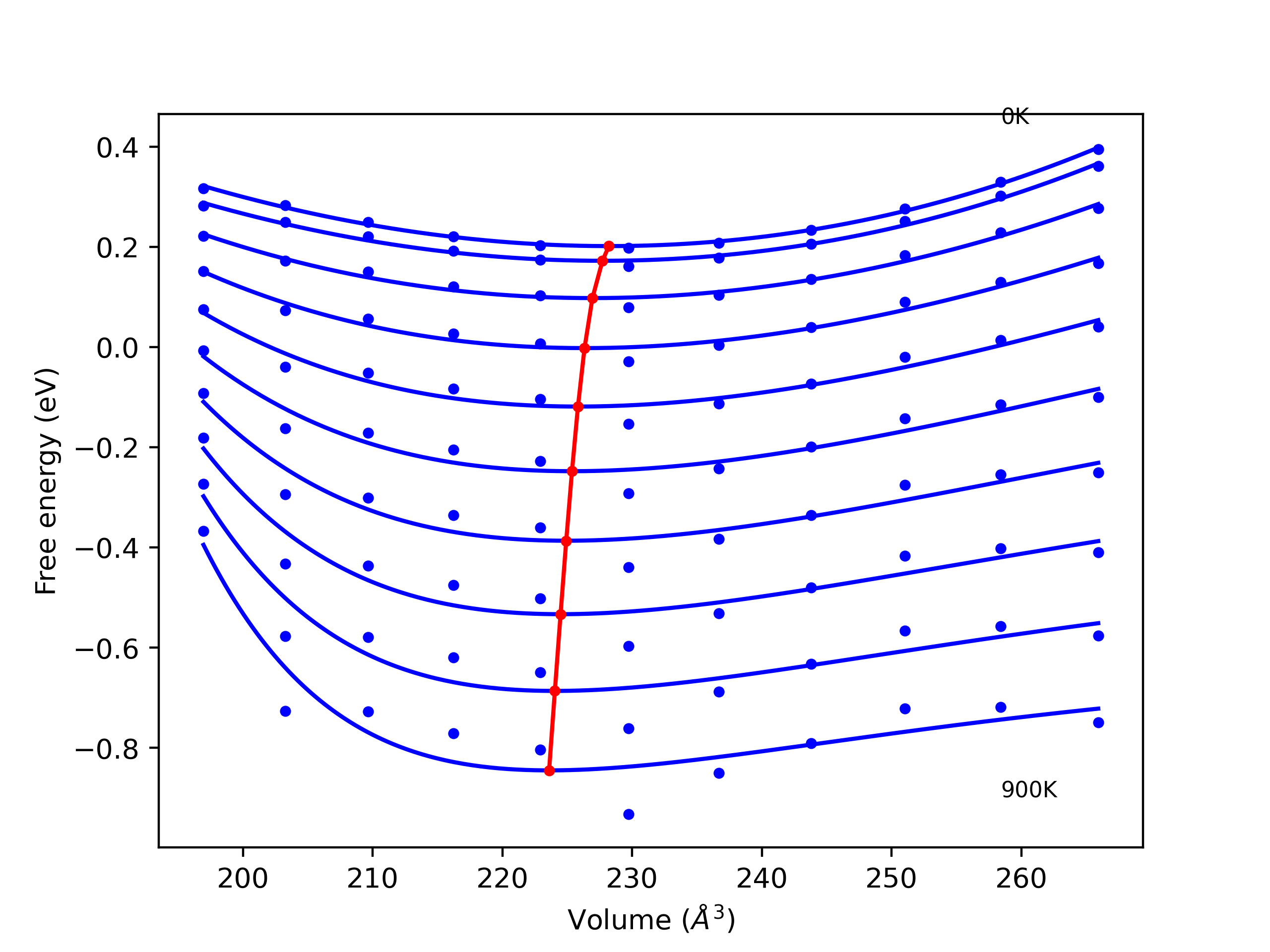 Plots of lattice and elastic constants are shown as a function of temperature. The 0K points were taken from the Crystal Structure Predictions and the Elastic Constants Predictions sections above for the unique crystal structures relaxed with the "dynamic" method. Starting from the 0 K relaxed crystal unit cells, supercell systems are created by replicating all three dimensions by the same multiplier to achieve at least 4000 atoms. The systems are then relaxed at 50 K and zero pressure using 1 million NPT steps. Lattice constants are estimated by averaging the measured box dimensions. Temperatures are iteratively increased by 50 K, with each subsequent relaxation calculation starting from the final atomic configuration at the previous temperature and relaxing for another 1 million steps.