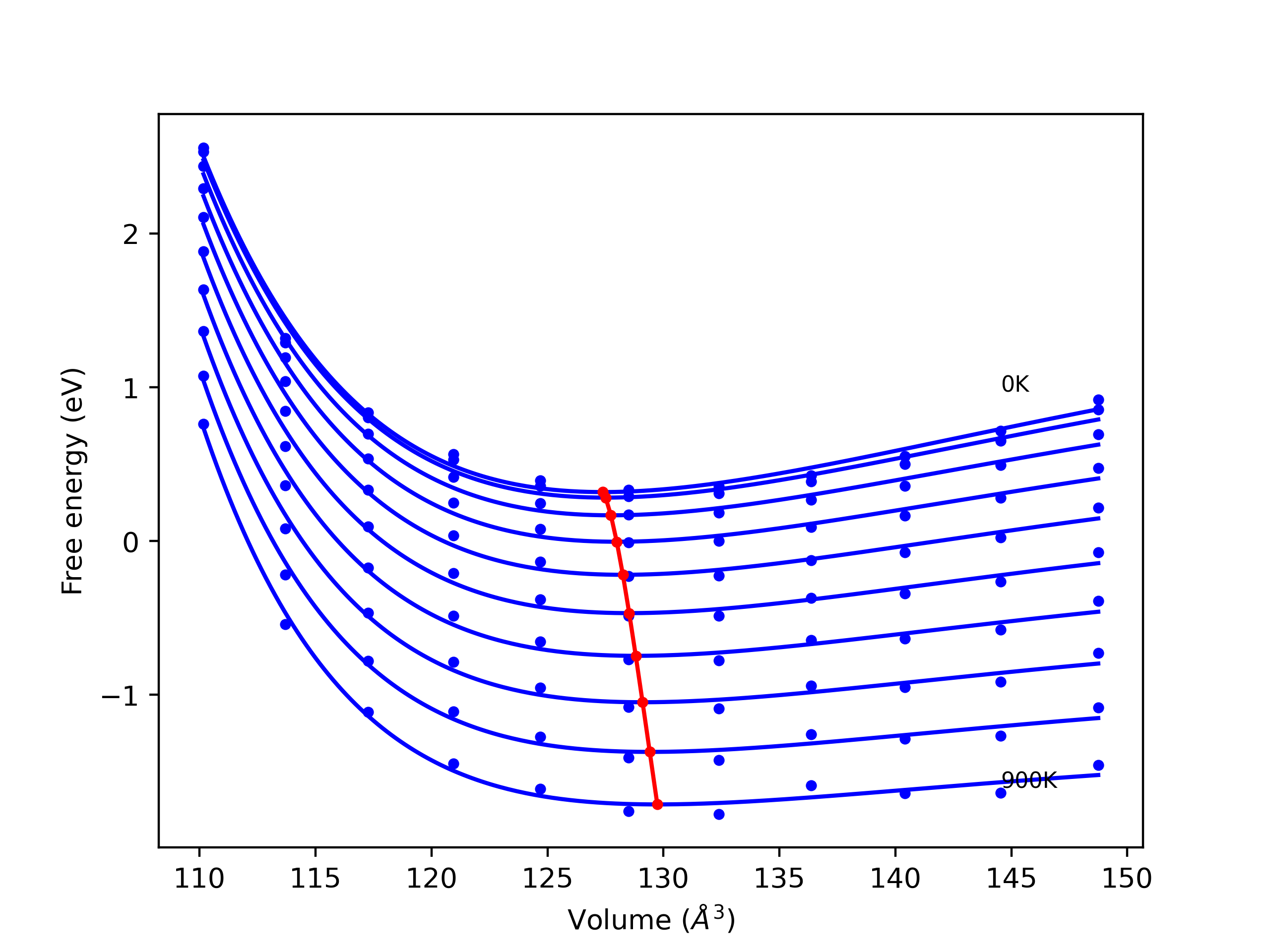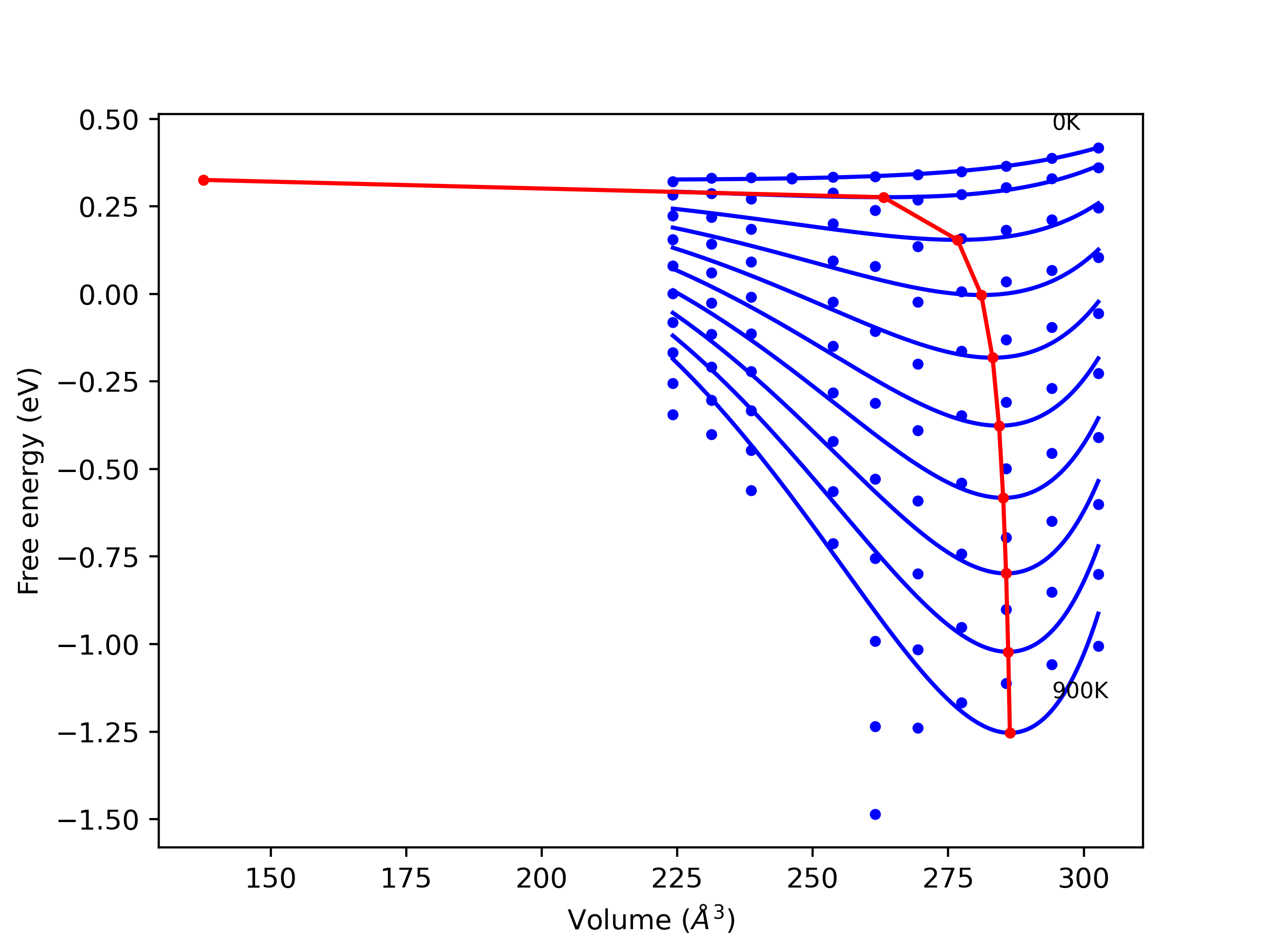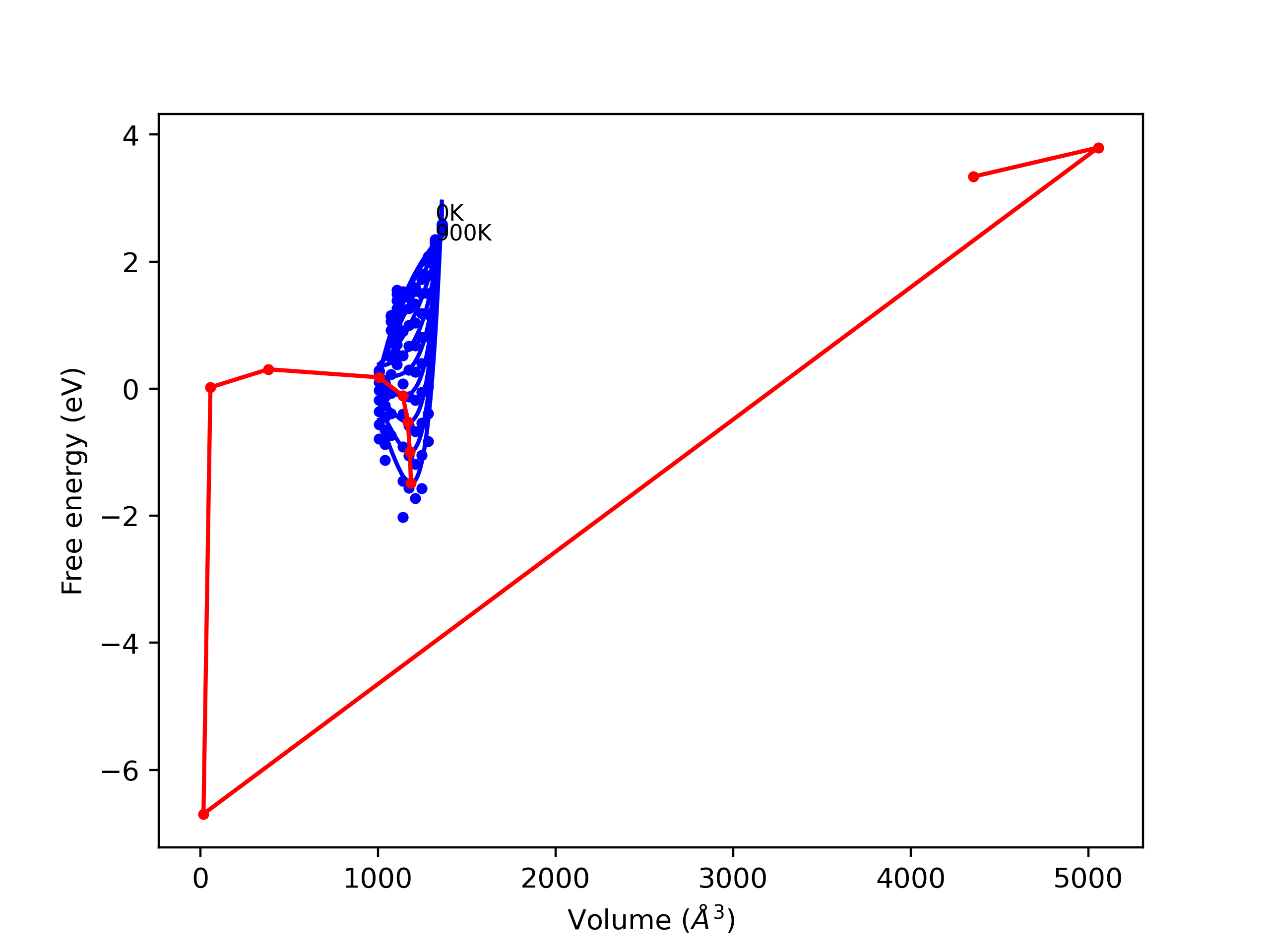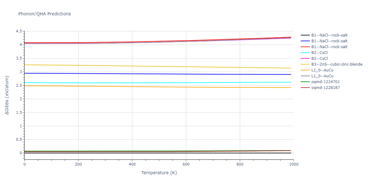 The Gibbs energies of the phases are estimated using thermodynamic integration between the interatomic potential in question and a simpler model with known Gibbs free energy values. For solids, the reference model is an Einstein solid, while for liquids it is the Uhlenbeck-Ford potential. Besides a short run at the start of the solid calculations to estimate Einstein model spring constants, the two calculations proceed similarly. Starting with the final relaxation configurations, the systems are stabilized for 25,000 steps. Then, over the next 50,000 steps the potential is swapped out for the reference potential. The system is then stabilized for another 25,000 steps with the reference model before a reverse swap of 50,000 steps is performed. The simulation ends with one final 25,000 step stabilization period. From the simulation, the irreversible work of transformation is estimated and used to compute the absolute Gibbs free energy of the target phase and potential relative to the reference potential. Entropy is estimated as the difference in enthalpy and Gibbs free energy and divided by temperature.