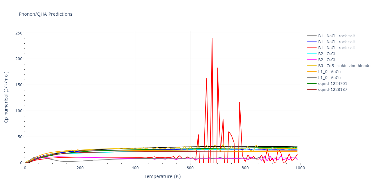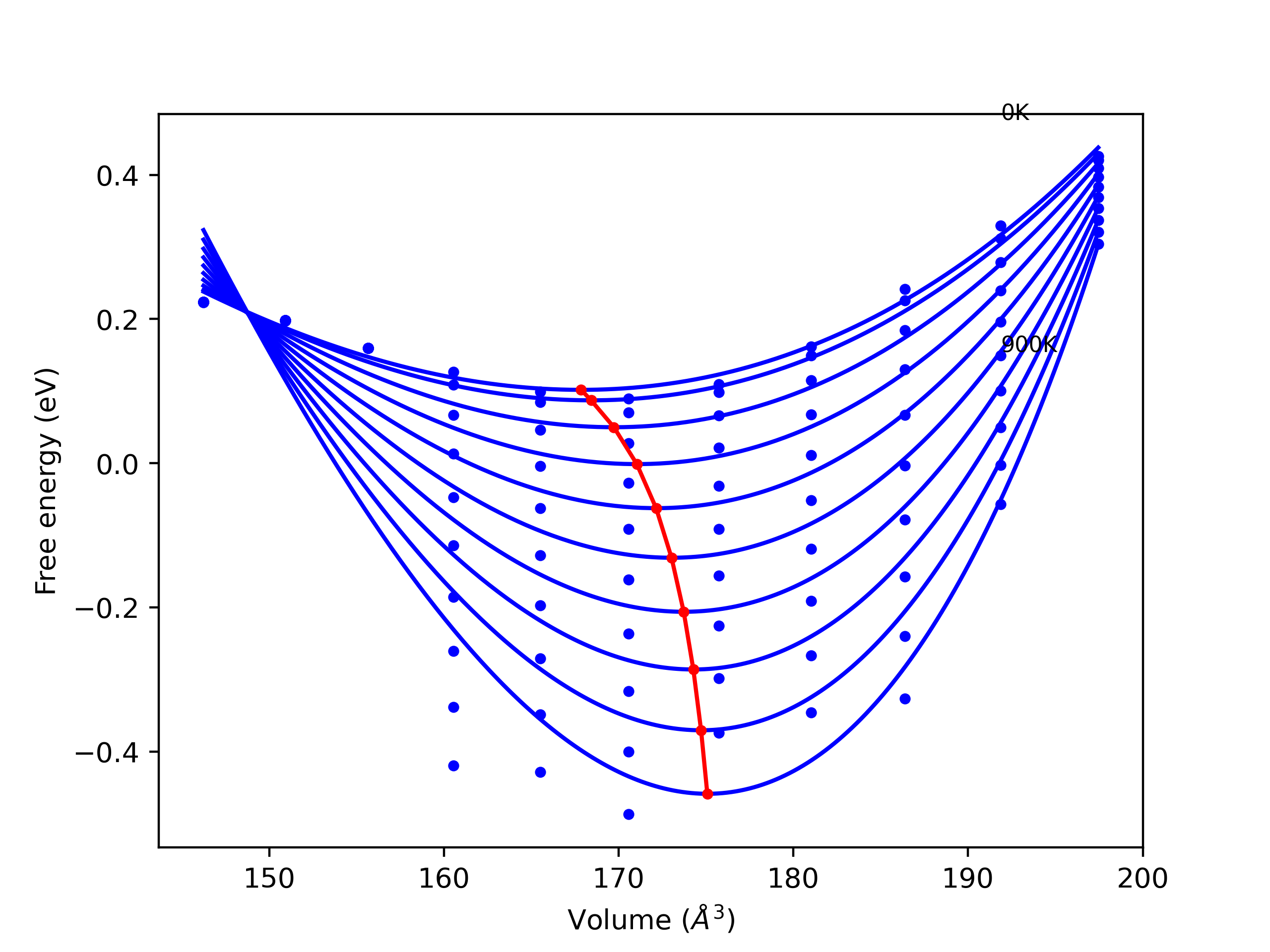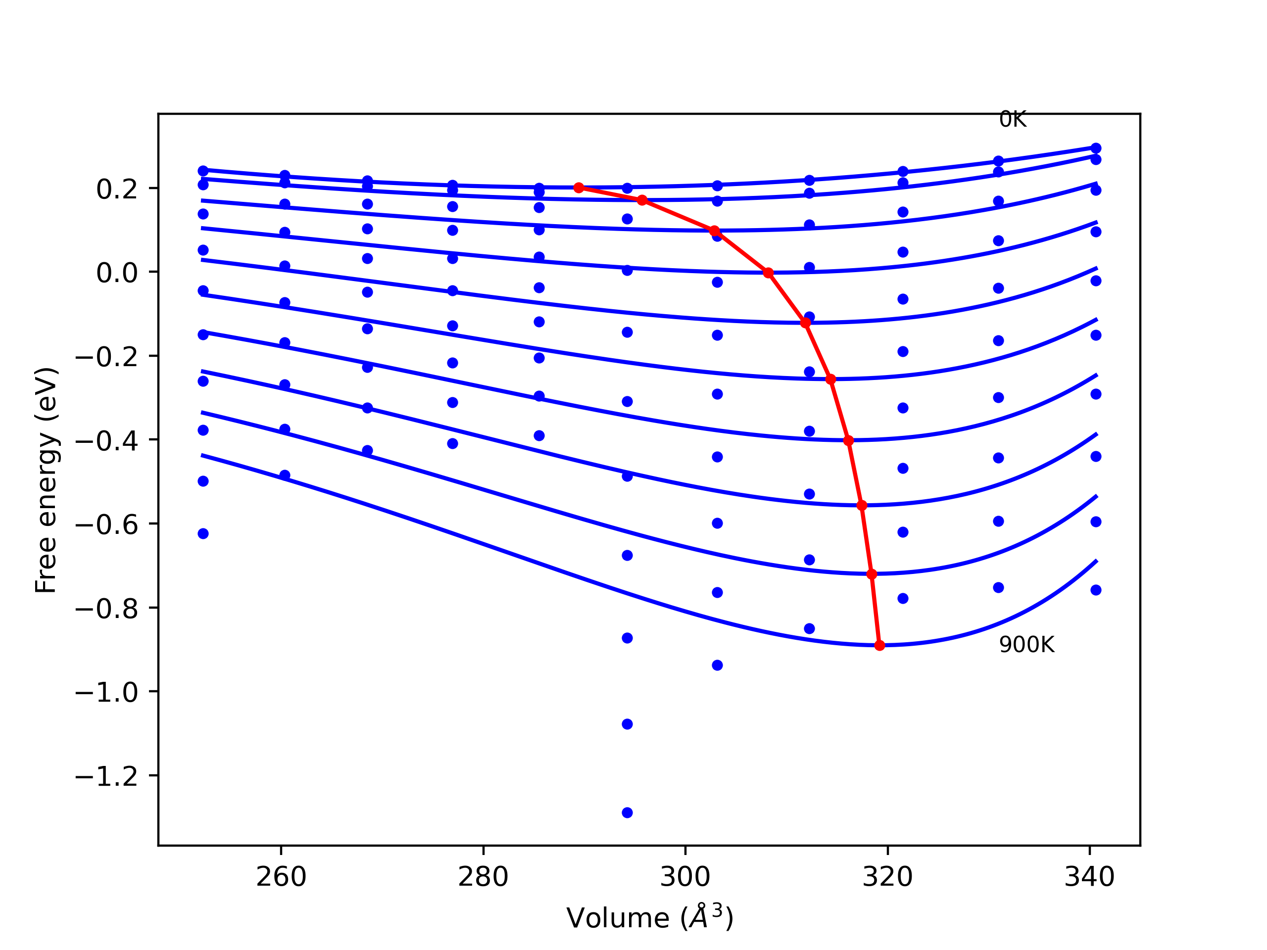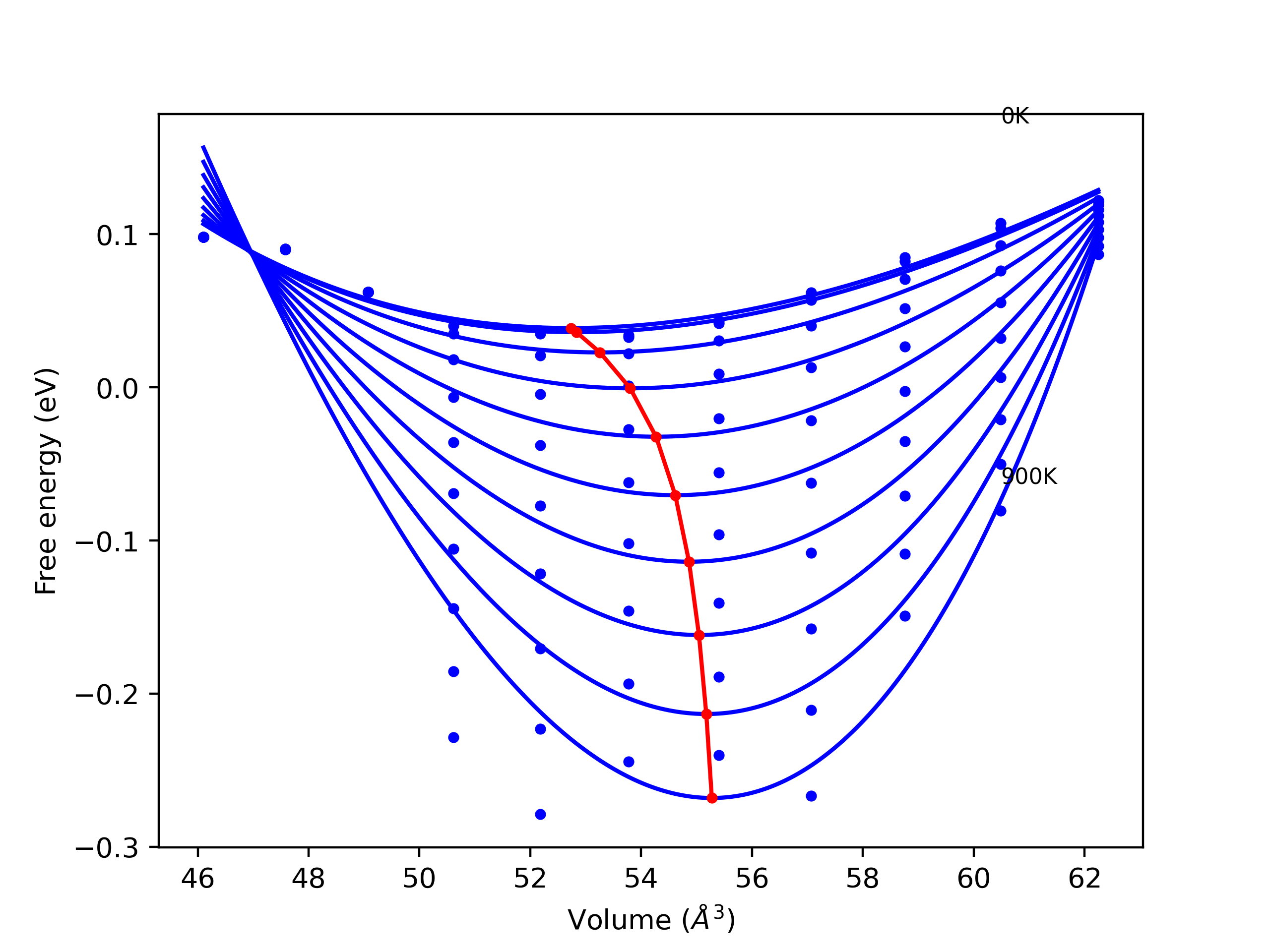 The Gibbs energies of the phases are estimated using thermodynamic integration between the interatomic potential in question and a simpler model with known Gibbs free energy values. For solids, the reference model is an Einstein solid, while for liquids it is the Uhlenbeck-Ford potential. Besides a short run at the start of the solid calculations to estimate Einstein model spring constants, the two calculations proceed similarly. Starting with the final relaxation configurations, the systems are stabilized for 25,000 steps. Then, over the next 50,000 steps the potential is swapped out for the reference potential. The system is then stabilized for another 25,000 steps with the reference model before a reverse swap of 50,000 steps is performed. The simulation ends with one final 25,000 step stabilization period. From the simulation, the irreversible work of transformation is estimated and used to compute the absolute Gibbs free energy of the target phase and potential relative to the reference potential. Entropy is estimated as the difference in enthalpy and Gibbs free energy and divided by temperature.