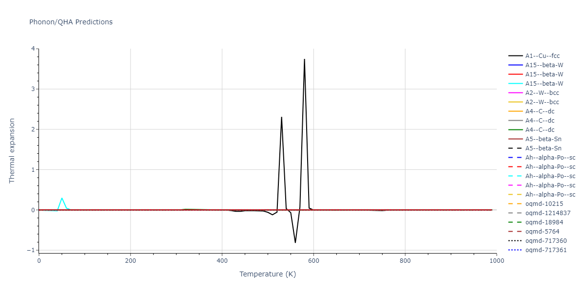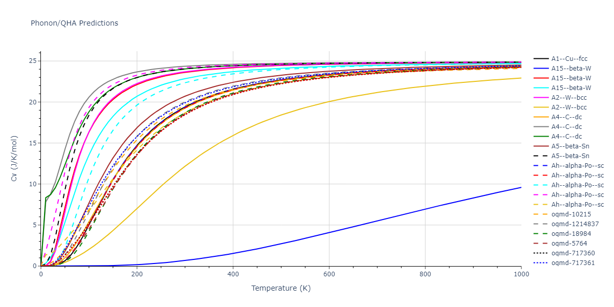 Plots of internal energy, Gibbs free energy, entropy, heat capacity and volume are shown here as a function of temperature for various crystal structures and liquid phases. The included crystal structures correspond to those in the Solid Structures vs. Temperature section, and the liquid phases to those in the Liquid Properties section. Internal energy and volume are taken from the associated structure relaxations mentioned in those previous sections. Constant pressure heat capacity is estimated using 3-point numerical derivatives of enthalpy versus temperature. Note that since all simulations done here are at 0 pressure, internal energy and enthalpy are equivalent.