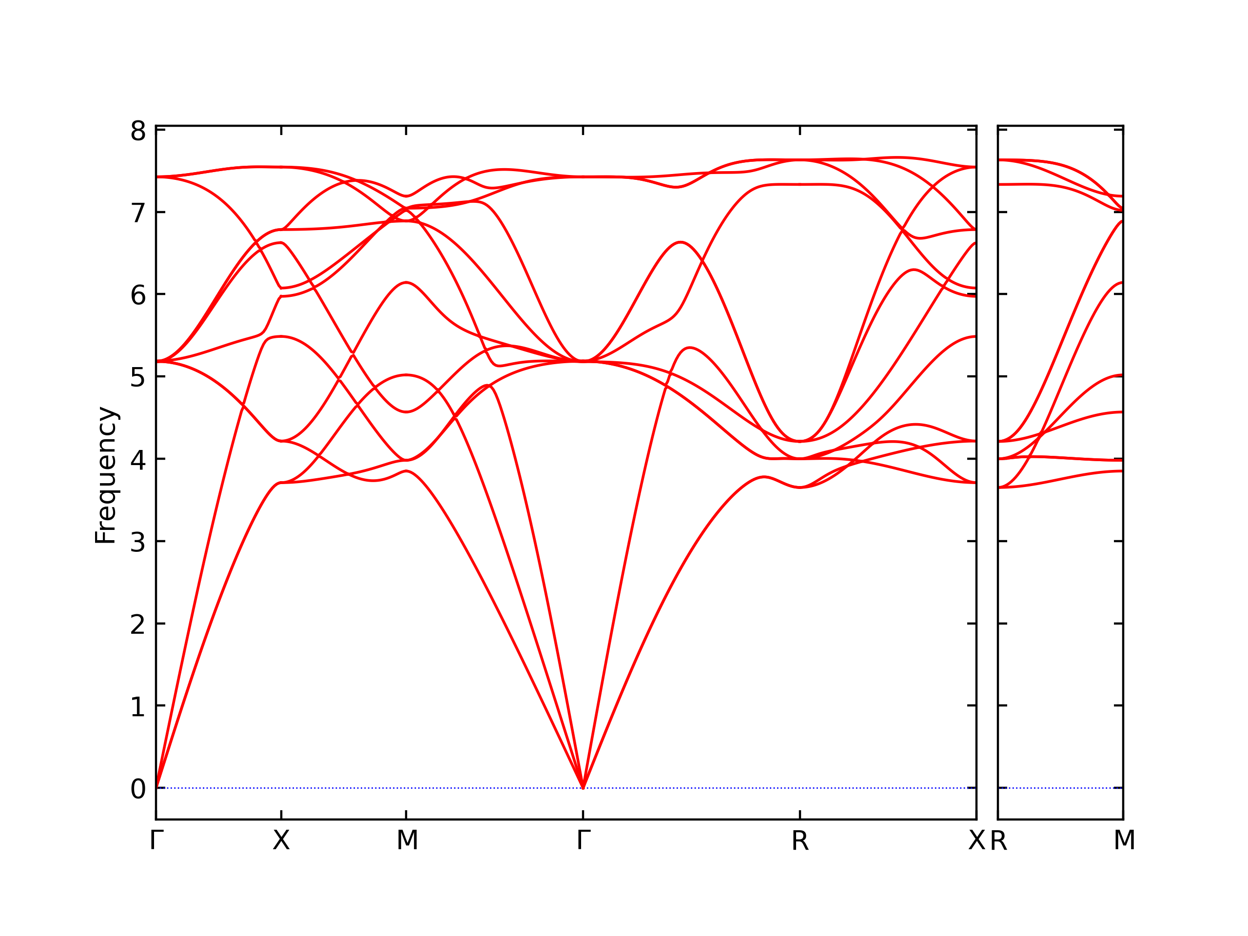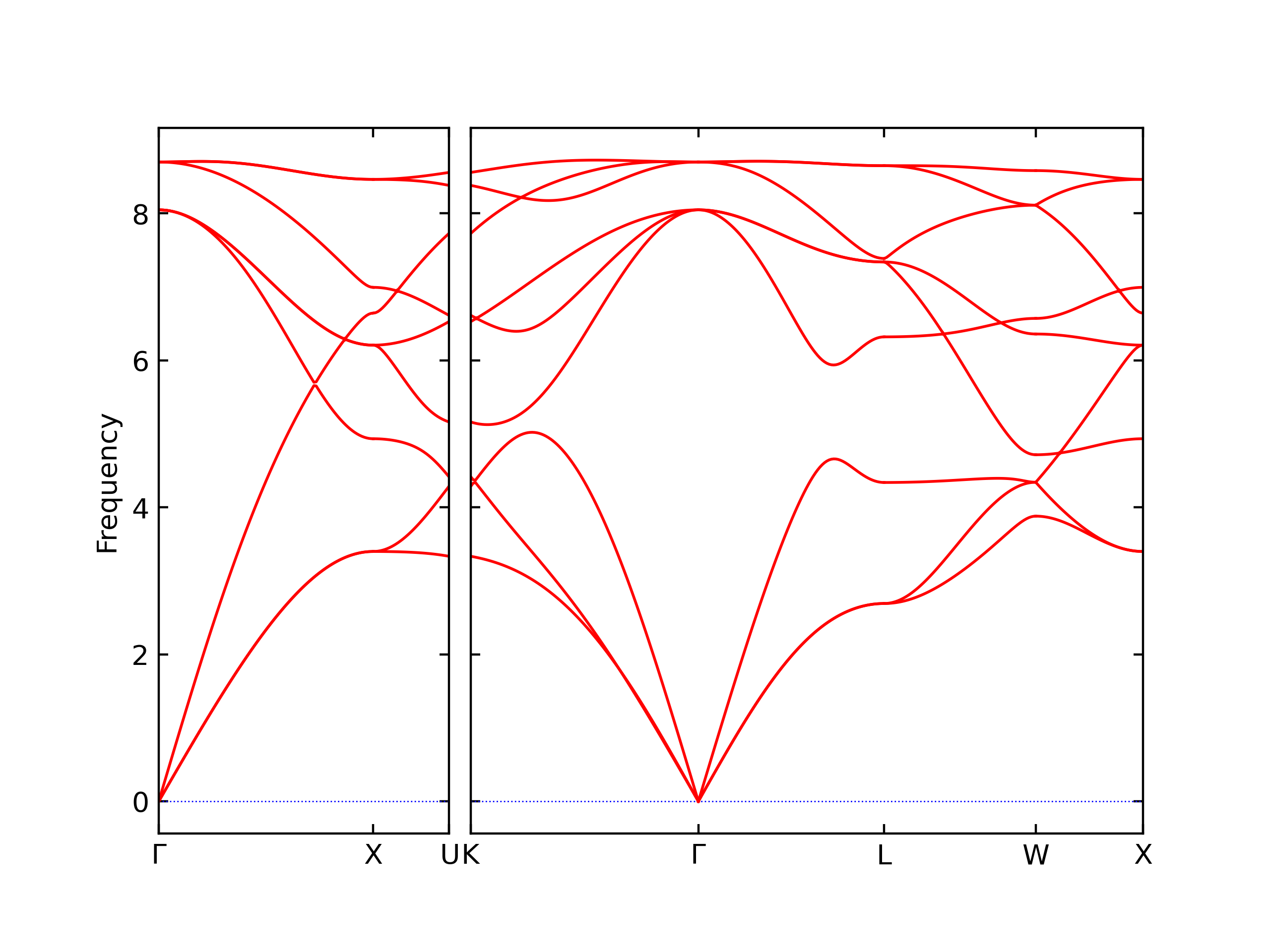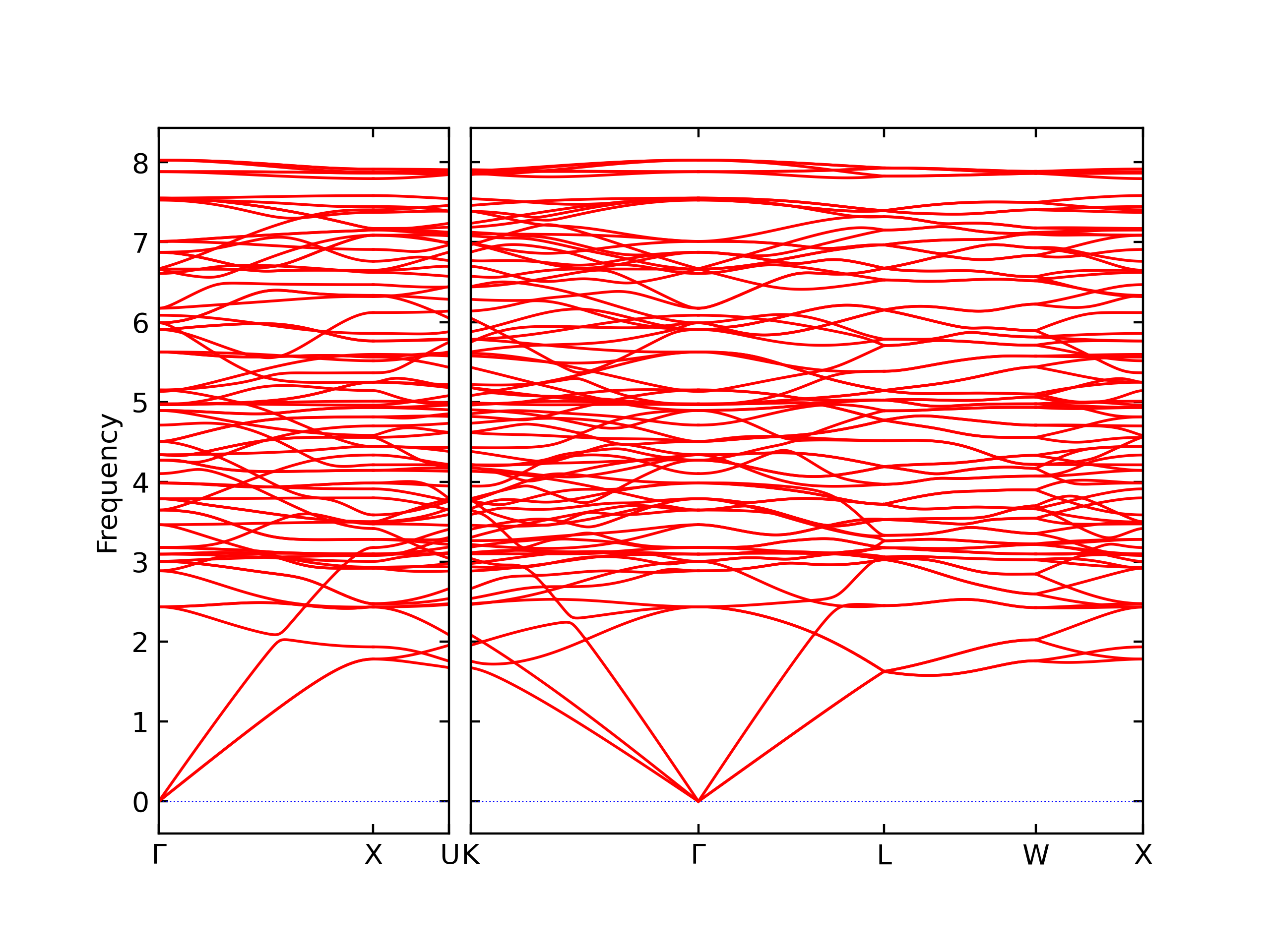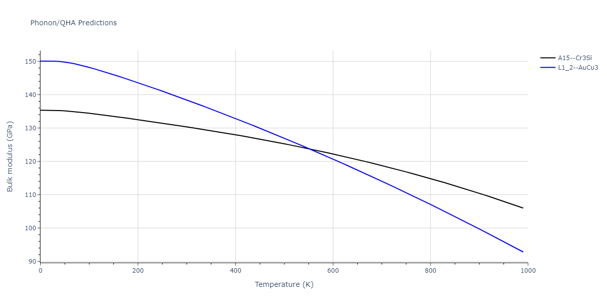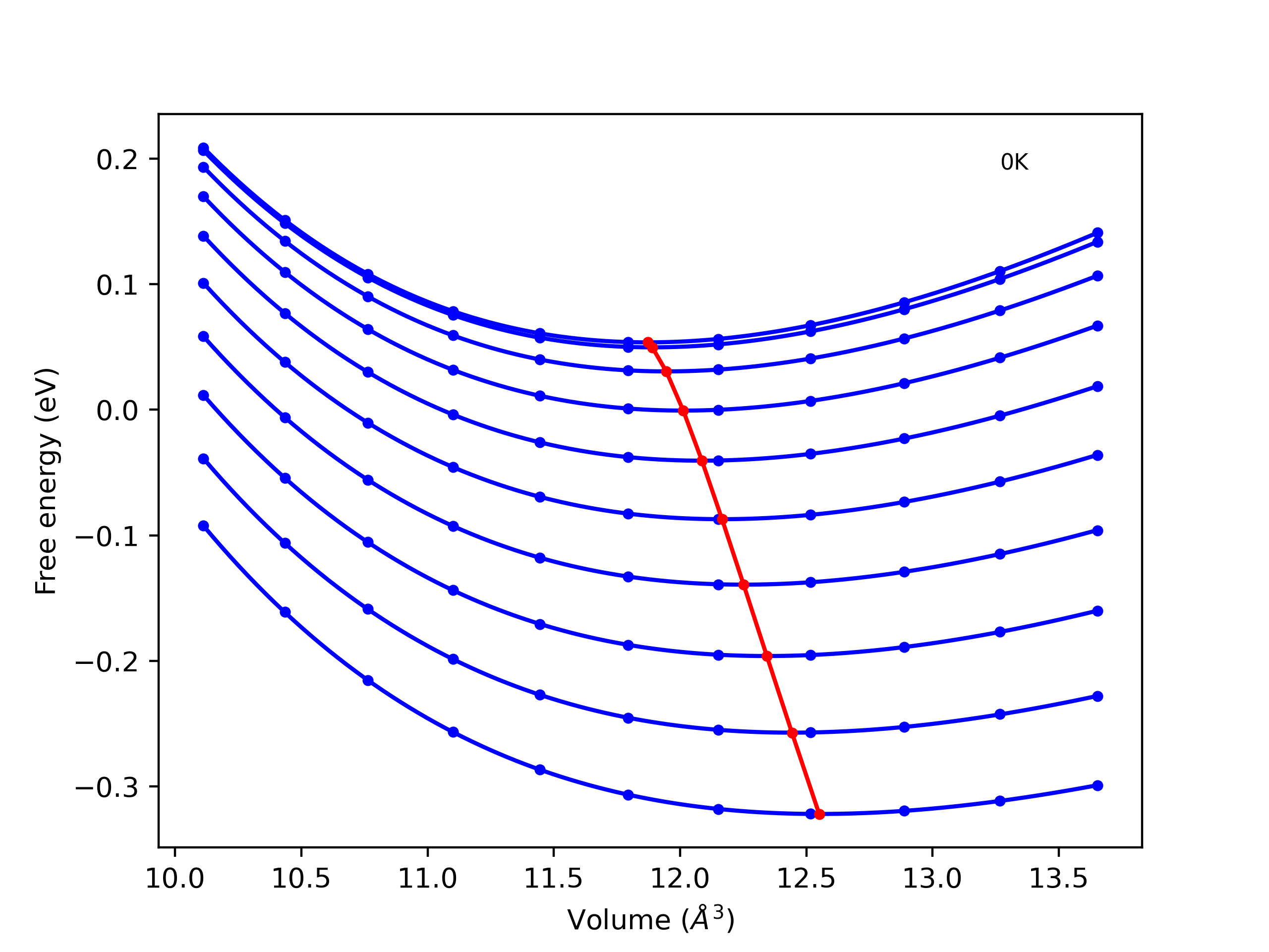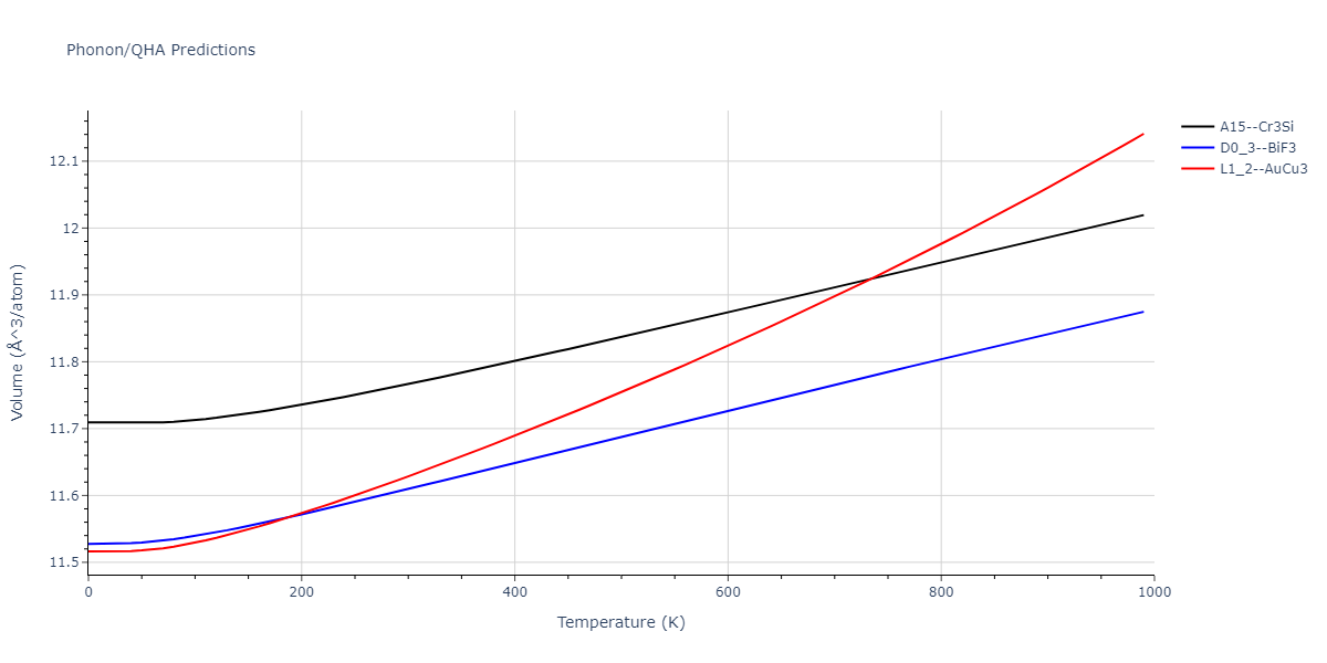 Phonon band structures and crystal properties estimated from quasi-harmonic approximation (QHA) calculations are displayed for select crystals. The calculations were performed using phonopy and LAMMPS. For the phonon calculations, 3x3 supercells of the potential-specific relaxed crystals were used. The QHA calculations were based on 11 strain states ranging from -0.05 to 0.05.