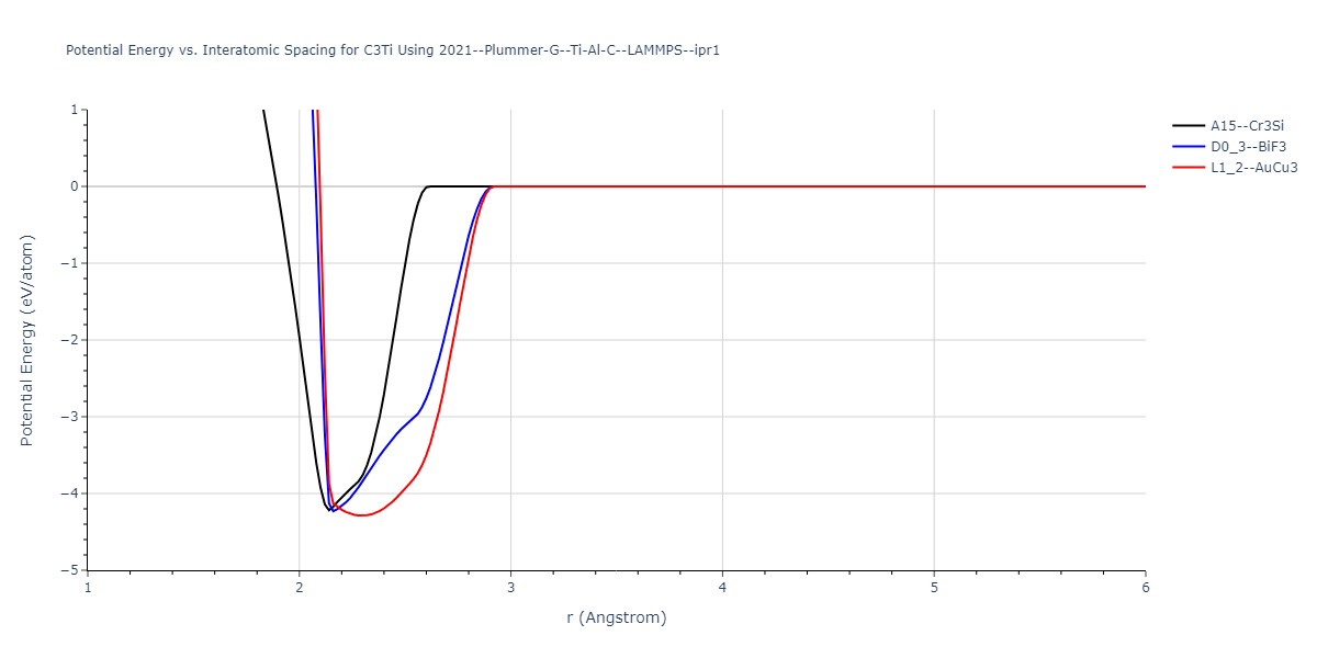Plots of potential energy vs interatomic spacing, r, are shown below for a number of crystal structures. The structures are generated based on the ideal atomic positions and b/a and c/a lattice parameter ratios for a given crystal prototype. The size of the system is then uniformly scaled, and the energy calculated without relaxing the system. To obtain these plots, values of r are evaluated every 0.02 Å up to 6 Å.