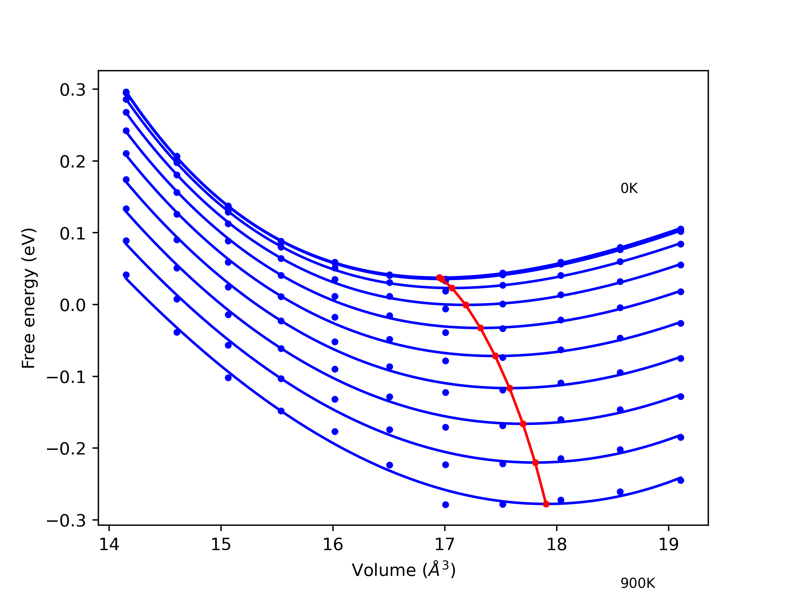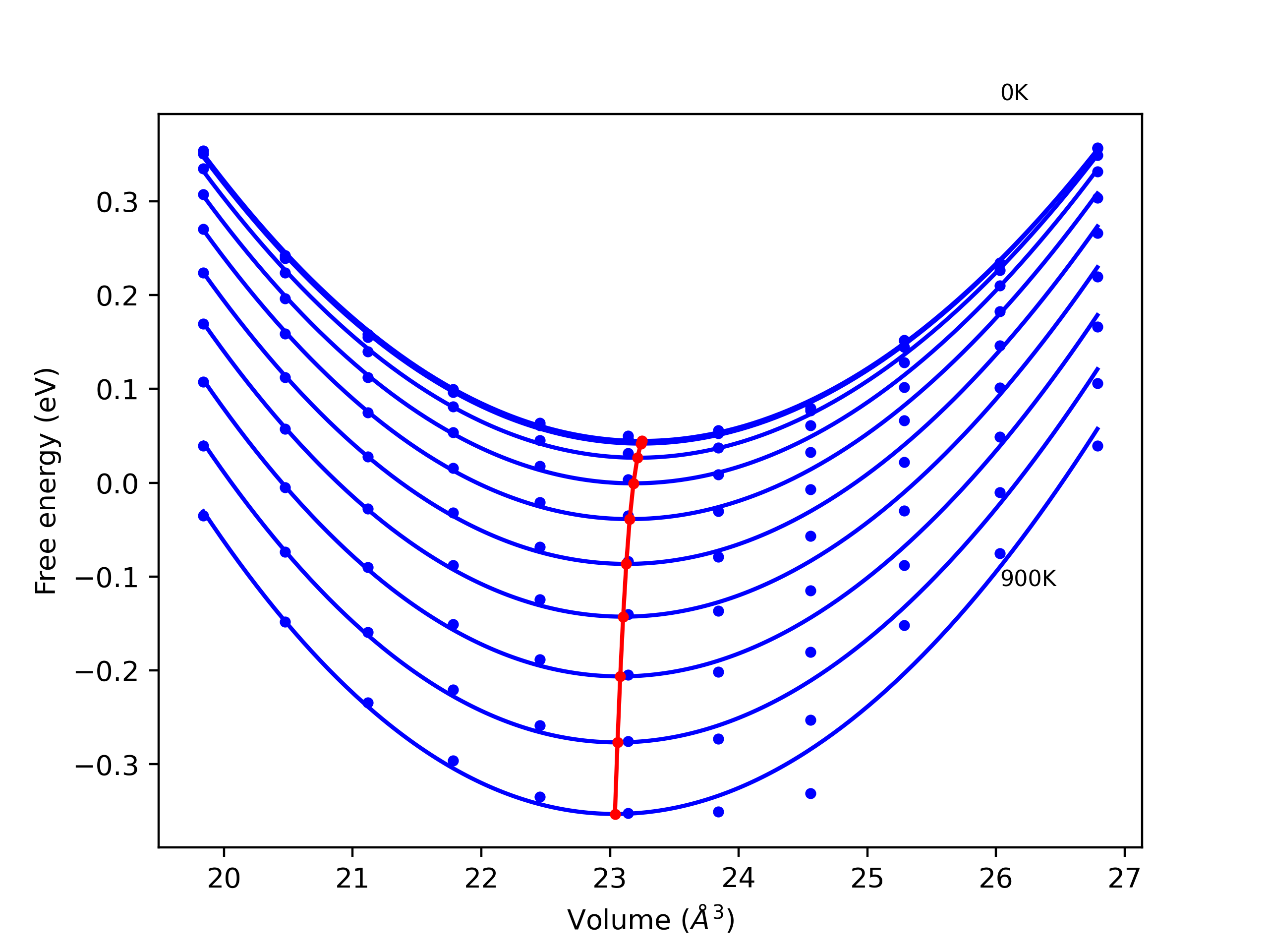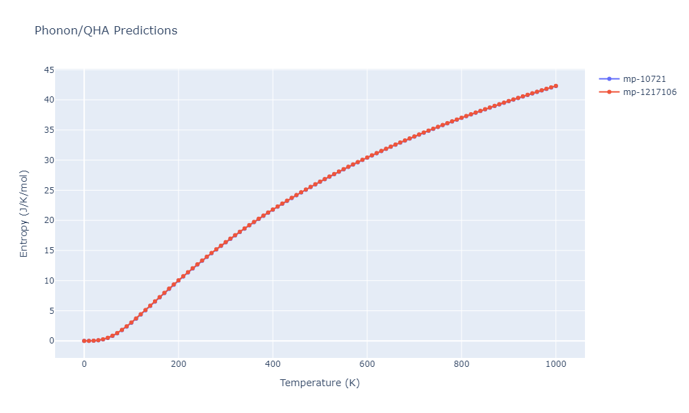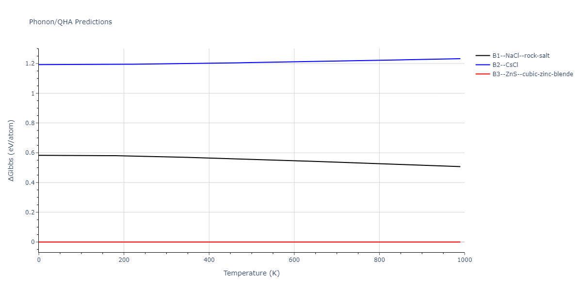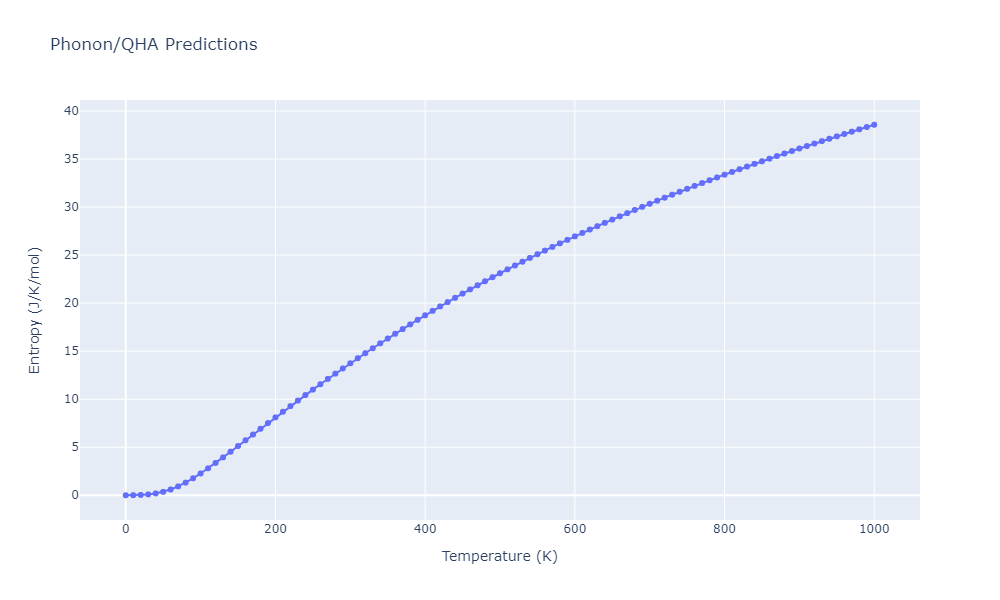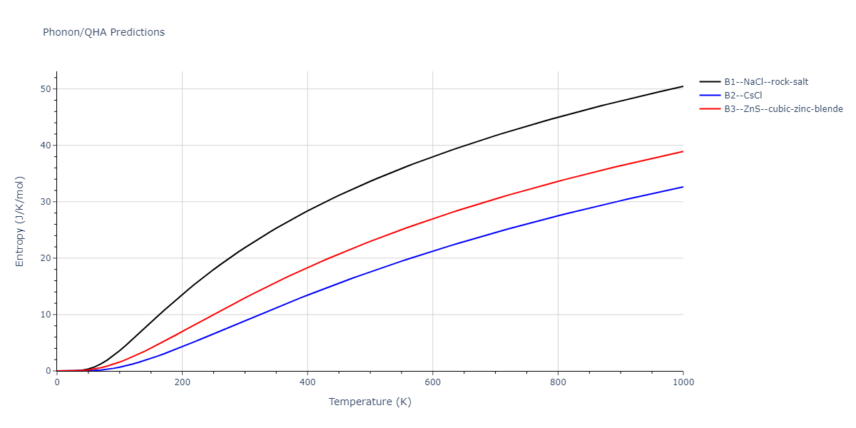 The Gibbs energies of the phases are estimated using thermodynamic integration between the interatomic potential in question and a simpler model with known Gibbs free energy values. For solids, the reference model is an Einstein solid, while for liquids it is the Uhlenbeck-Ford potential. Besides a short run at the start of the solid calculations to estimate Einstein model spring constants, the two calculations proceed similarly. Starting with the final relaxation configurations, the systems are stabilized for 25,000 steps. Then, over the next 50,000 steps the potential is swapped out for the reference potential. The system is then stabilized for another 25,000 steps with the reference model before a reverse swap of 50,000 steps is performed. The simulation ends with one final 25,000 step stabilization period. From the simulation, the irreversible work of transformation is estimated and used to compute the absolute Gibbs free energy of the target phase and potential relative to the reference potential. Entropy is estimated as the difference in enthalpy and Gibbs free energy and divided by temperature.