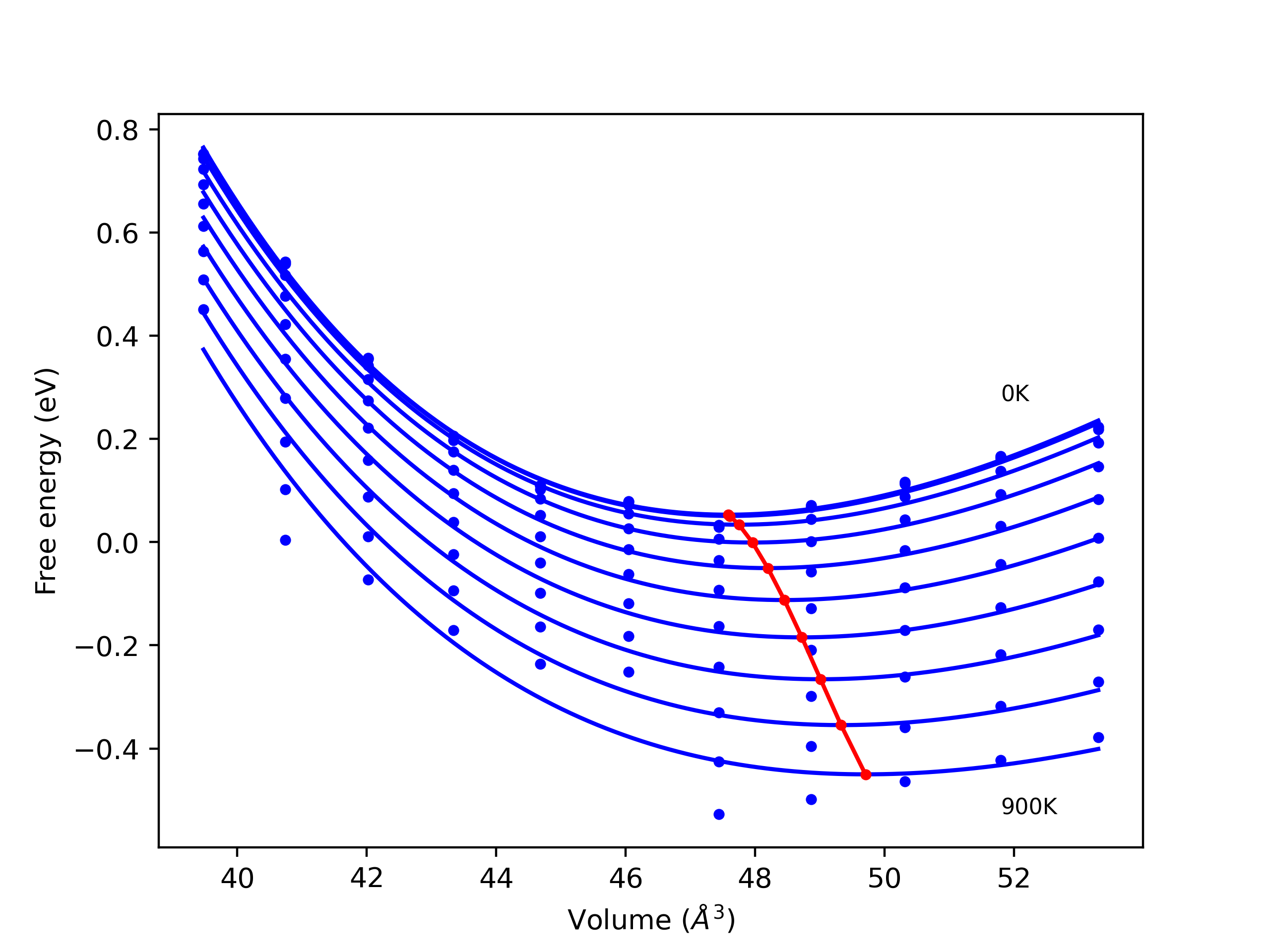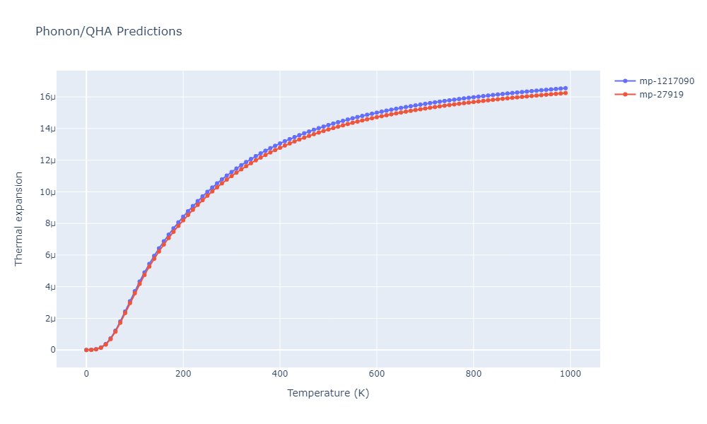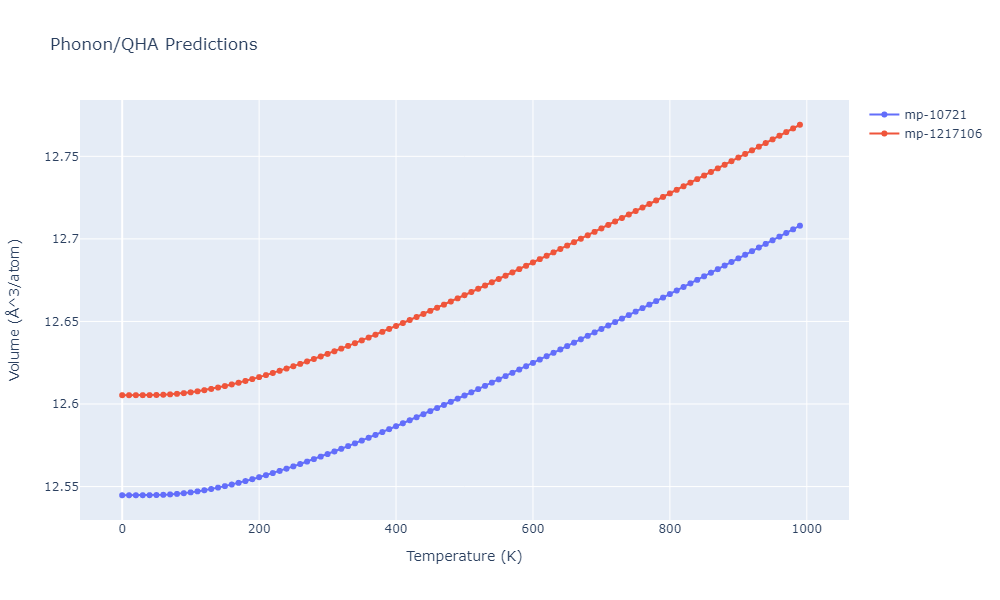 Plots of lattice and elastic constants are shown as a function of temperature. The 0K points were taken from the Crystal Structure Predictions and the Elastic Constants Predictions sections above for the unique crystal structures relaxed with the "dynamic" method. Starting from the 0 K relaxed crystal unit cells, supercell systems are created by replicating all three dimensions by the same multiplier to achieve at least 4000 atoms. The systems are then relaxed at 50 K and zero pressure using 1 million NPT steps. Lattice constants are estimated by averaging the measured box dimensions. Temperatures are iteratively increased by 50 K, with each subsequent relaxation calculation starting from the final atomic configuration at the previous temperature and relaxing for another 1 million steps.