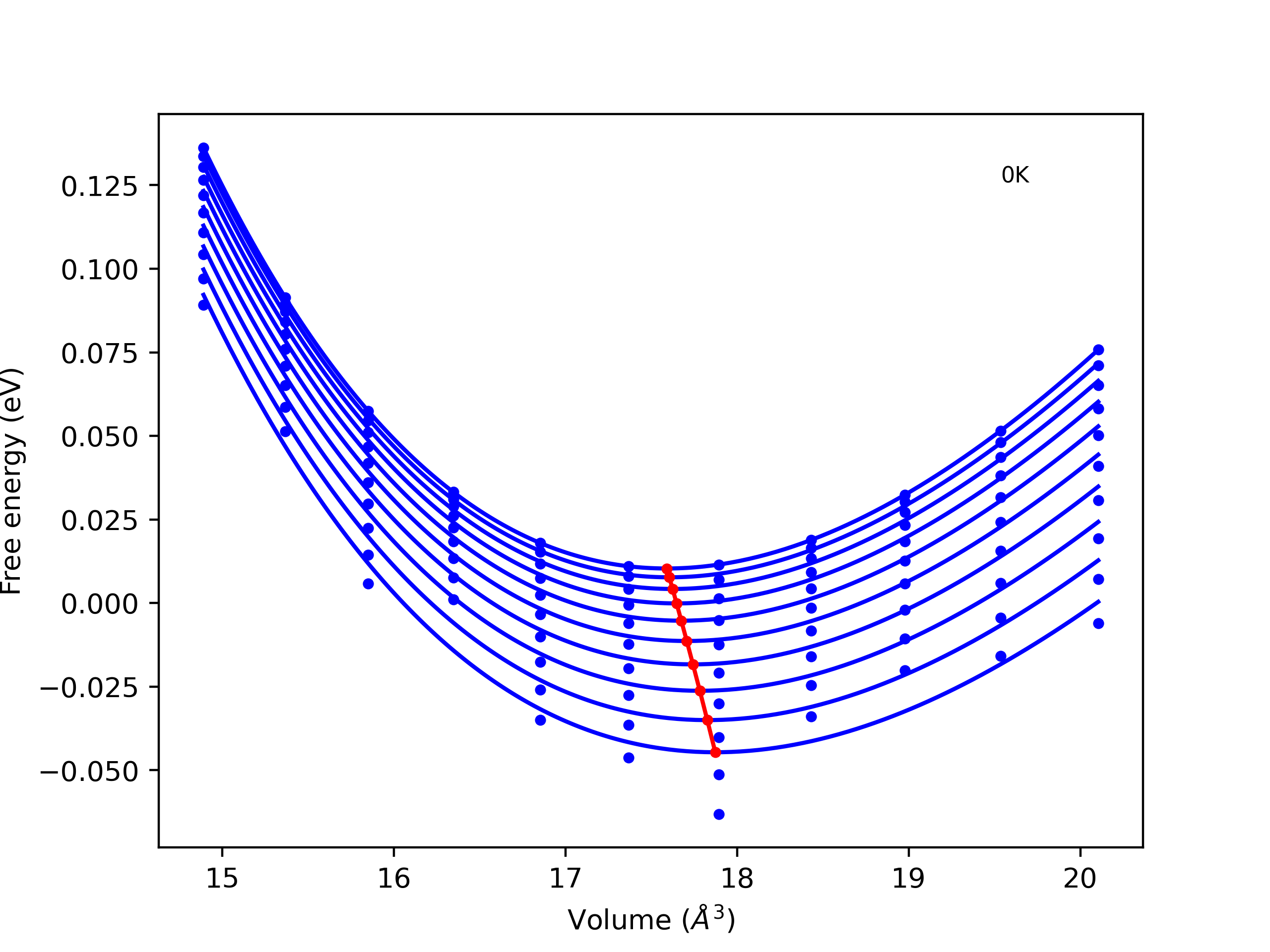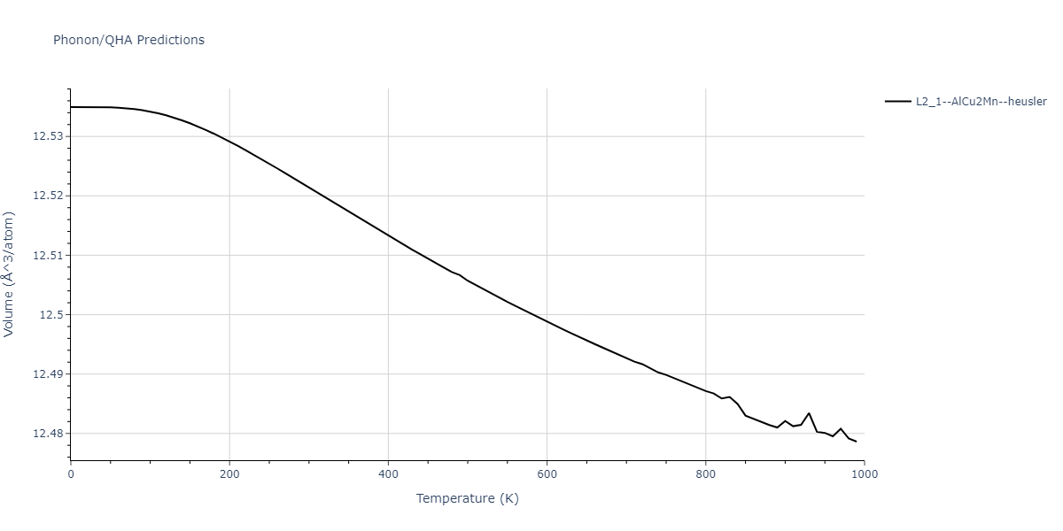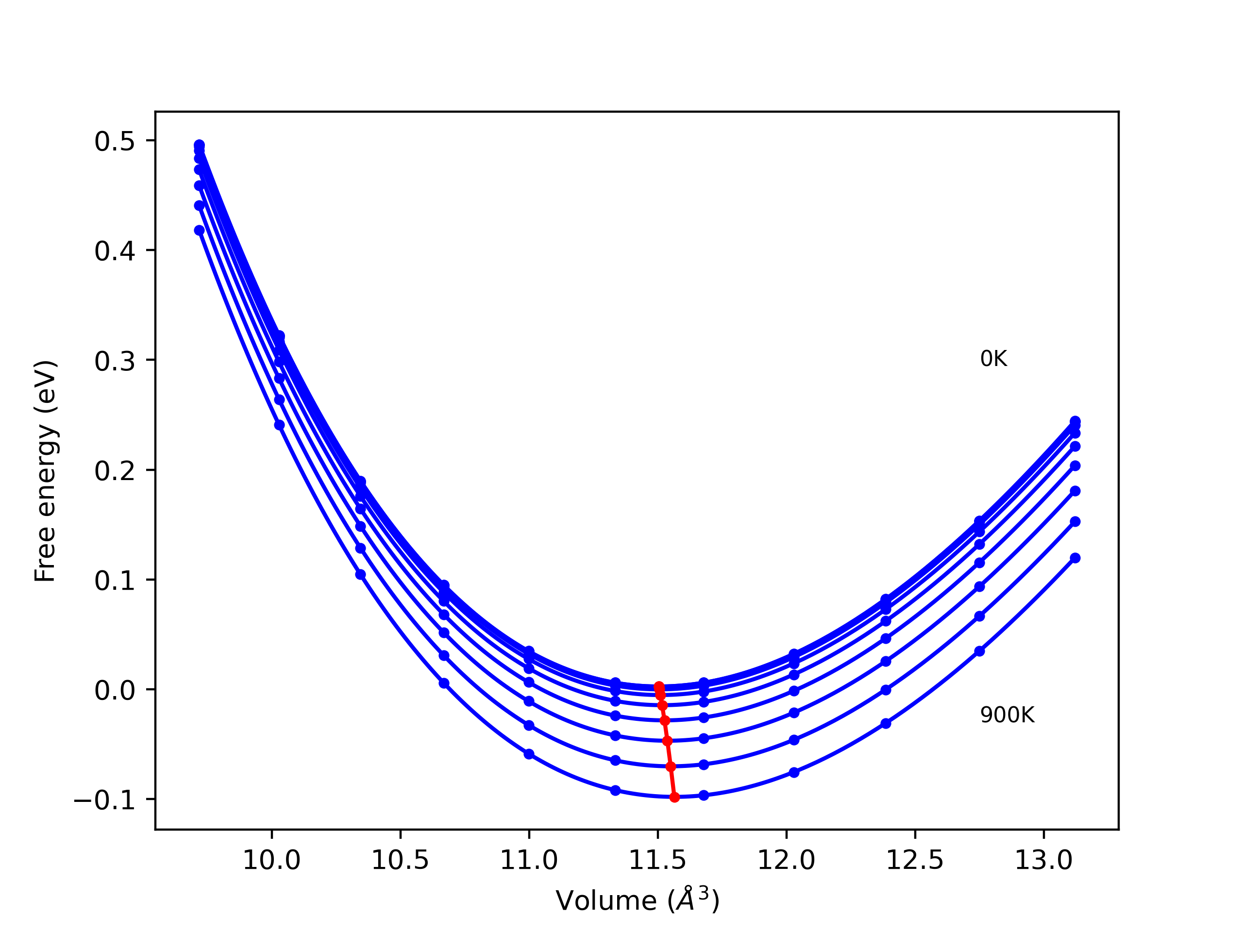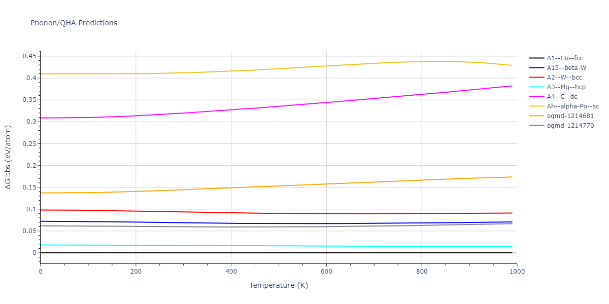 Plots of internal energy, Gibbs free energy, entropy, heat capacity and volume are shown here as a function of temperature for various crystal structures and liquid phases. The included crystal structures correspond to those in the Solid Structures vs. Temperature section, and the liquid phases to those in the Liquid Properties section. Internal energy and volume are taken from the associated structure relaxations mentioned in those previous sections. Constant pressure heat capacity is estimated using 3-point numerical derivatives of enthalpy versus temperature. Note that since all simulations done here are at 0 pressure, internal energy and enthalpy are equivalent.