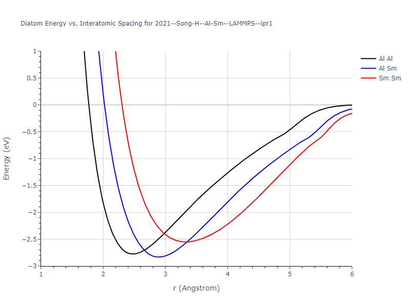 Plots of the potential energy vs interatomic spacing, r, are shown below for all diatom sets associated with the interatomic potential. This calculation provides insights into the functional form of the potential's two-body interactions. A system consisting of only two atoms is created, and the potential energy is evaluated for the atoms separated by 0.02 Å <= r <= 6.0> Å in intervals of 0.02 Å. Two plots are shown: one for the "standard" interaction distance range, and one for small values of r. The small r plot is useful for determining whether the potential is suitable for radiation studies.