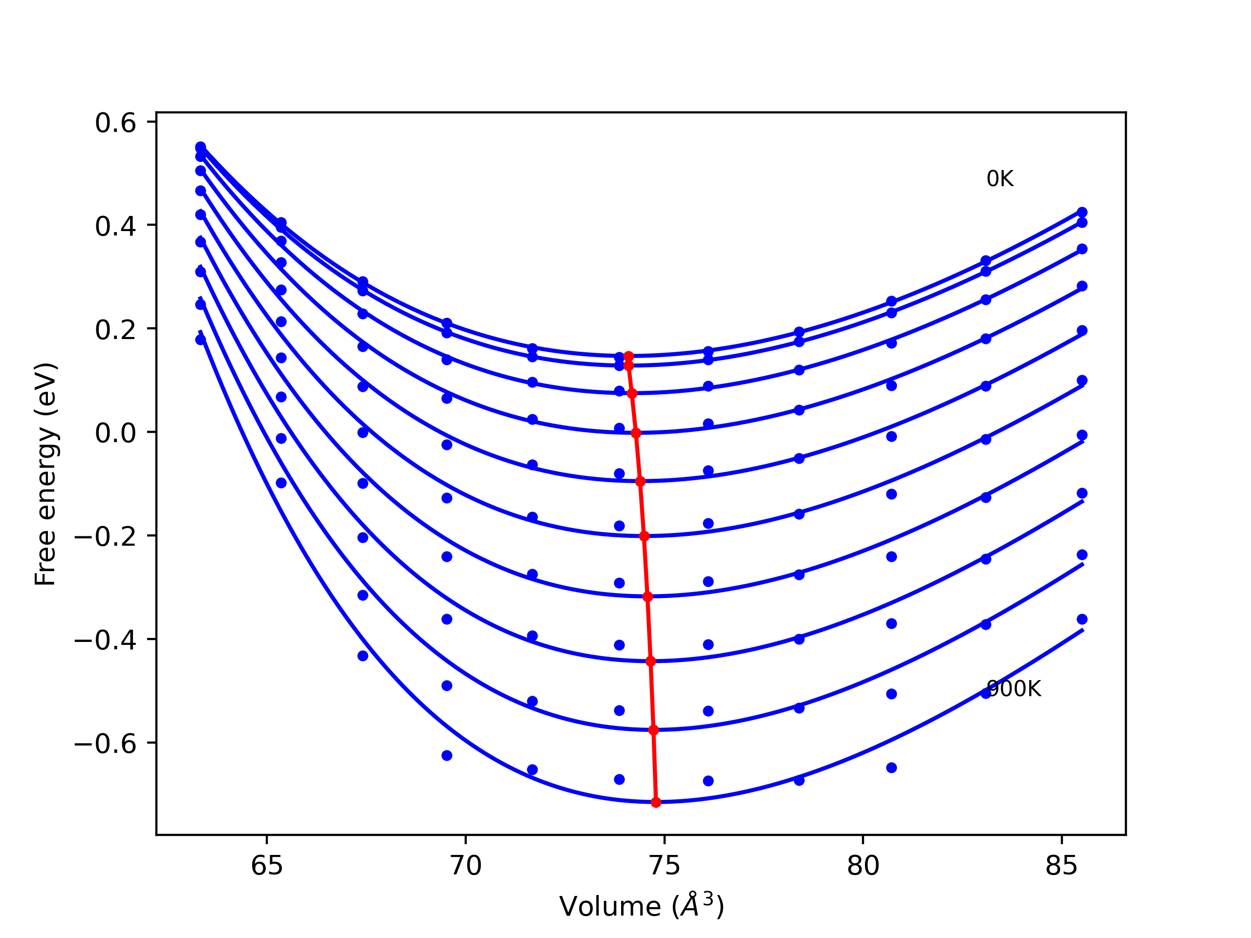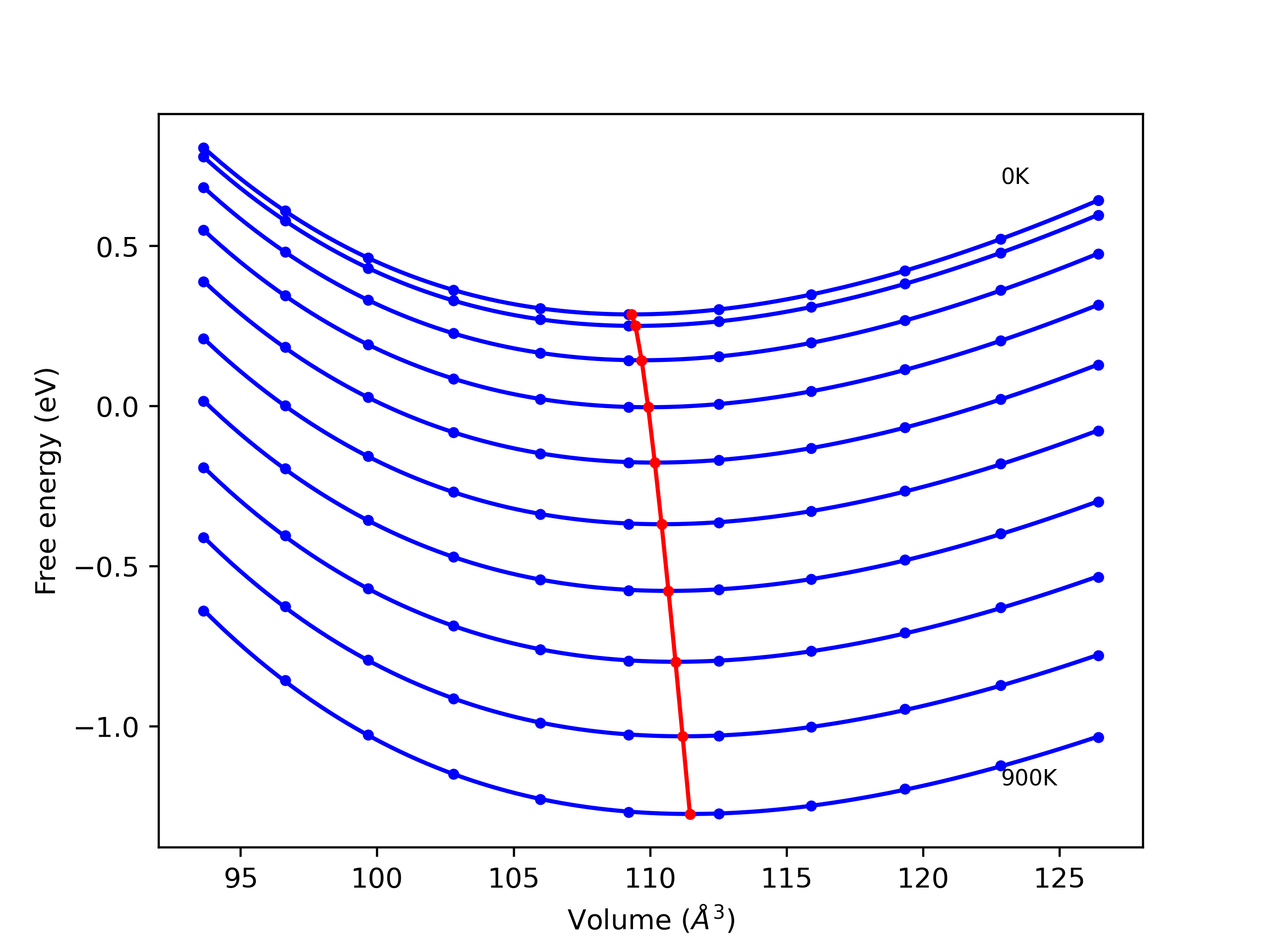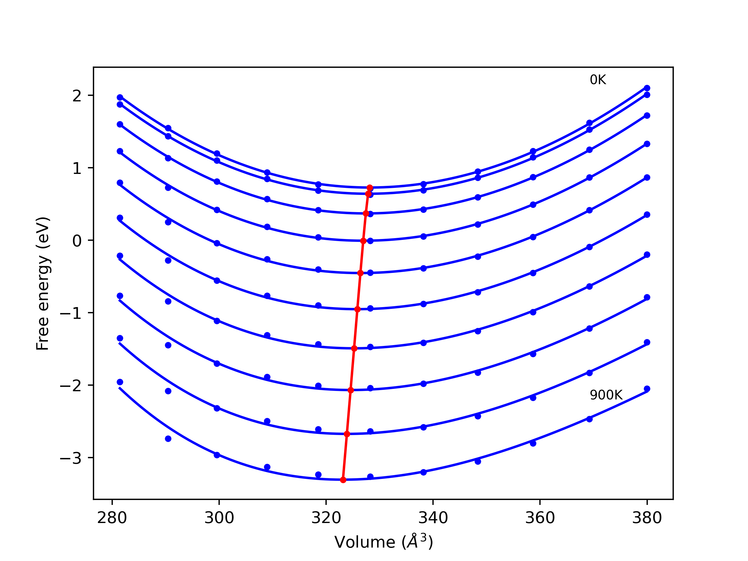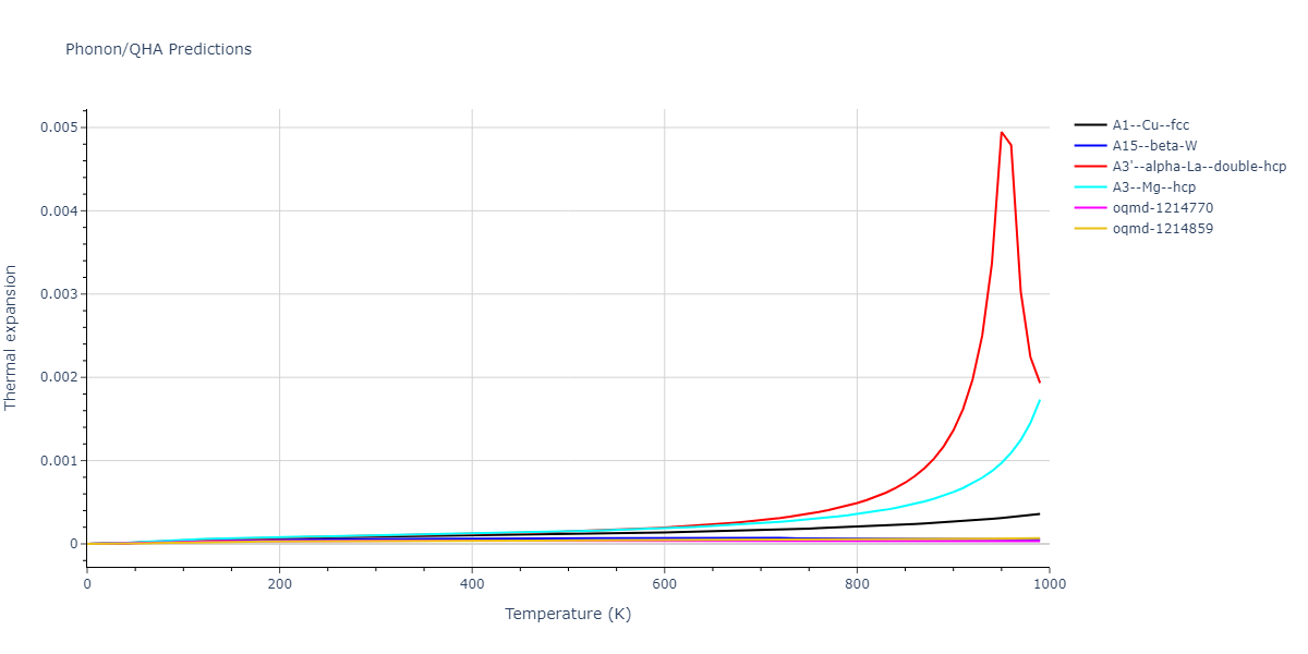 Phonon band structures and crystal properties estimated from quasi-harmonic approximation (QHA) calculations are displayed for select crystals. The calculations were performed using phonopy and LAMMPS. For the phonon calculations, 3x3 supercells of the potential-specific relaxed crystals were used. The QHA calculations were based on 11 strain states ranging from -0.05 to 0.05.