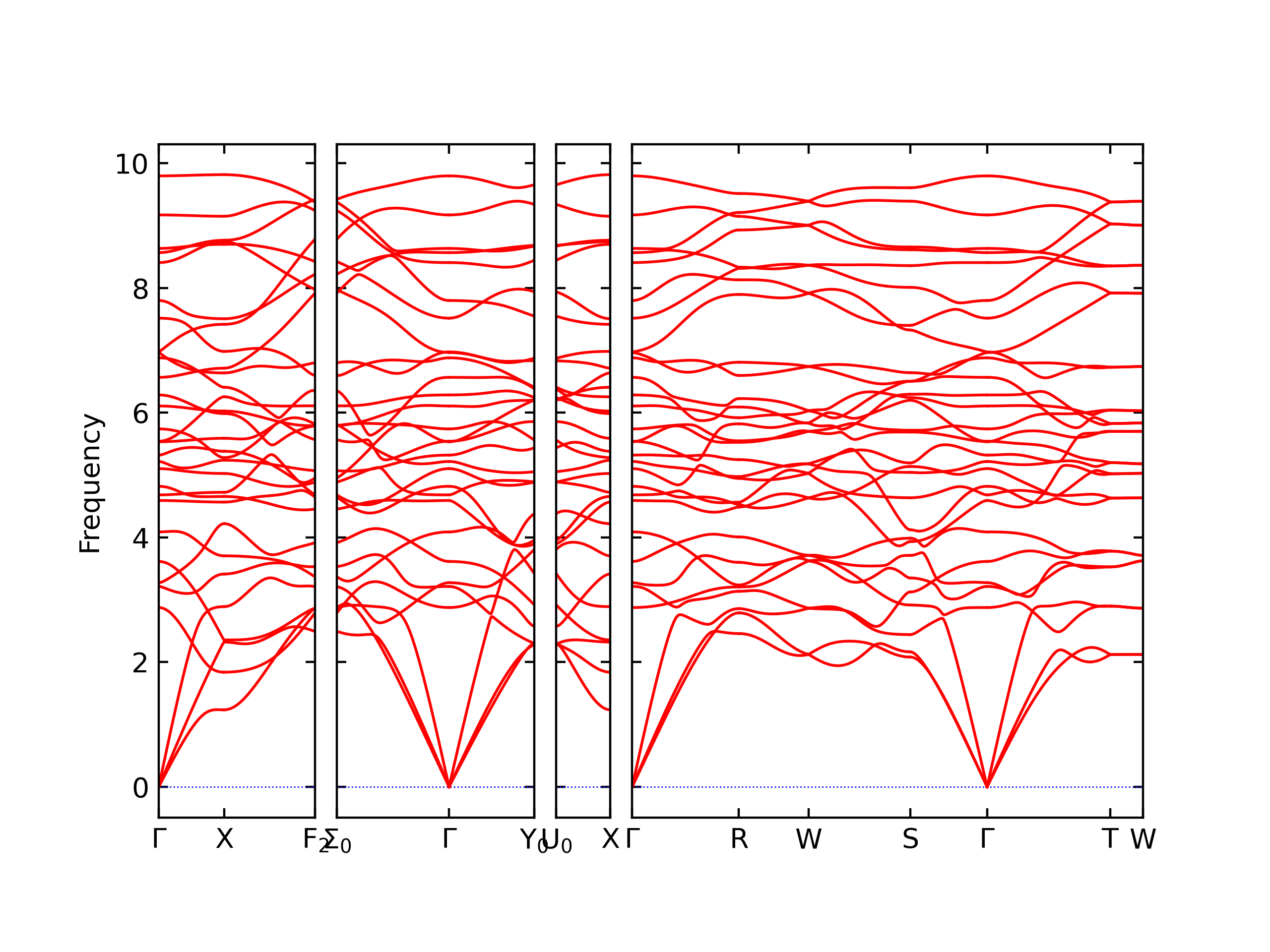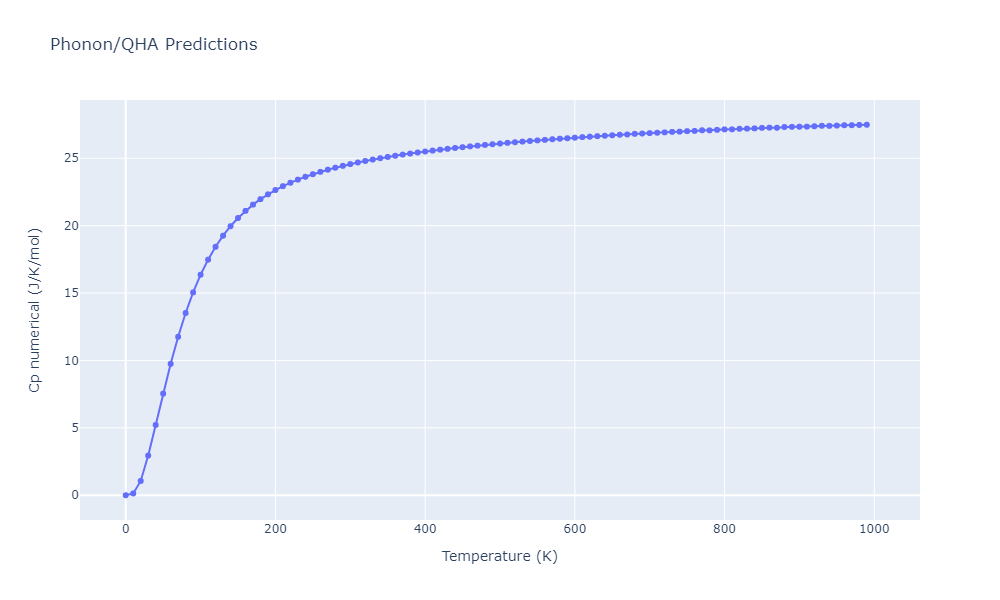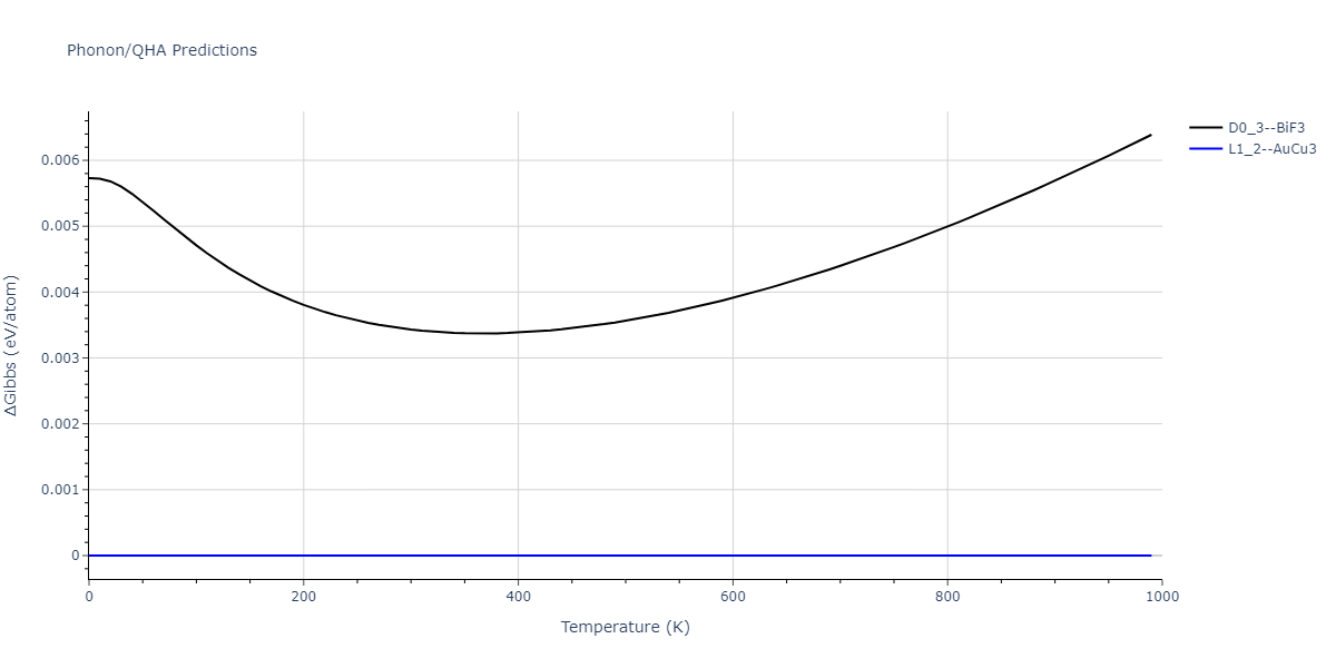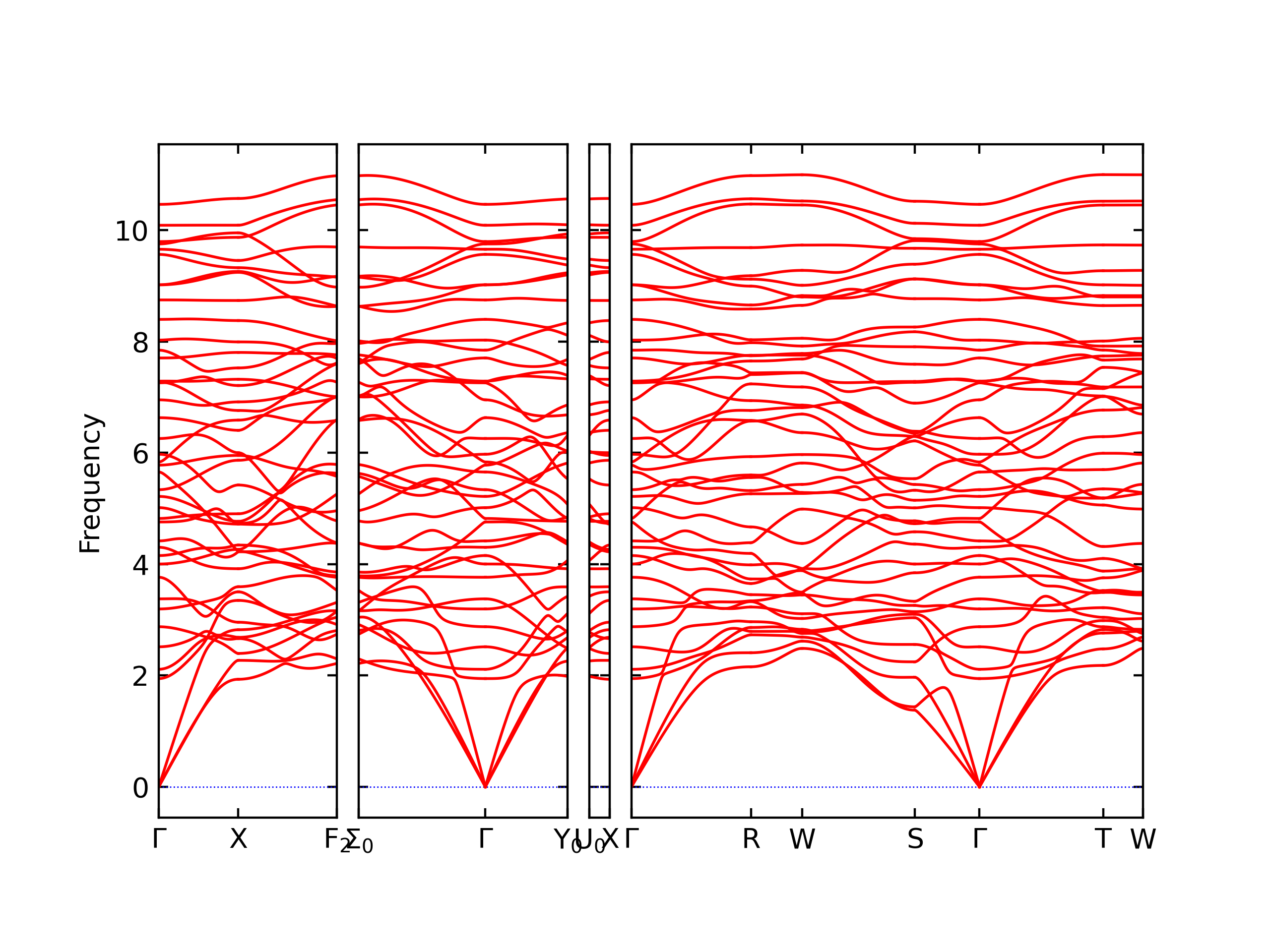 Phonon band structures and crystal properties estimated from quasi-harmonic approximation (QHA) calculations are displayed for select crystals. The calculations were performed using phonopy and LAMMPS. For the phonon calculations, 3x3 supercells of the potential-specific relaxed crystals were used. The QHA calculations were based on 11 strain states ranging from -0.05 to 0.05.