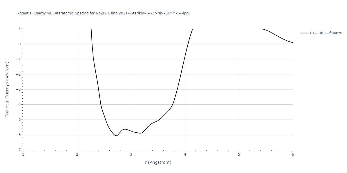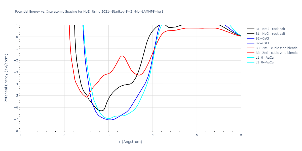 Plots of potential energy vs interatomic spacing, r, are shown below for a number of crystal structures. The structures are generated based on the ideal atomic positions and b/a and c/a lattice parameter ratios for a given crystal prototype. The size of the system is then uniformly scaled, and the energy calculated without relaxing the system. To obtain these plots, values of r are evaluated every 0.02 Å up to 6 Å.