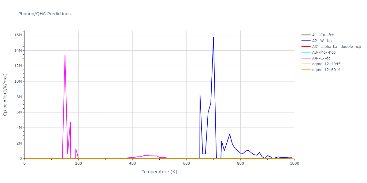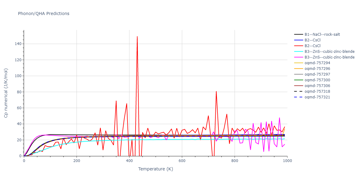 Plots of internal energy, Gibbs free energy, entropy, heat capacity and volume are shown here as a function of temperature for various crystal structures and liquid phases. The included crystal structures correspond to those in the Solid Structures vs. Temperature section, and the liquid phases to those in the Liquid Properties section. Internal energy and volume are taken from the associated structure relaxations mentioned in those previous sections. Constant pressure heat capacity is estimated using 3-point numerical derivatives of enthalpy versus temperature. Note that since all simulations done here are at 0 pressure, internal energy and enthalpy are equivalent.