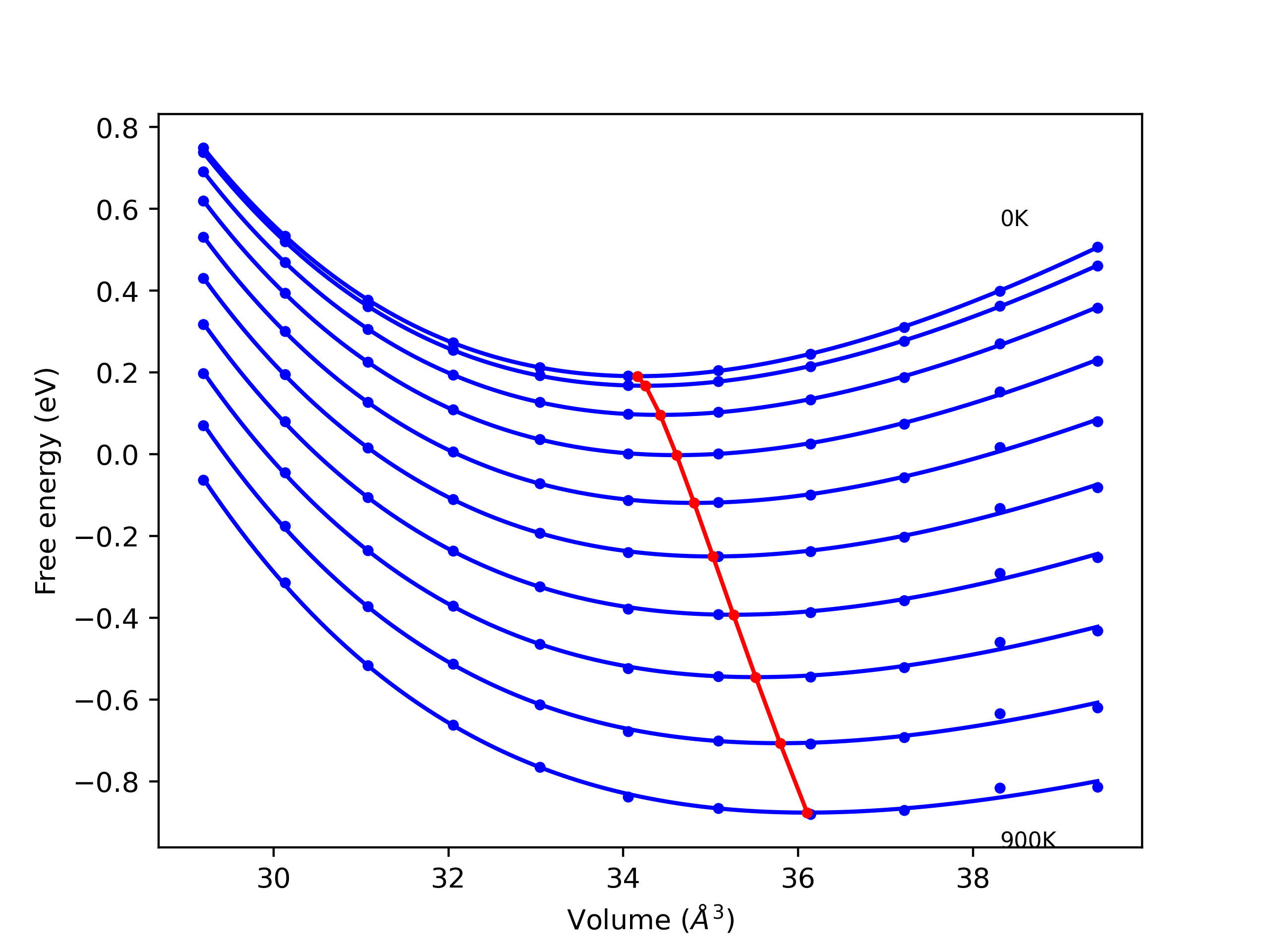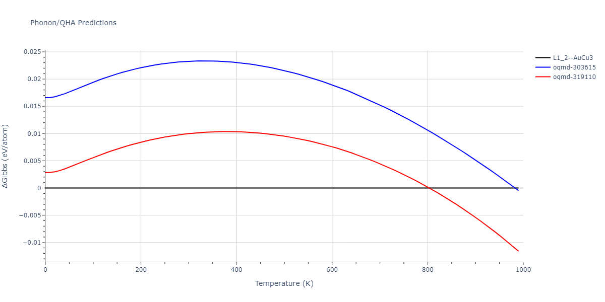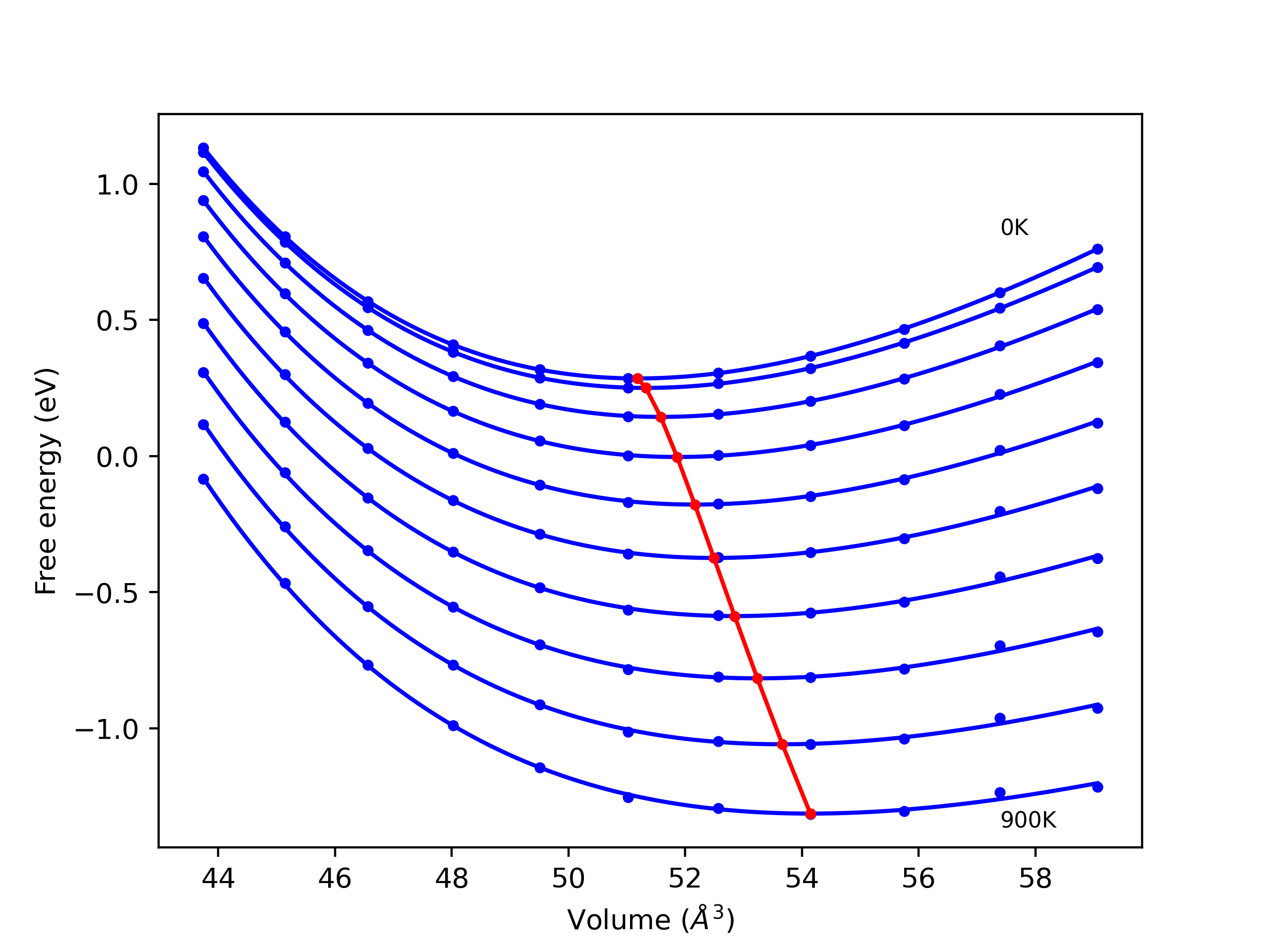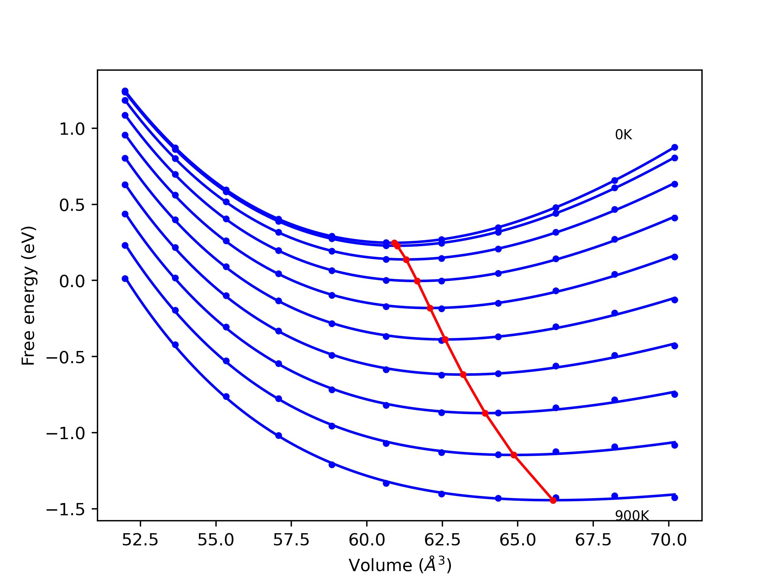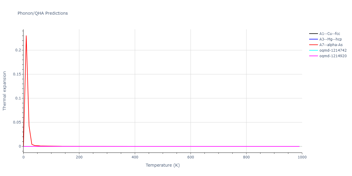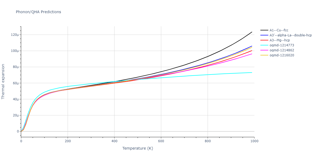 Phonon band structures and crystal properties estimated from quasi-harmonic approximation (QHA) calculations are displayed for select crystals. The calculations were performed using phonopy and LAMMPS. For the phonon calculations, 3x3 supercells of the potential-specific relaxed crystals were used. The QHA calculations were based on 11 strain states ranging from -0.05 to 0.05.